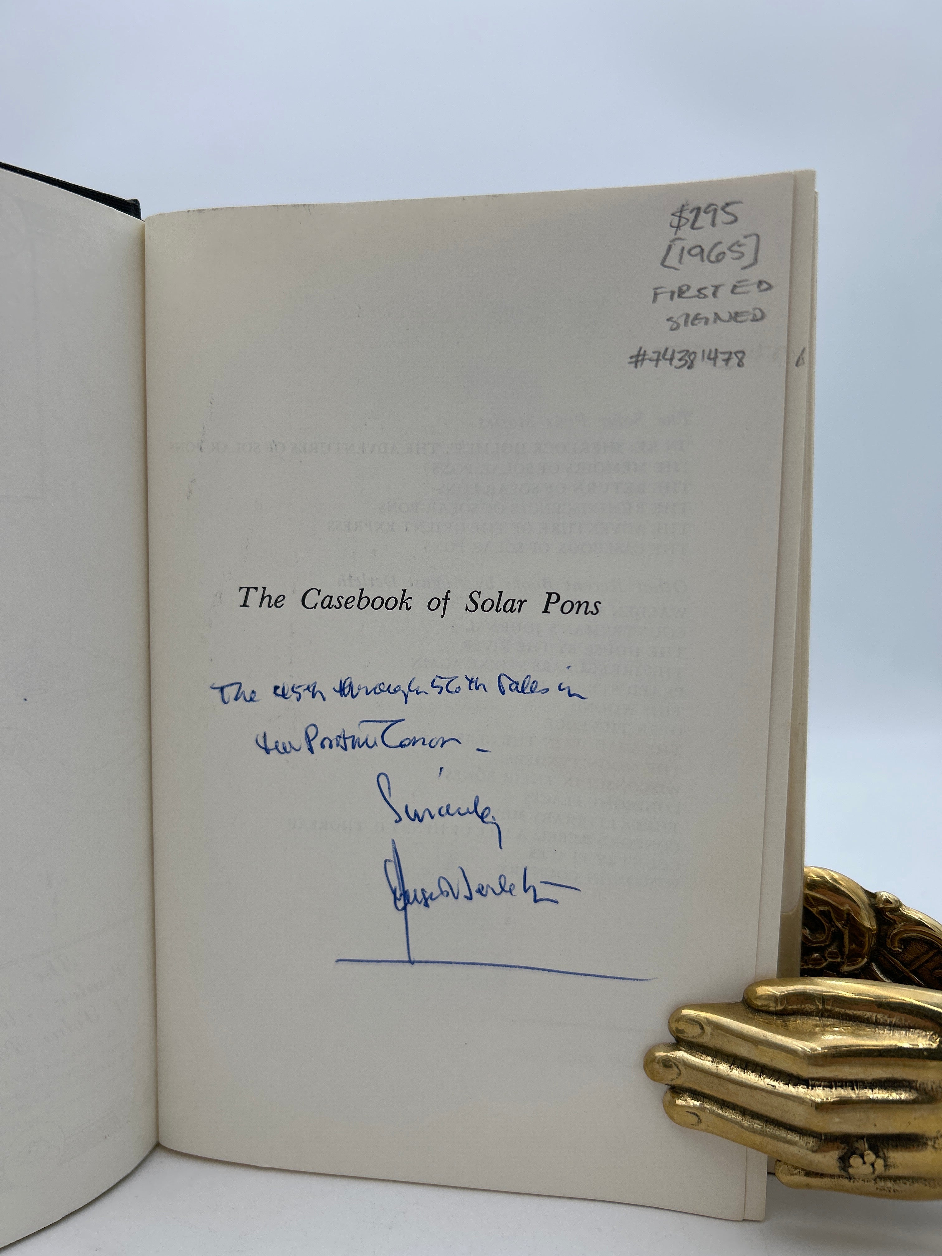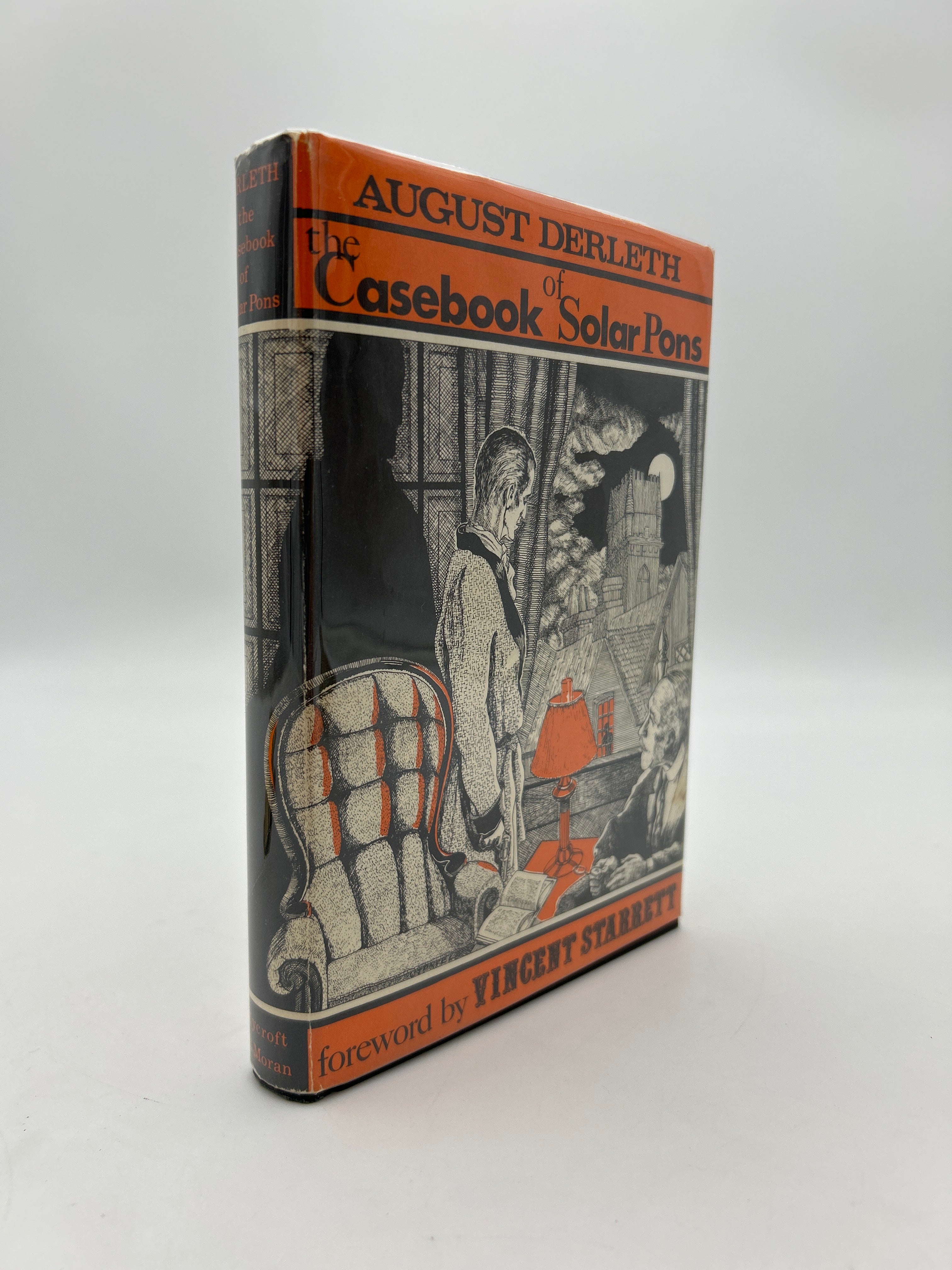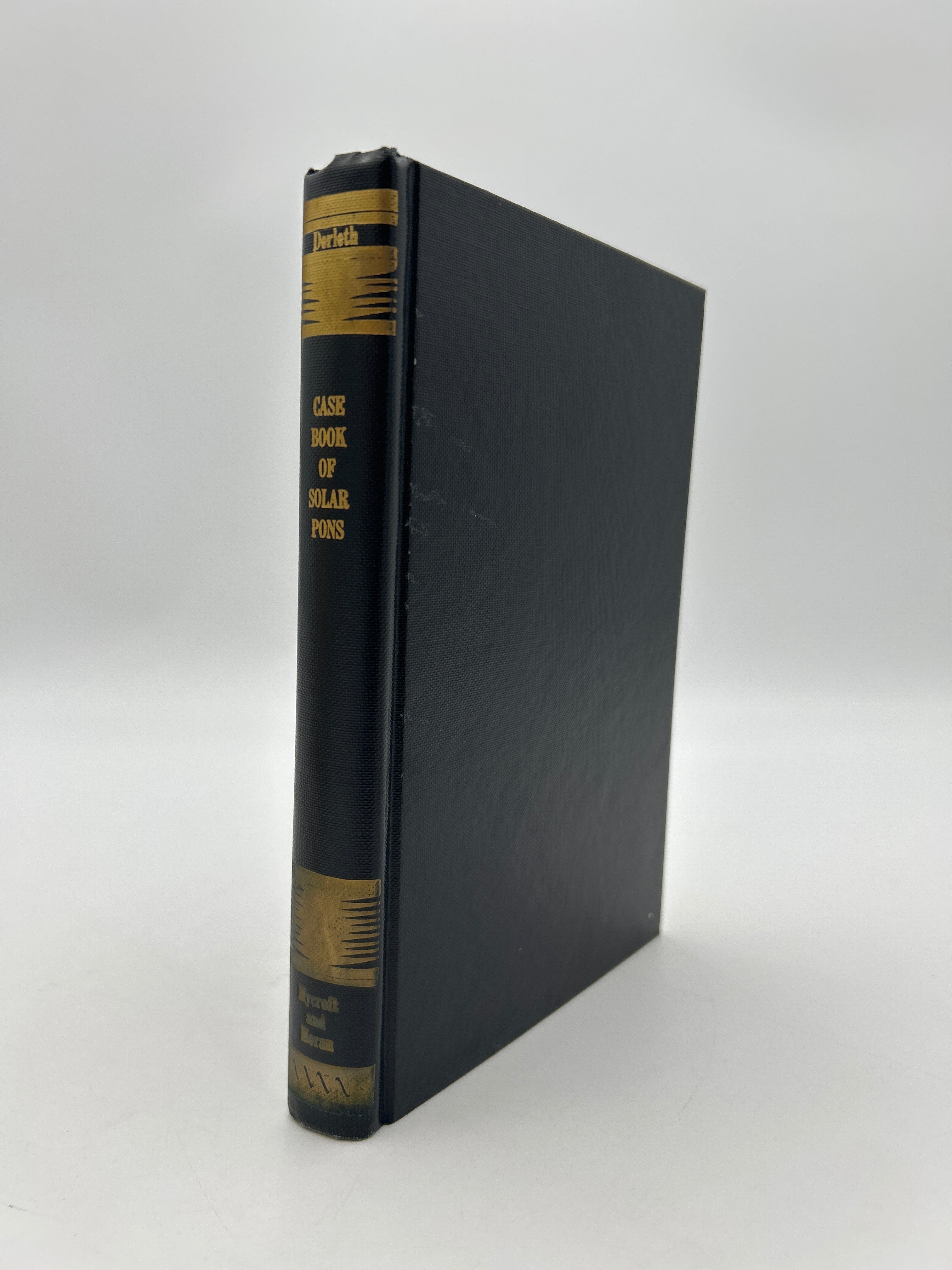 Black cloth binding with original dust jacket designed by Frank Utpatel. Volume Five of the Solar Pons tales and one of 3020 first editions. Minor discoloration to dust jacket on the verso and spine. Unclipped. Signed with inscription: “The 45th through 56th tales in the Ponsian Canon. August Derleth”.