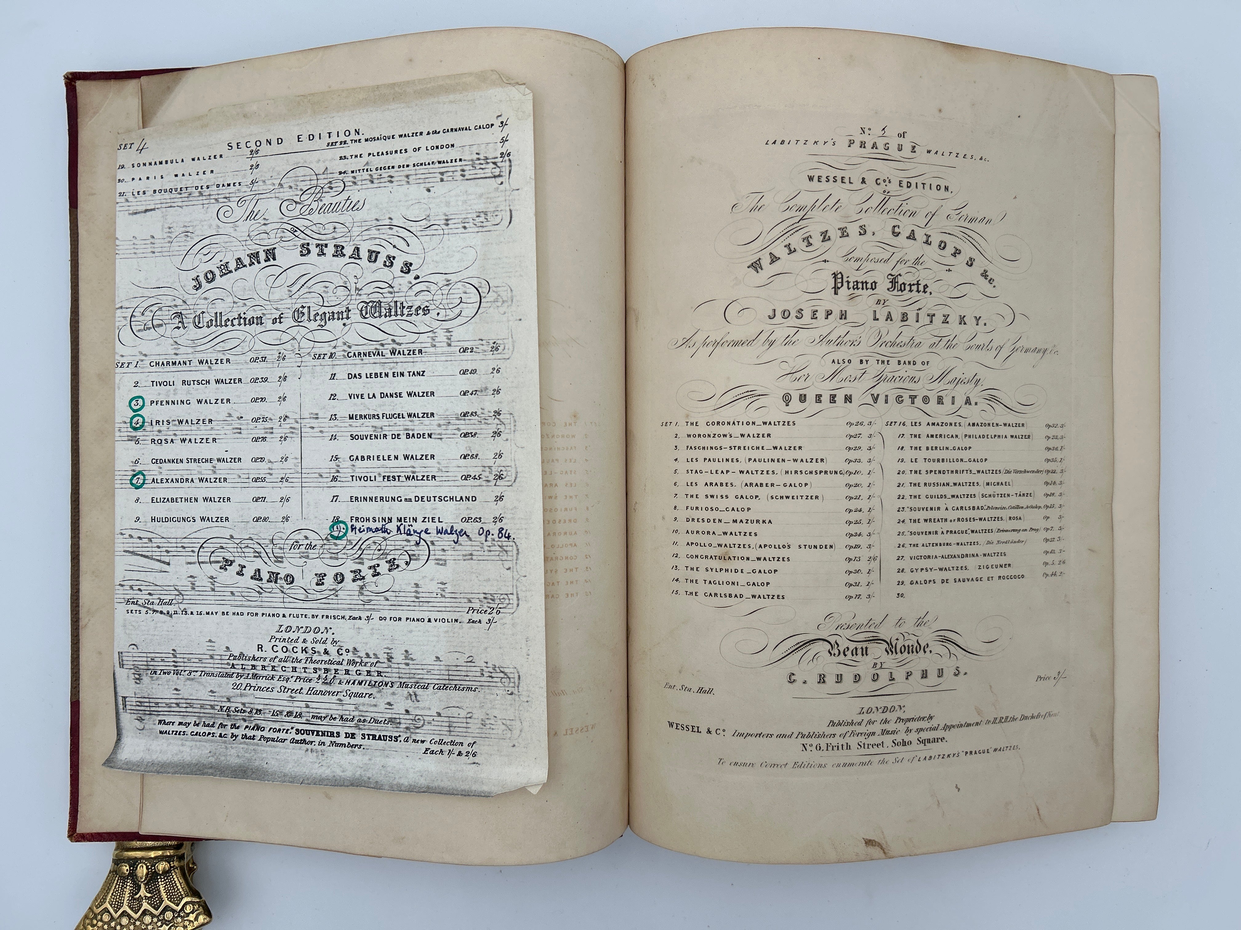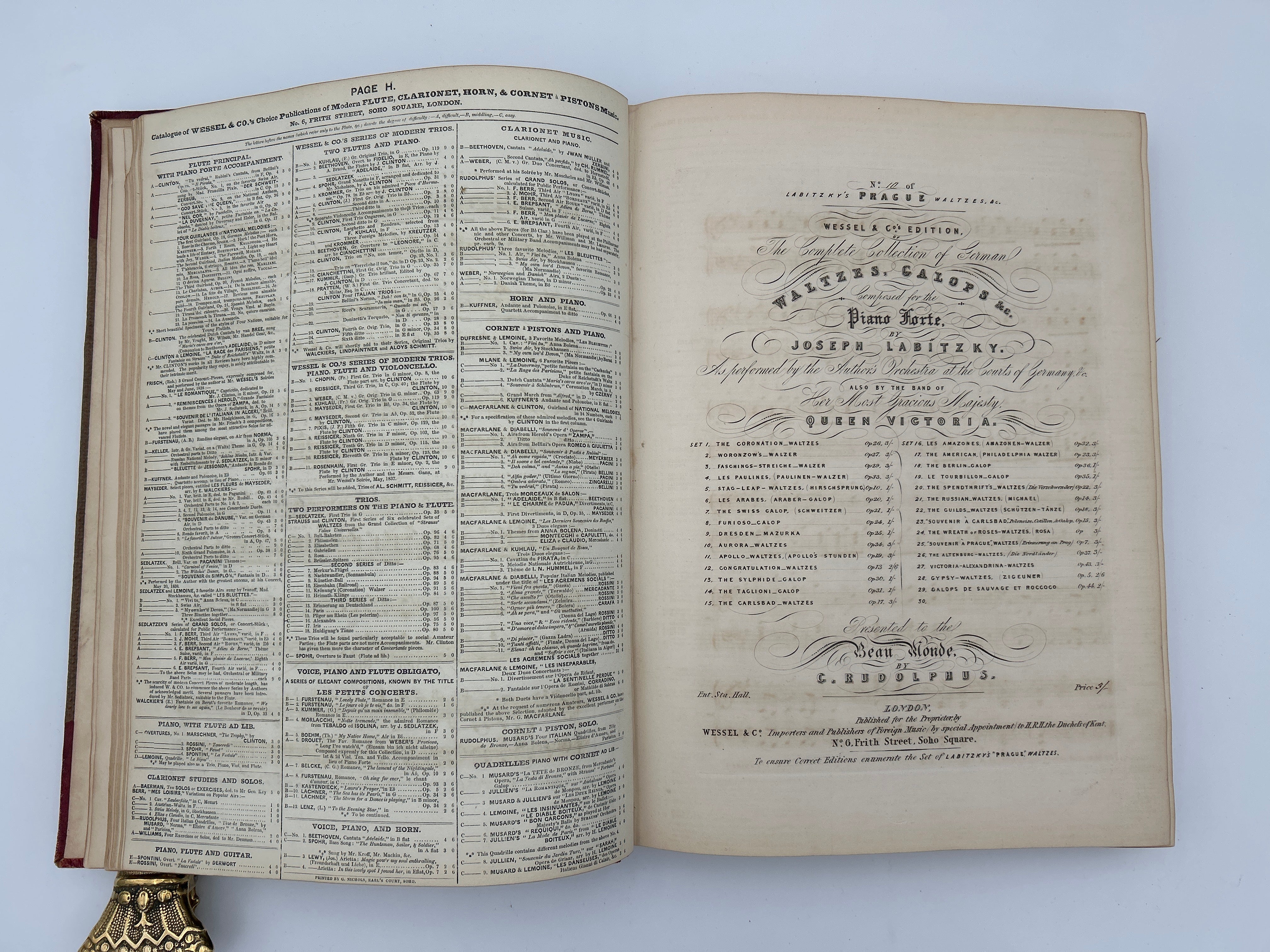 Large brown and red binding with gold tooling on spine, title plate Waltzes by Labitzky, Lanner, Strauss, some rubbing, intact, good condition