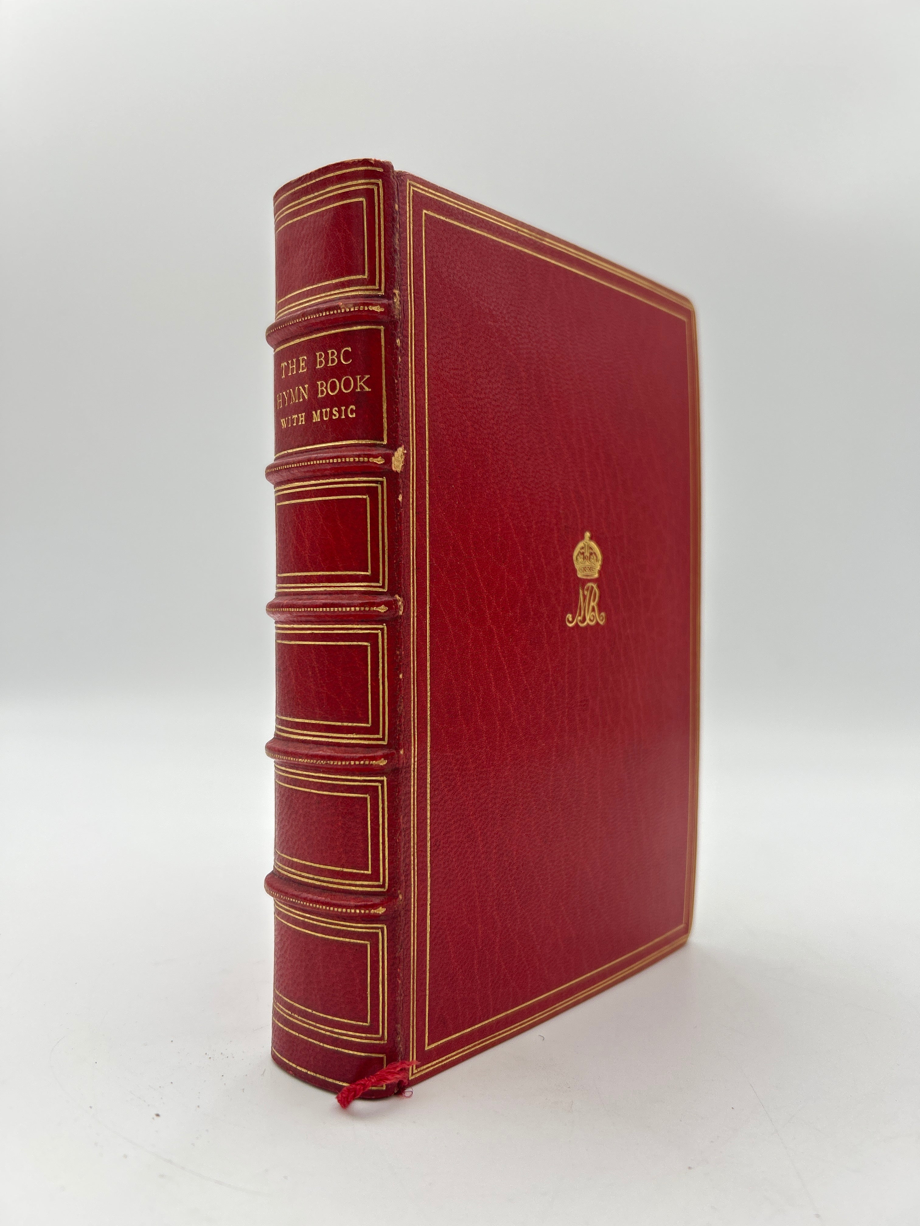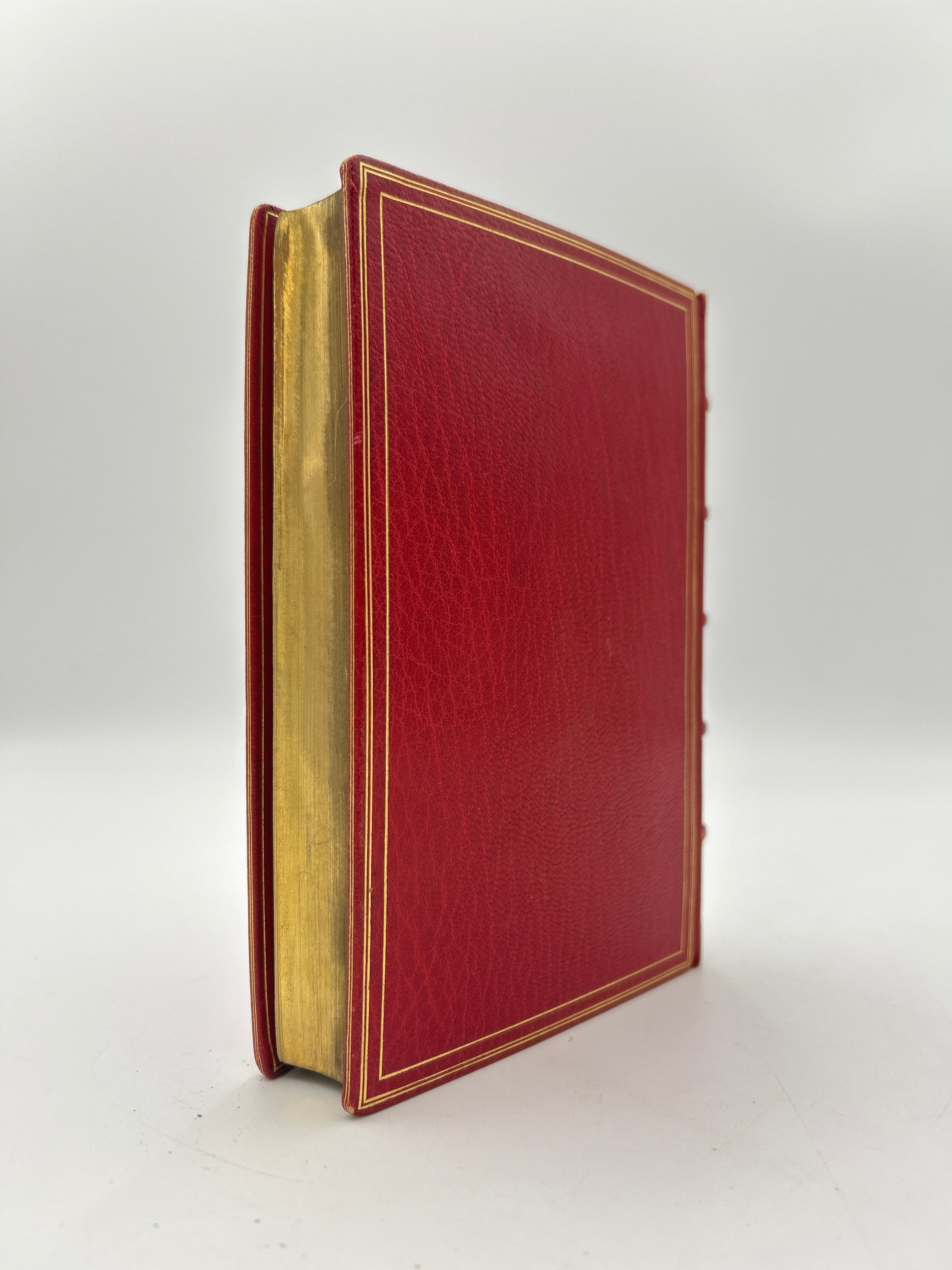 Bound by Sangorski and Sutcliffe in red Morocco with triple fillet boarders to upper and lower covers. Center of upper cover is monogram “M. R.” In gilt beneath a gilt crown. Five raised bands with second compartment lettered in gilt. Gilt and red leather turn ins. All edges gilt. Front free endpaper signed by Queen Mary “Mary R. 1951”. Immaculate condition.