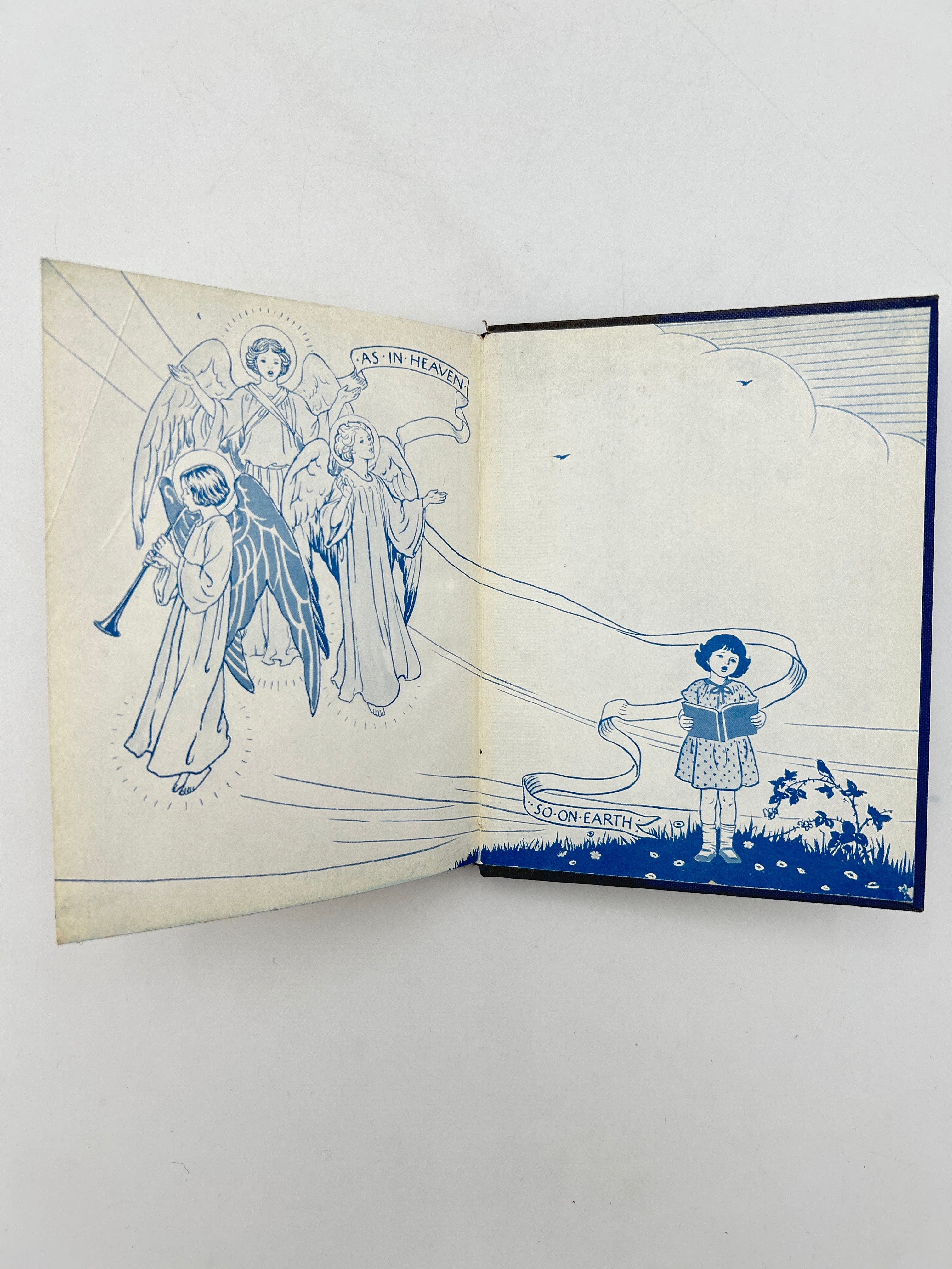 Blue canvas boards with gilt lettering on upper board. Pictorial paper wrapper. Inscription on flyleaf with date October 6th 1943. Including hymns such as All Things Bright and Beautiful, Away in a Manger, Hark the Herald Angels sing, Nearer my God to Thee, O Come All ye Faithful. Oh Little Town of Bethlehem, Once in Royal David City, and There is a Green Hill Far Away. Fine condition.