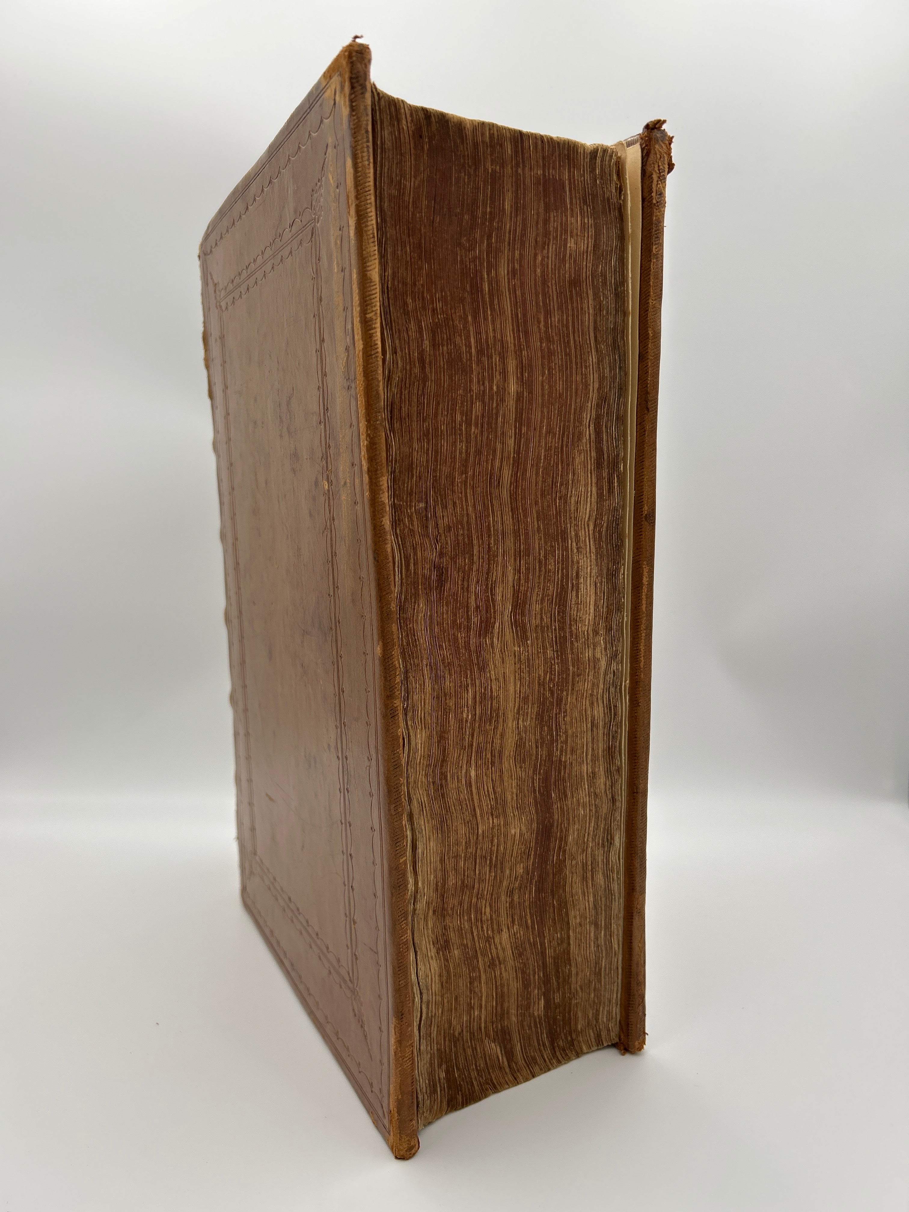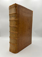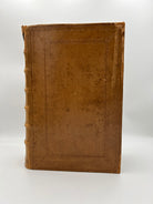 Caramel leather boards with embossed detailing on boards and spine. Six raised bands on the spine with embossed lettering. Slight tearing to the upper and lower spine with rubbing down of the leather along the edges and raised bands. Browning to interior pages, bookworm holes on several leaves. Scuffing along the boards. Fine condition overall.