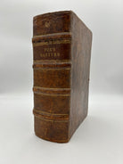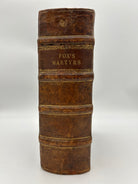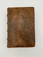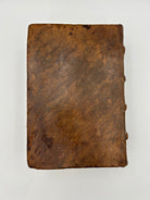 Brown leather binding with four raised bands and gilt lettering on the spine. Some bookworm damage that has led to tearing and a small missing section of leather under the first raised band and chip on the lower spine. General scuffing, discoloration, and wear to the boards and along the edges of the boards. Back board has chipping and tearing to lower left corner. Interior in fine condition with minimal foxing. Very good condition overall.