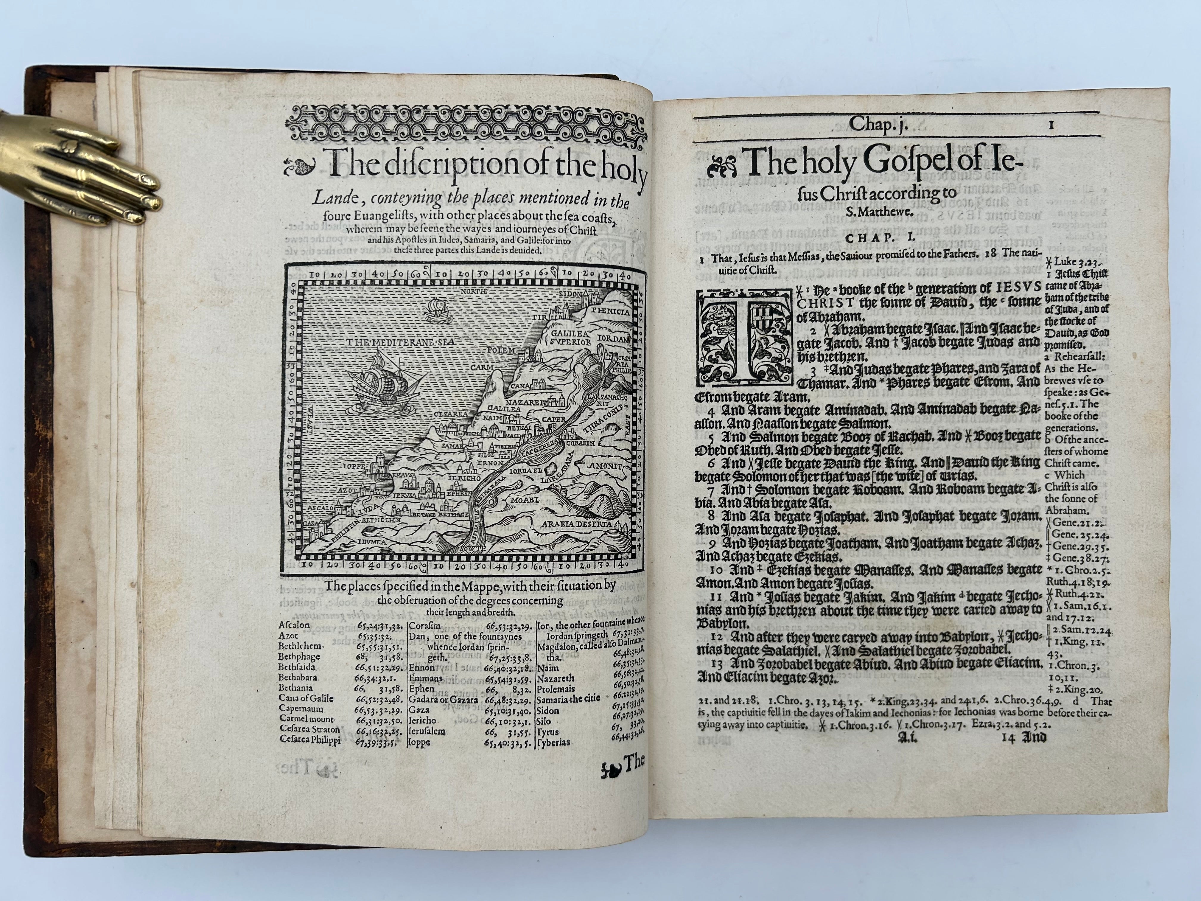 The Geneva Bible, first published in 1560, was an English translation produced by Protestant scholars who had fled to Geneva during the reign of Mary I, and it became one of the most influential English Bibles of the Reformation era. Notable for its clear, vigorous English and its extensive marginal notes reflecting Reformed theology, it was the first English Bible to use verse numbers throughout, making it especially accessible for study and preaching. The Geneva Bible was widely read in England, Scotland, and early colonial America and was favored by figures such as Shakespeare, John Knox, and the Puritans, even after the later publication of the King James Version. Many editions were distinguished by woodcut illustrations, including dramatic title-page scenes, biblical maps, genealogical charts, and narrative images that helped readers visualize scripture and reinforced Protestant teaching. Over time, these woodcuts became an important part of the Bible’s appeal, blending art, education, and theology, and they remain highly valued by historians and collectors as examples of how text and image worked together to shape early modern religious culture