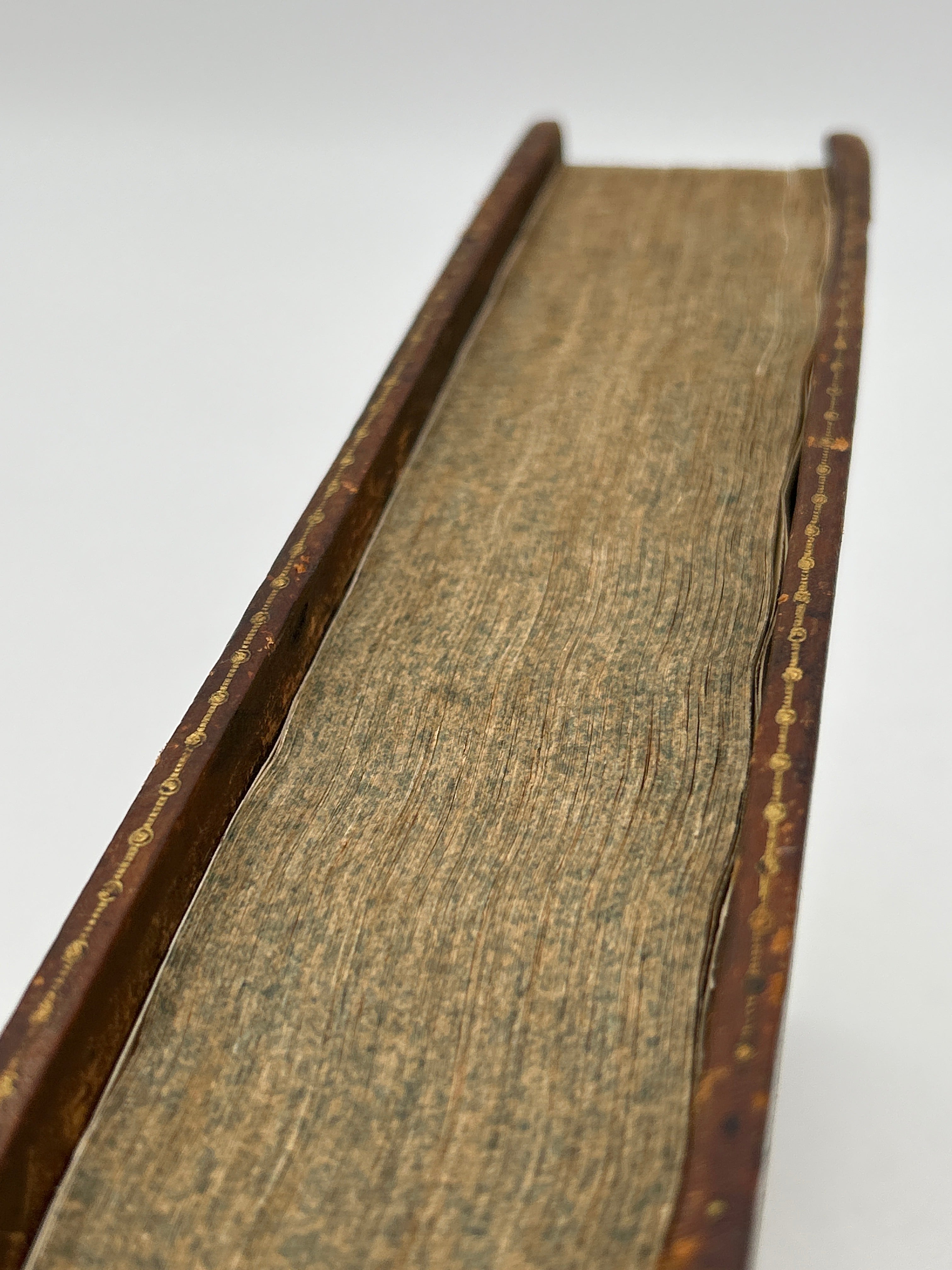 Repair to corners and head and foot of spine. Joints strengthened. Some light toning and foxing in places but otherwise in excellent condition. Front pastedown has the bookplates of St. Mark’s Library of the General Theological Seminary in New York and George Bones Morland. Front free endpaper with auction catalogue entry for the copy pasted in describing it there as “a magnificent copy” and a pencil note on the same page describes the book as “an exceptionally fine copy with original two blanks before title.” And it is still as such. Very fine condition overall.