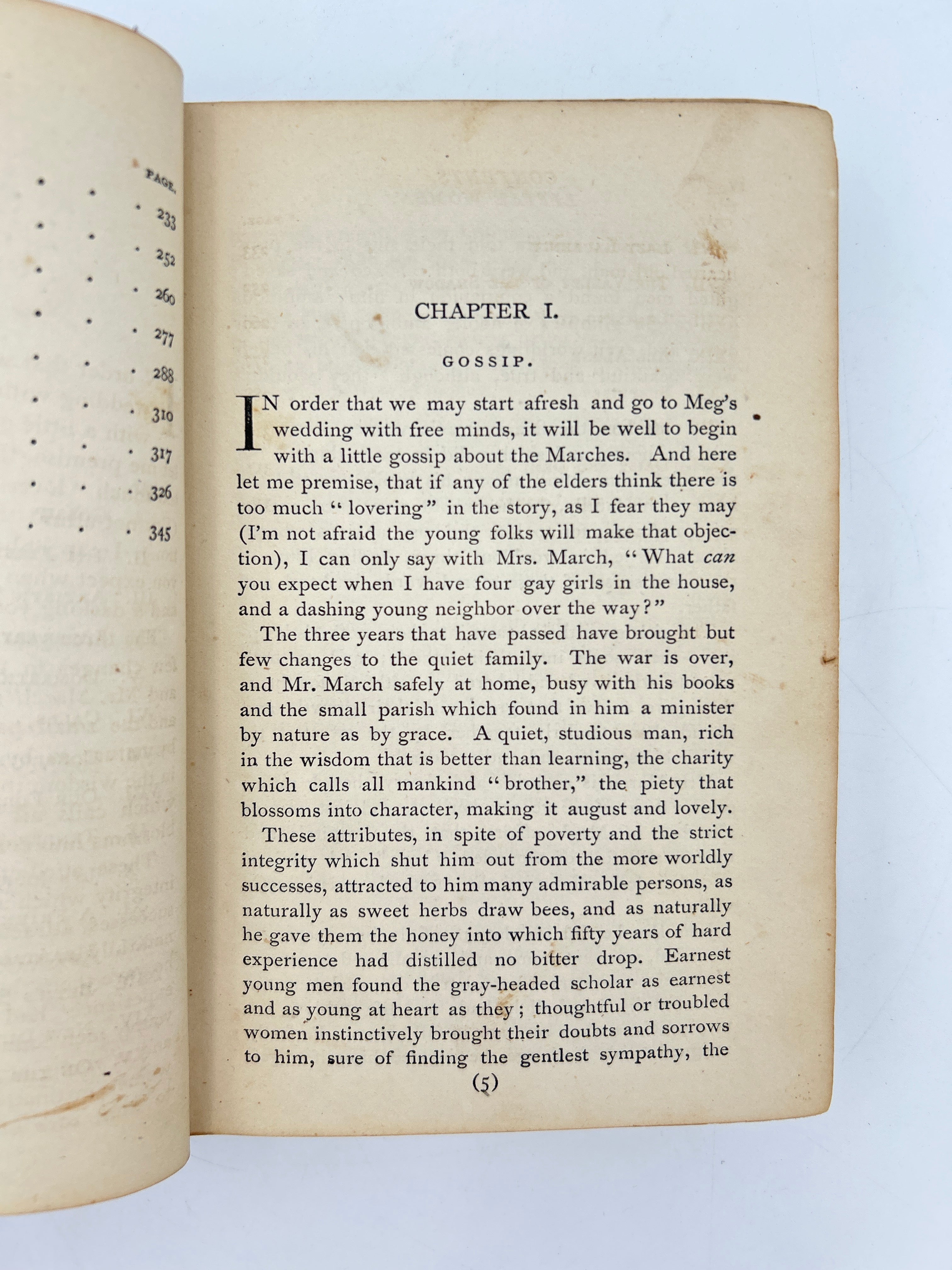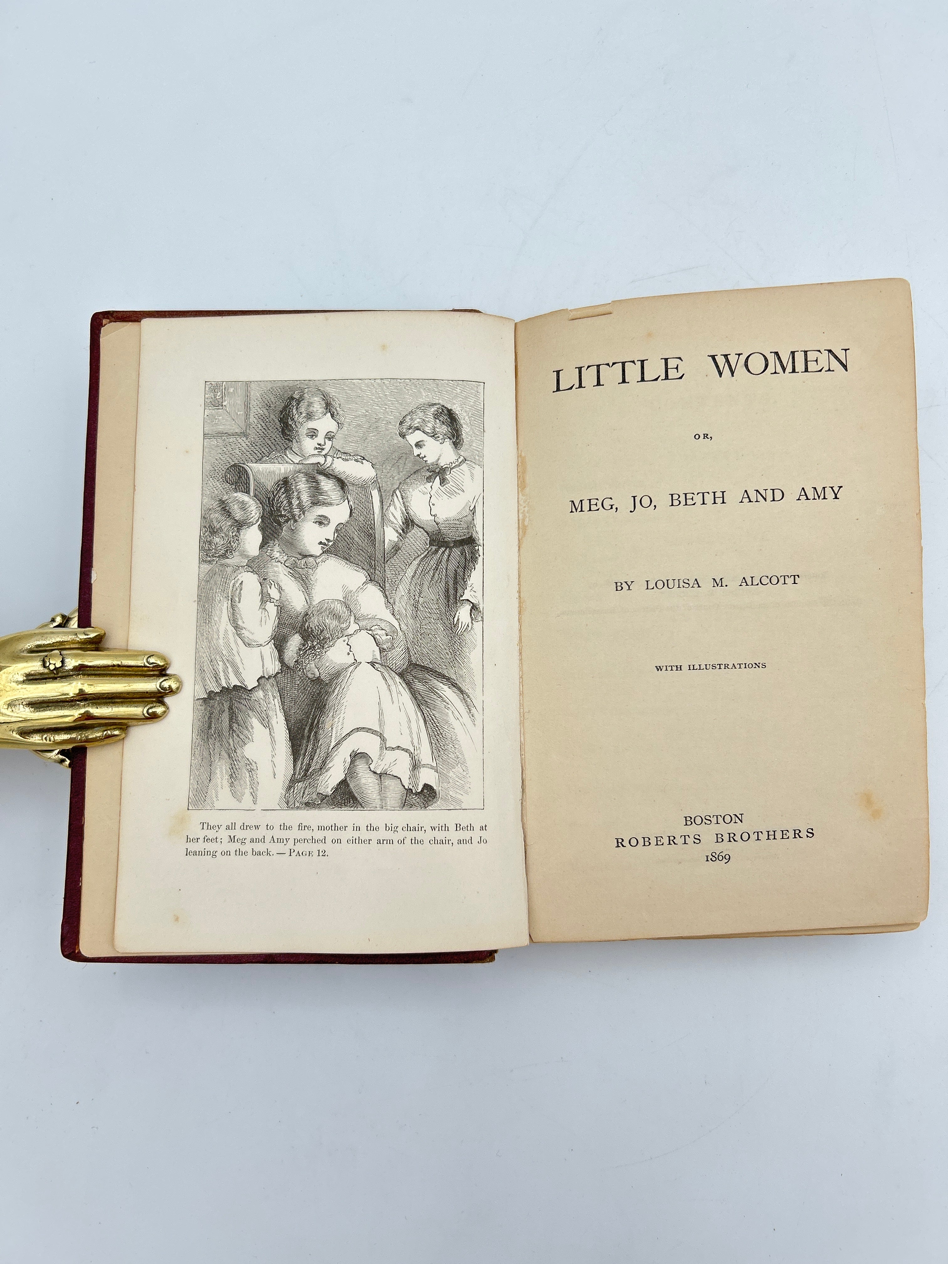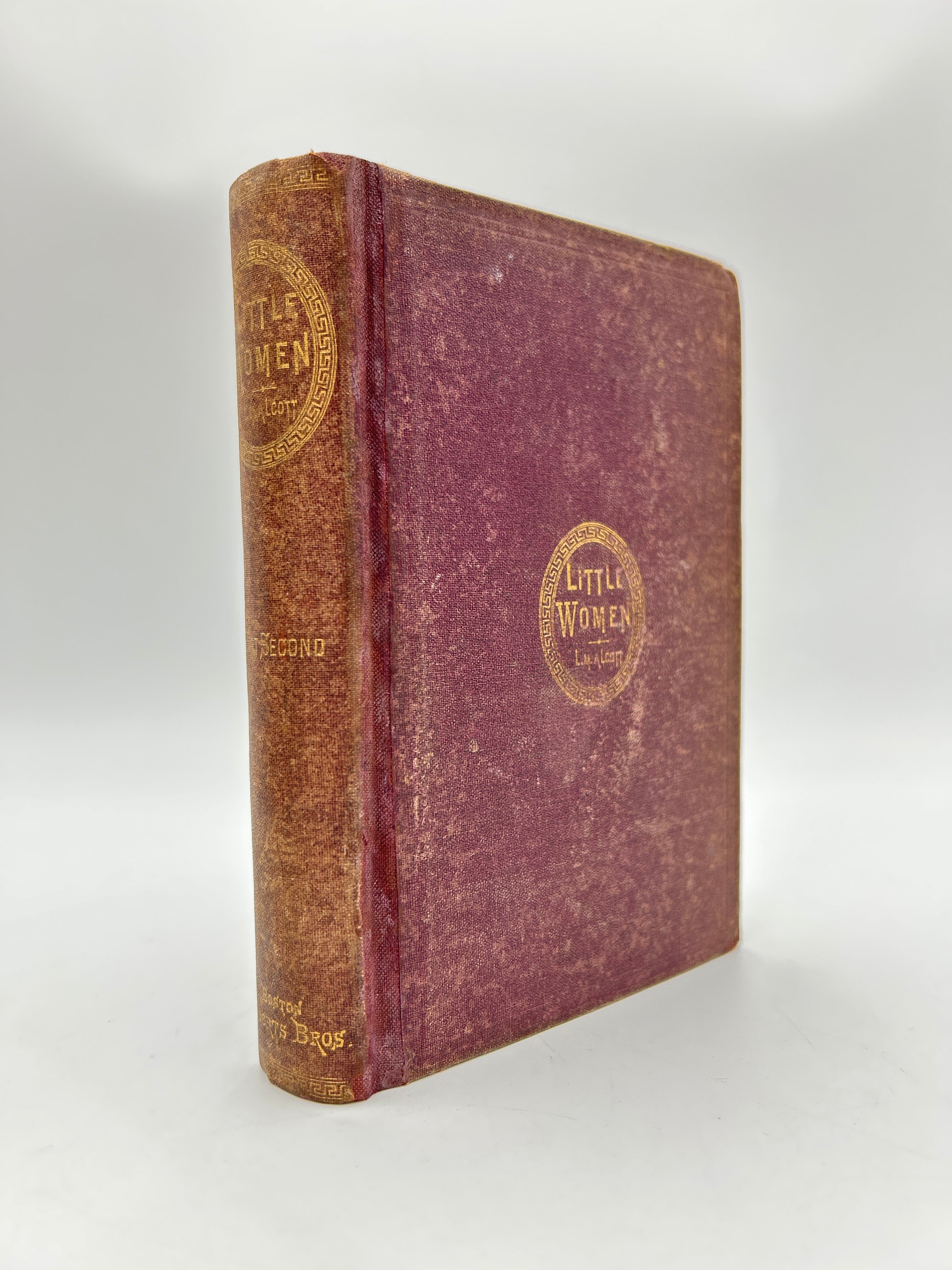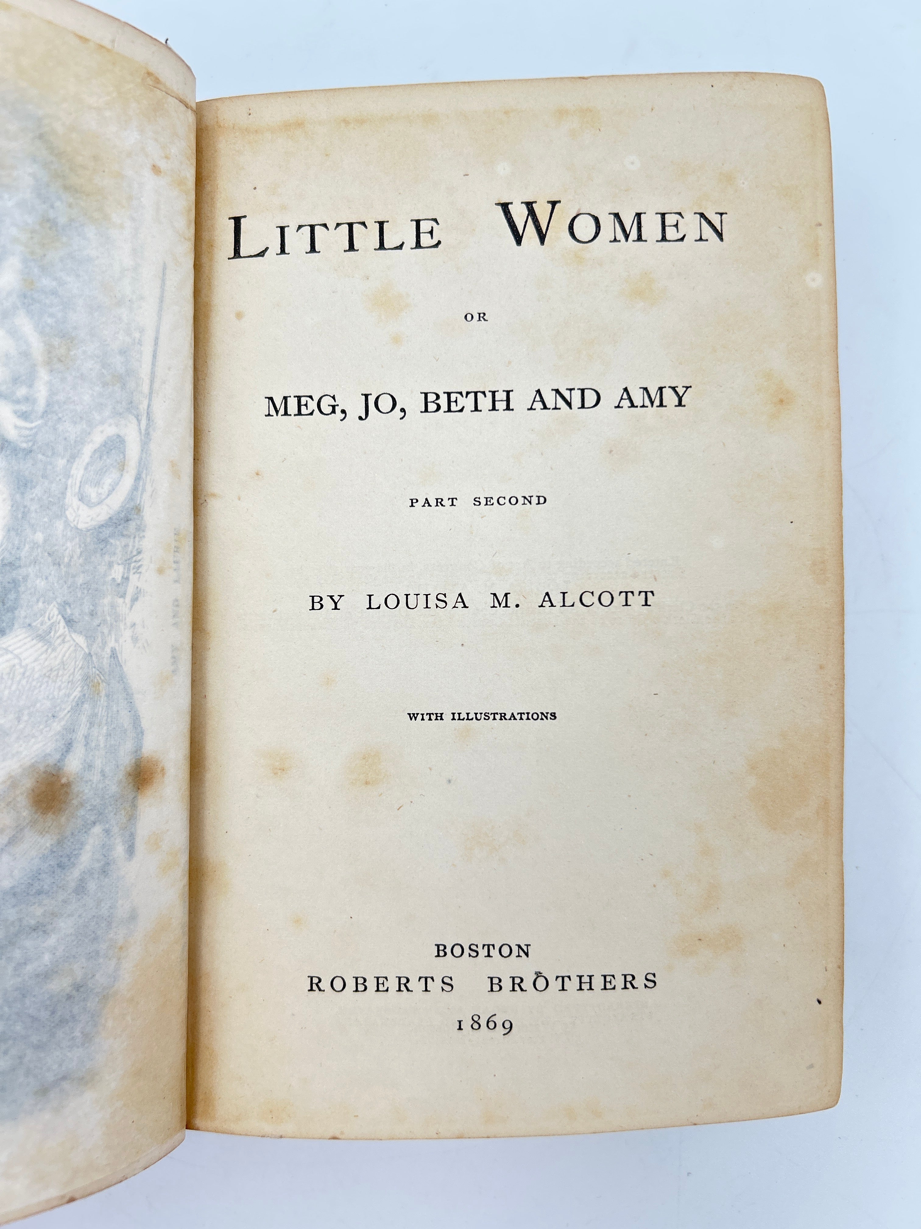 The second part (volume two) is s true first edition, first printing of Little Women, Part Second (Volume Two) by Louisa May Alcott published by Roberts Brothers of Boston in April 1869. It features a title page dated 1869, with the copyright also marked 1869 on the verso. The book is bound in terra-cotta cloth with gilt-stamped lettering and a central oval device on the front cover, matching the design of the first volume. It contains 359 pages and includes four illustrations, including a frontispiece by May Alcott (Louisa’s sister). The text begins with the chapter Gossip, continuing directly from the end of Part One. Notably, there is no listing of "Little Women, Part First" in the early advertisements or preliminary pages—this absence helps distinguish the first printing from later ones.