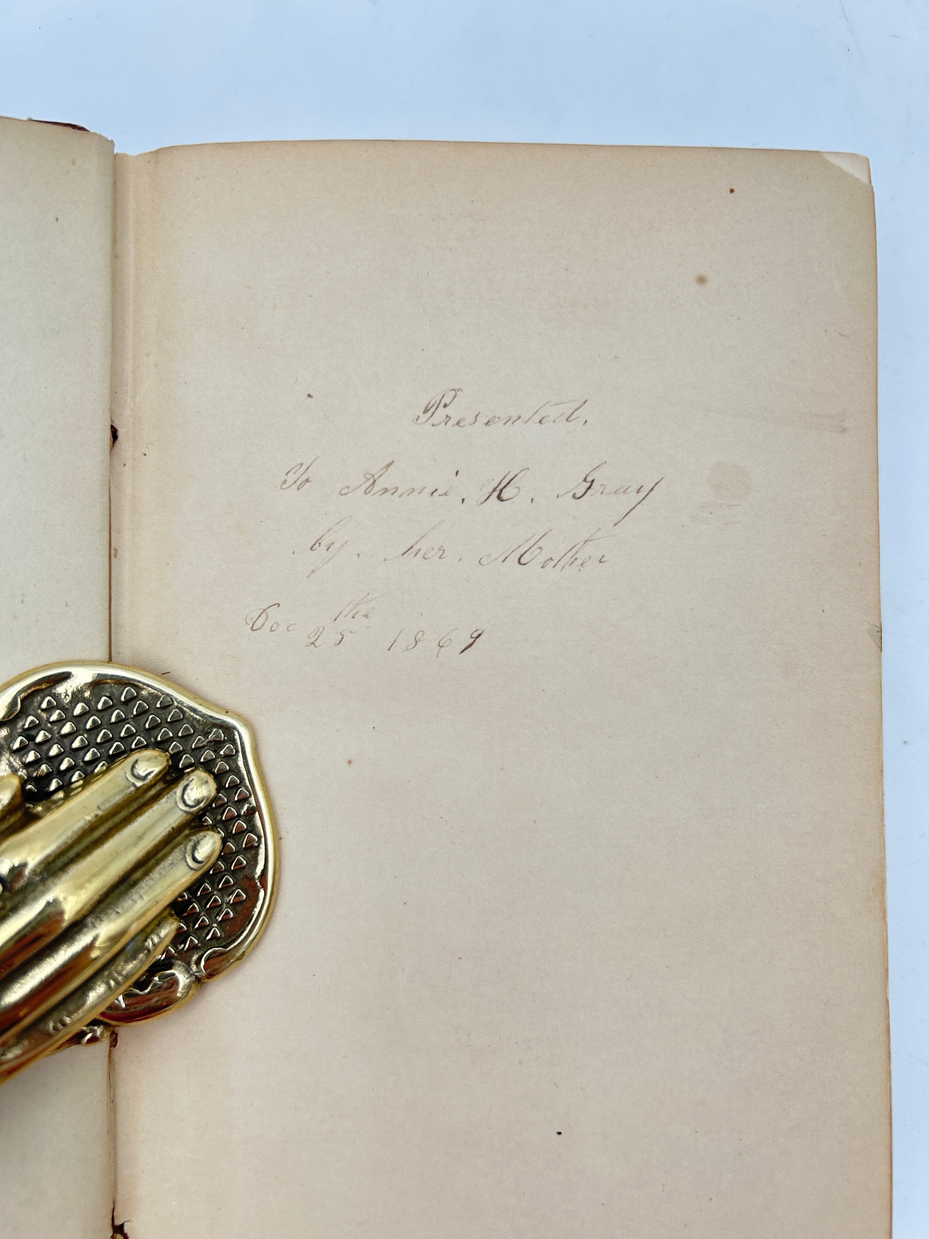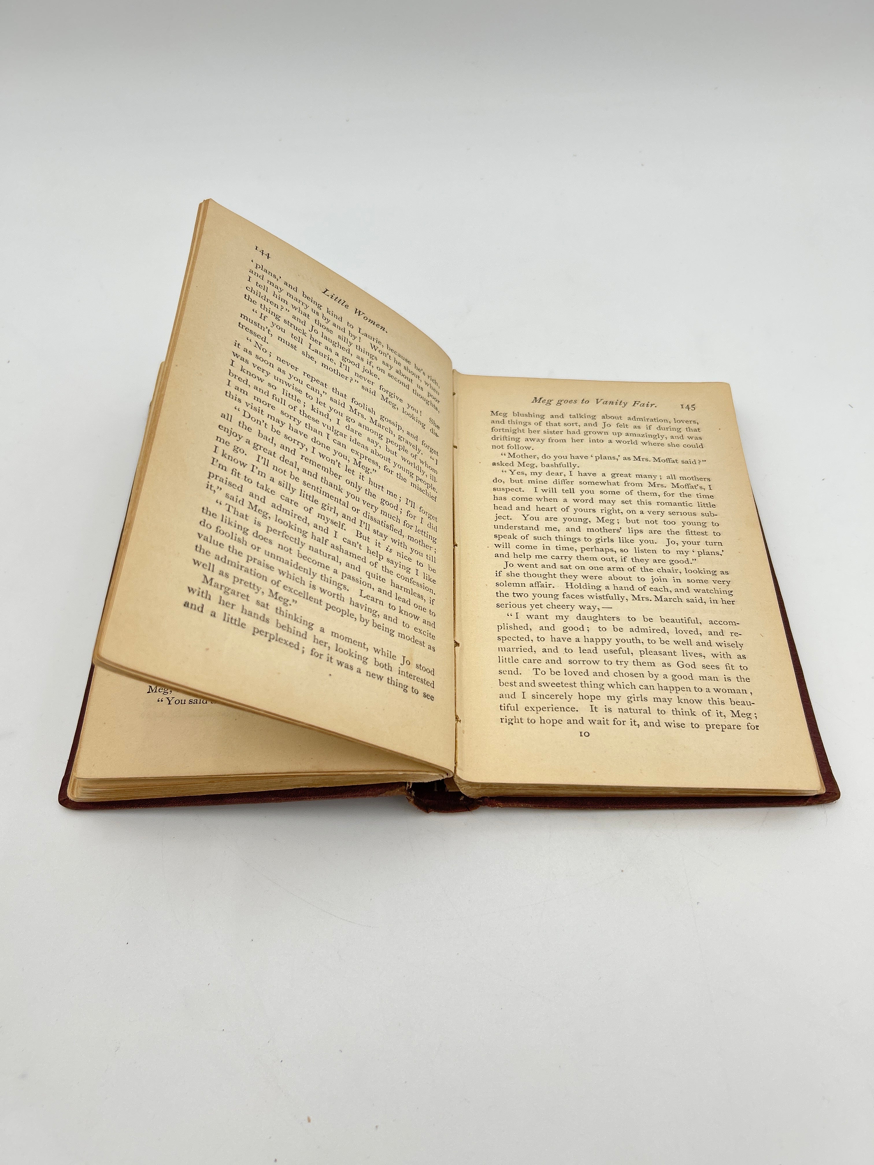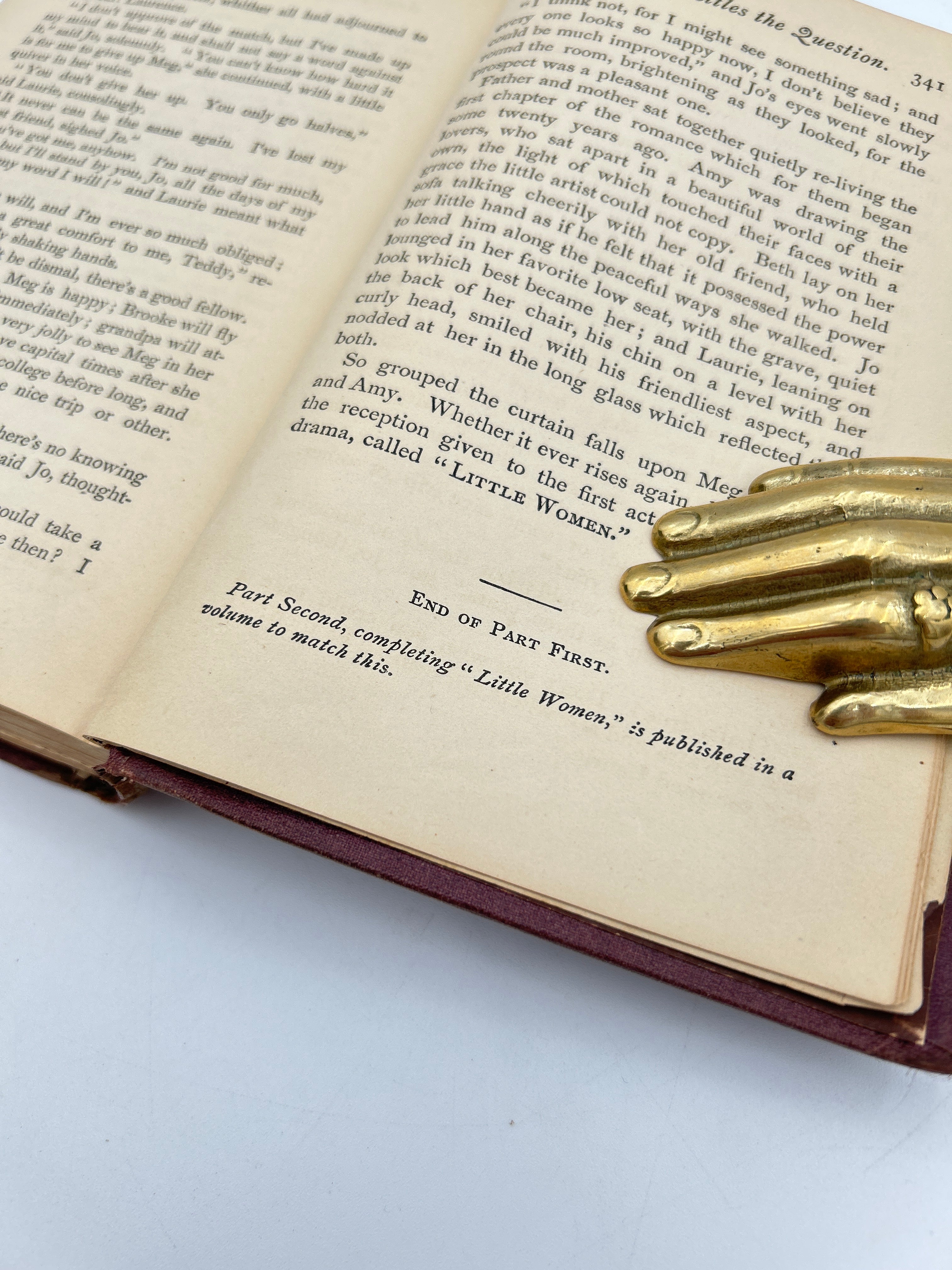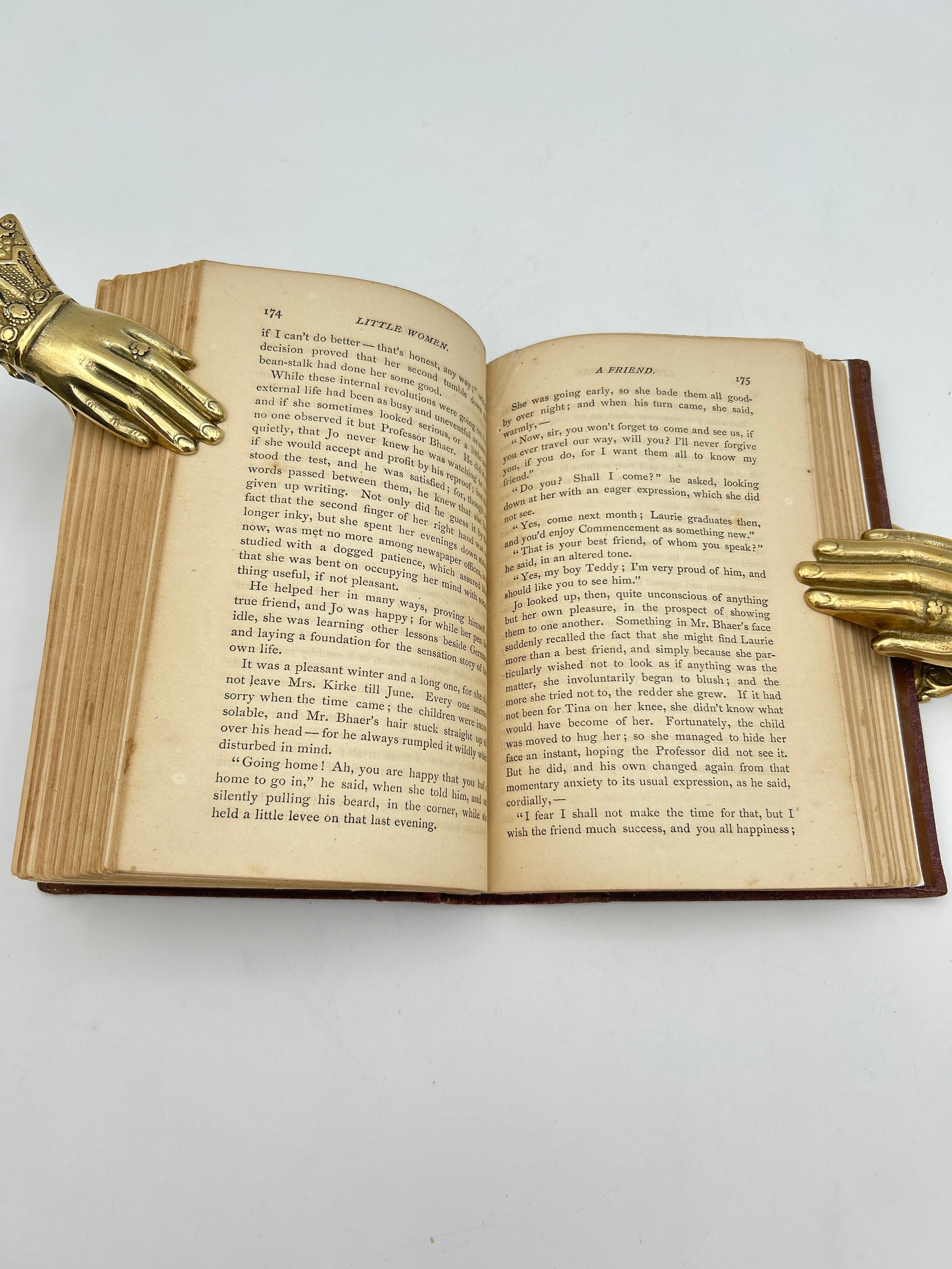 The second part (volume two) is s true first edition, first printing of Little Women, Part Second (Volume Two) by Louisa May Alcott published by Roberts Brothers of Boston in April 1869. It features a title page dated 1869, with the copyright also marked 1869 on the verso. The book is bound in terra-cotta cloth with gilt-stamped lettering and a central oval device on the front cover, matching the design of the first volume. It contains 359 pages and includes four illustrations, including a frontispiece by May Alcott (Louisa’s sister). The text begins with the chapter Gossip, continuing directly from the end of Part One. Notably, there is no listing of "Little Women, Part First" in the early advertisements or preliminary pages—this absence helps distinguish the first printing from later ones.