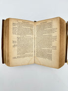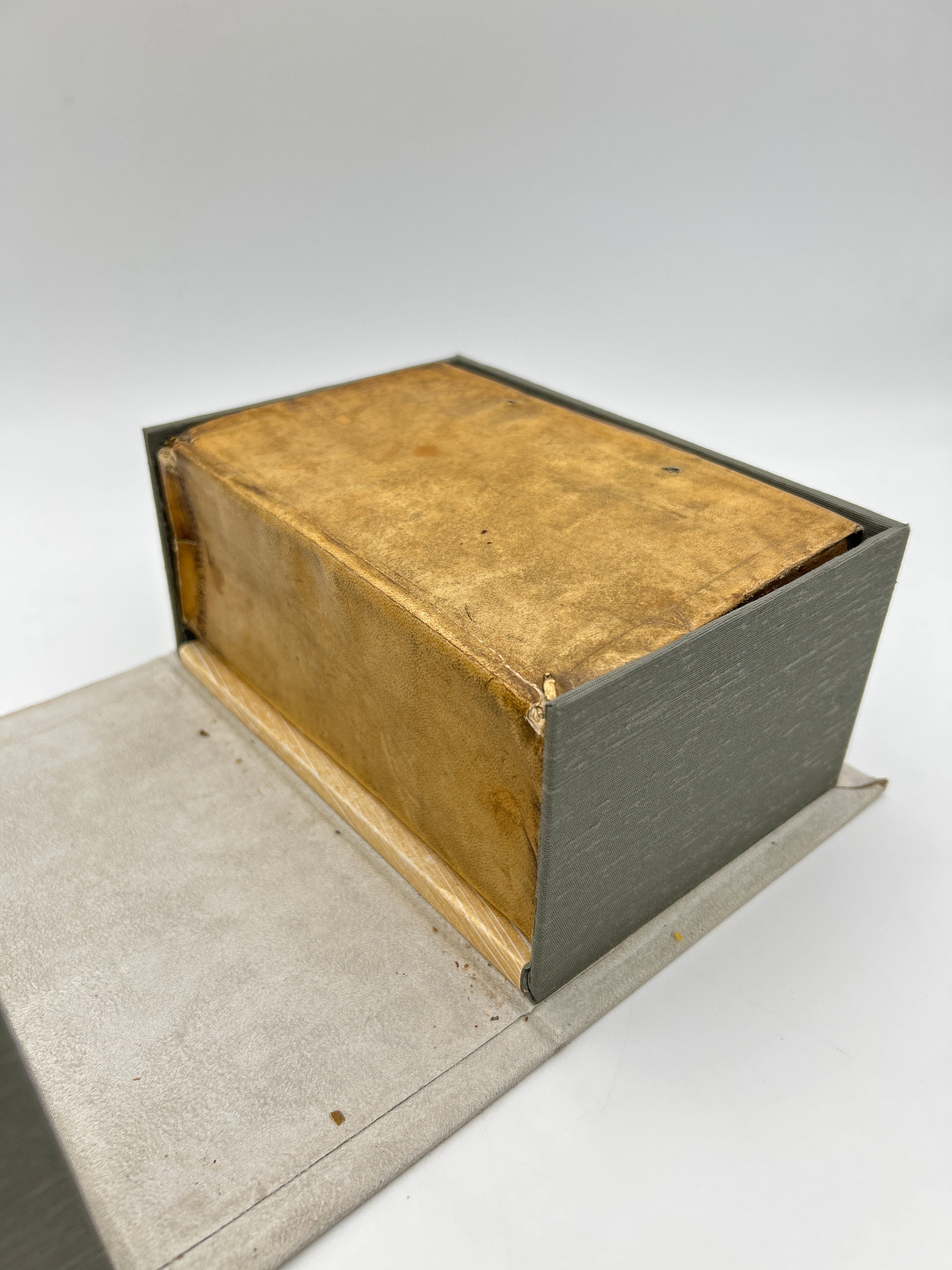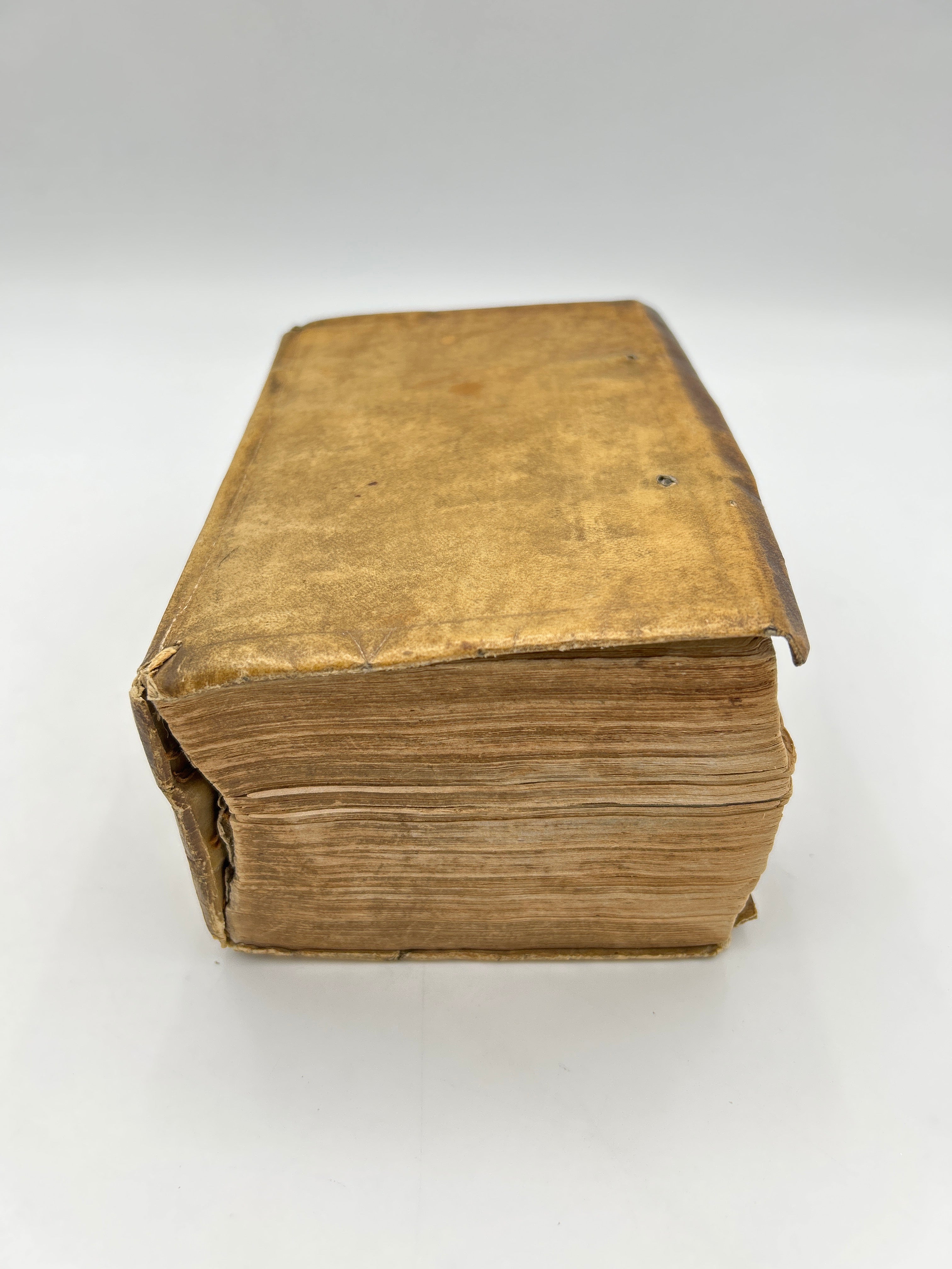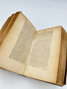 Vellum binding. Two holes on upper and lower board where leather ties would have been attached. Inscription to upper spine. Several slight cuts to corners and discoloration to binding. Red and black lettering to title page and woodcut illustration. Book plate to interior cover. Fully intact. Housed in a custom-made clamshell box with laser cut engraving on cover.Very good condition all things considered.