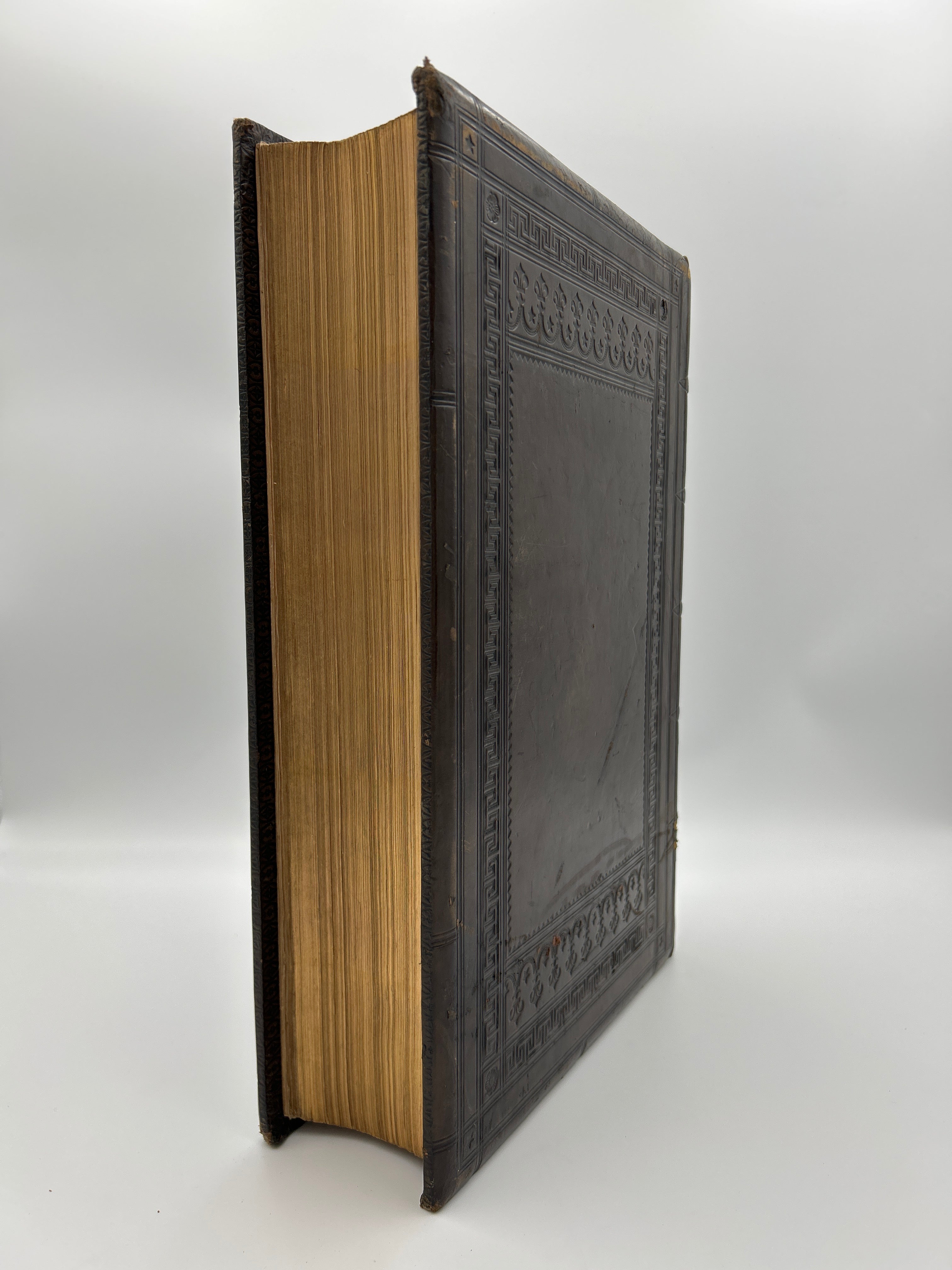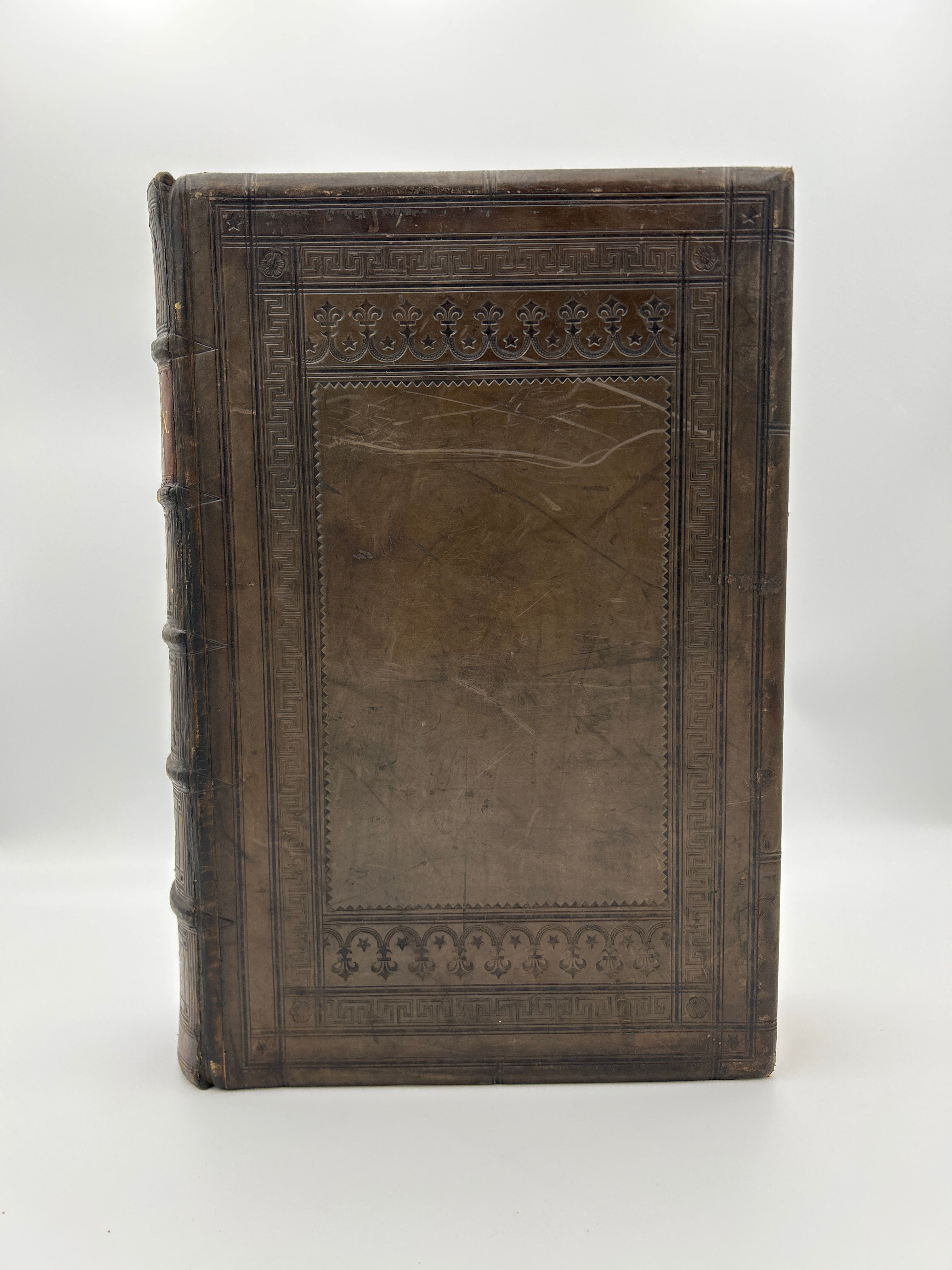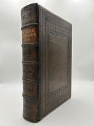 Brown leather boards with embossed detailing on the boards. Five raised bands with embossed details and gilt lettering on the spine. Gilt edges. Marbled endpapers and embossed turn-ins. General browning to the pages but interior in excellent condition. Fine condition overall.