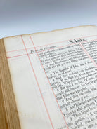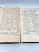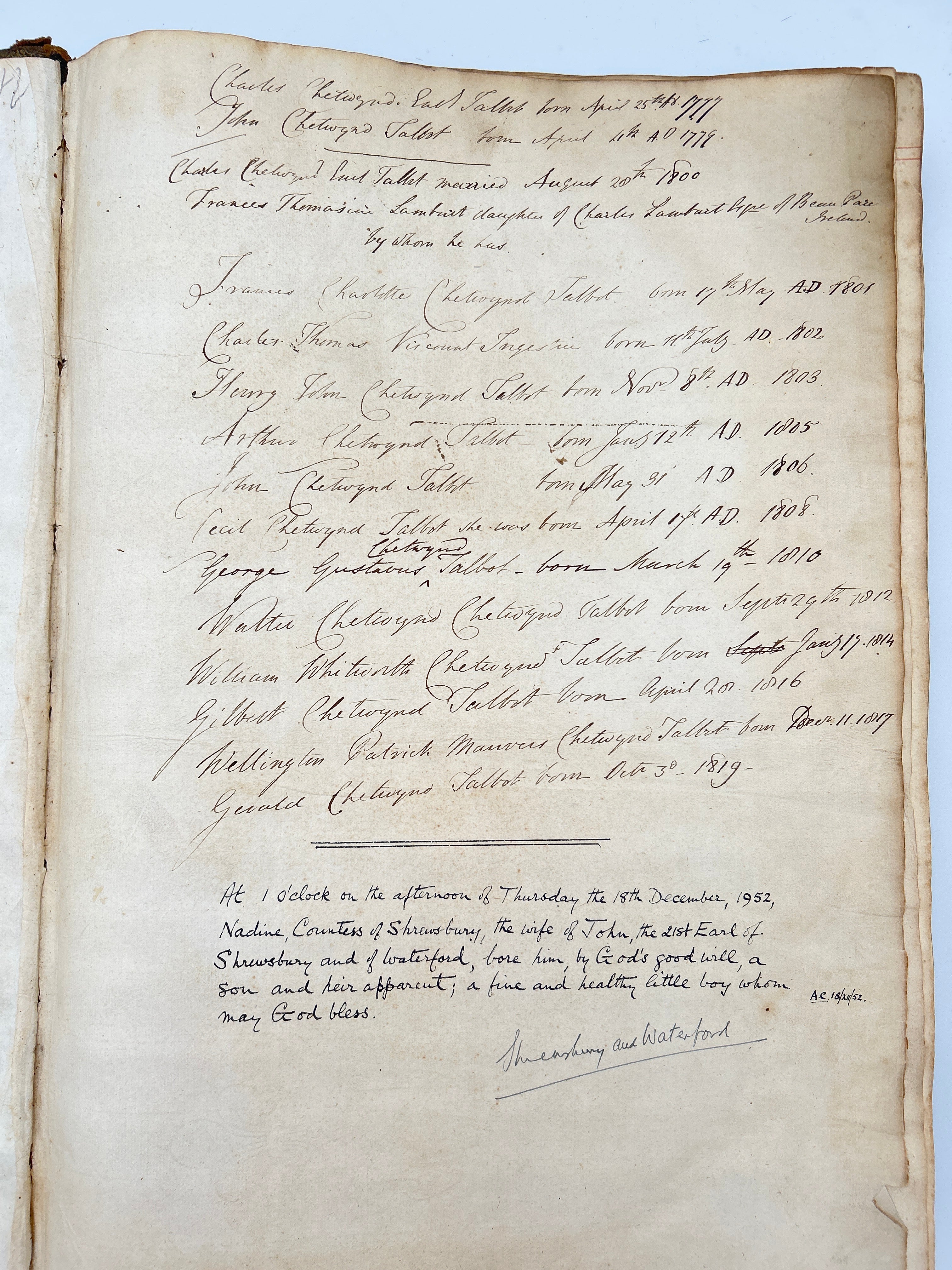 This Bible bears the crest of Ingestre Hall, the estate of the Chetwynd-Talbot family, a distinguished lineage in Staffordshire, England. The family held the titles of Earls Talbot and later Earls of Shrewsbury, making them one of the most prominent aristocratic houses in Britain. Their ancestry blends two significant noble lines: the Chetwynds, who were influential parliamentarians and antiquarians in the 17th century, and the Talbots, one of England’s oldest noble families, with deep ties to the Church of England and national politics. A preliminary blank page has family names and dates noted in Volume One.