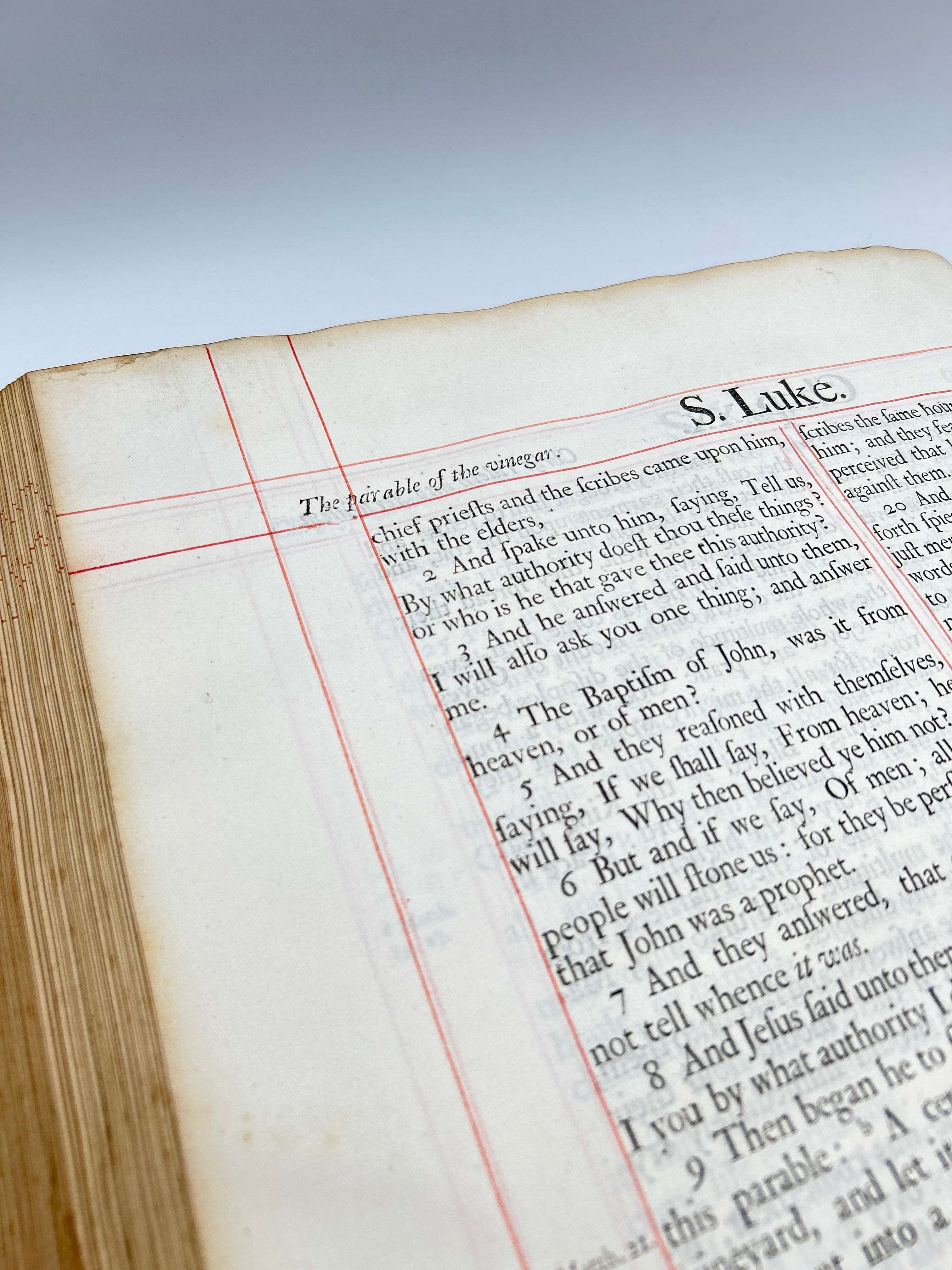 One of Baskett’s most famous productions was the 1717 folio edition of the King James Bible, now often referred to as the "Vinegar Bible." This nickname comes from a prominent printing error in the heading of Luke 20, which reads “The Parable of the Vinegar” instead of “The Parable of the Vineyard.” Other mistakes in the “Vinegar Bible” includes repeated words, omitted phrases, and incorrect chapter headings or numbering, all of which reflect the challenges of typesetting such a massive text by hand.