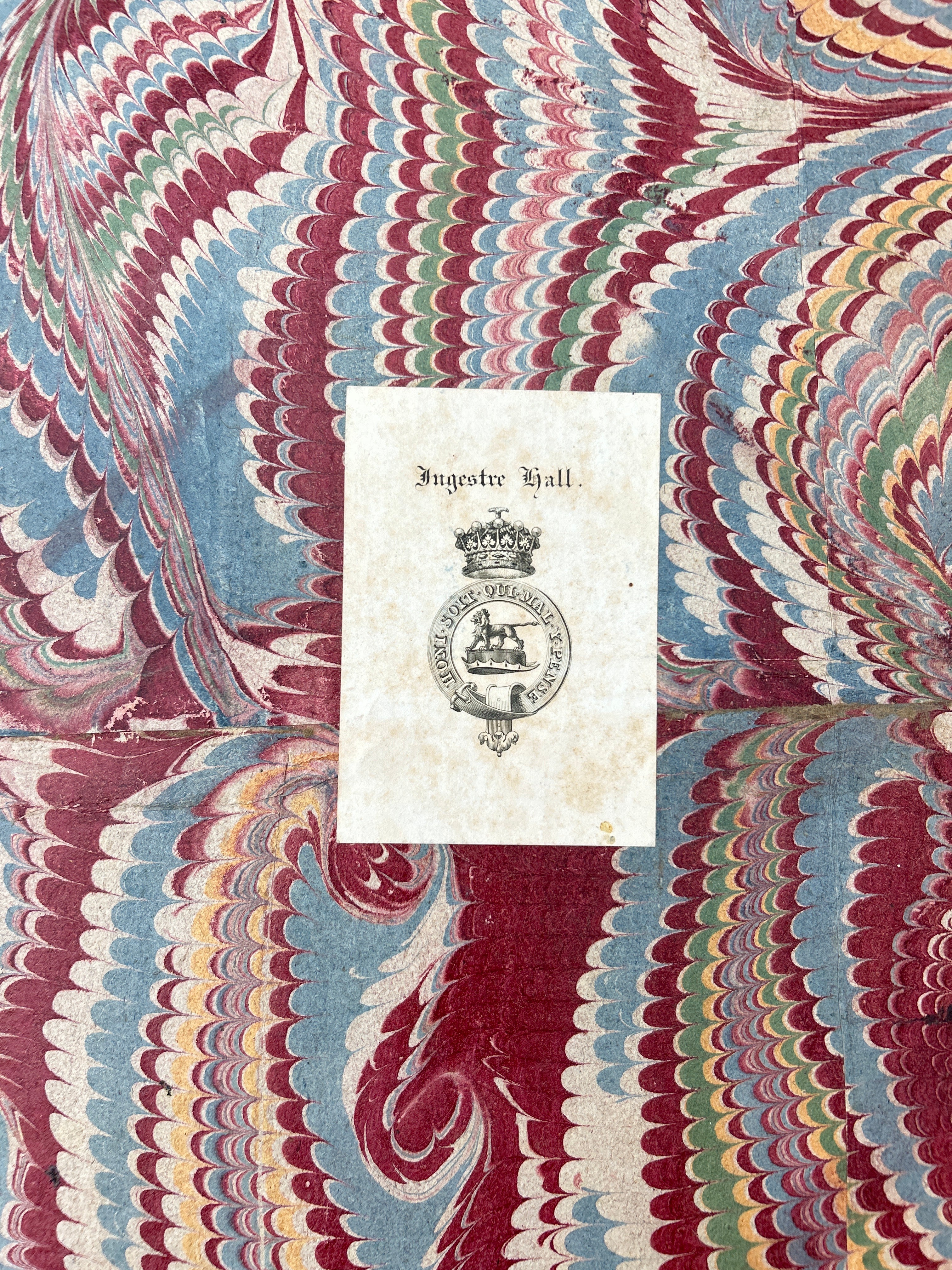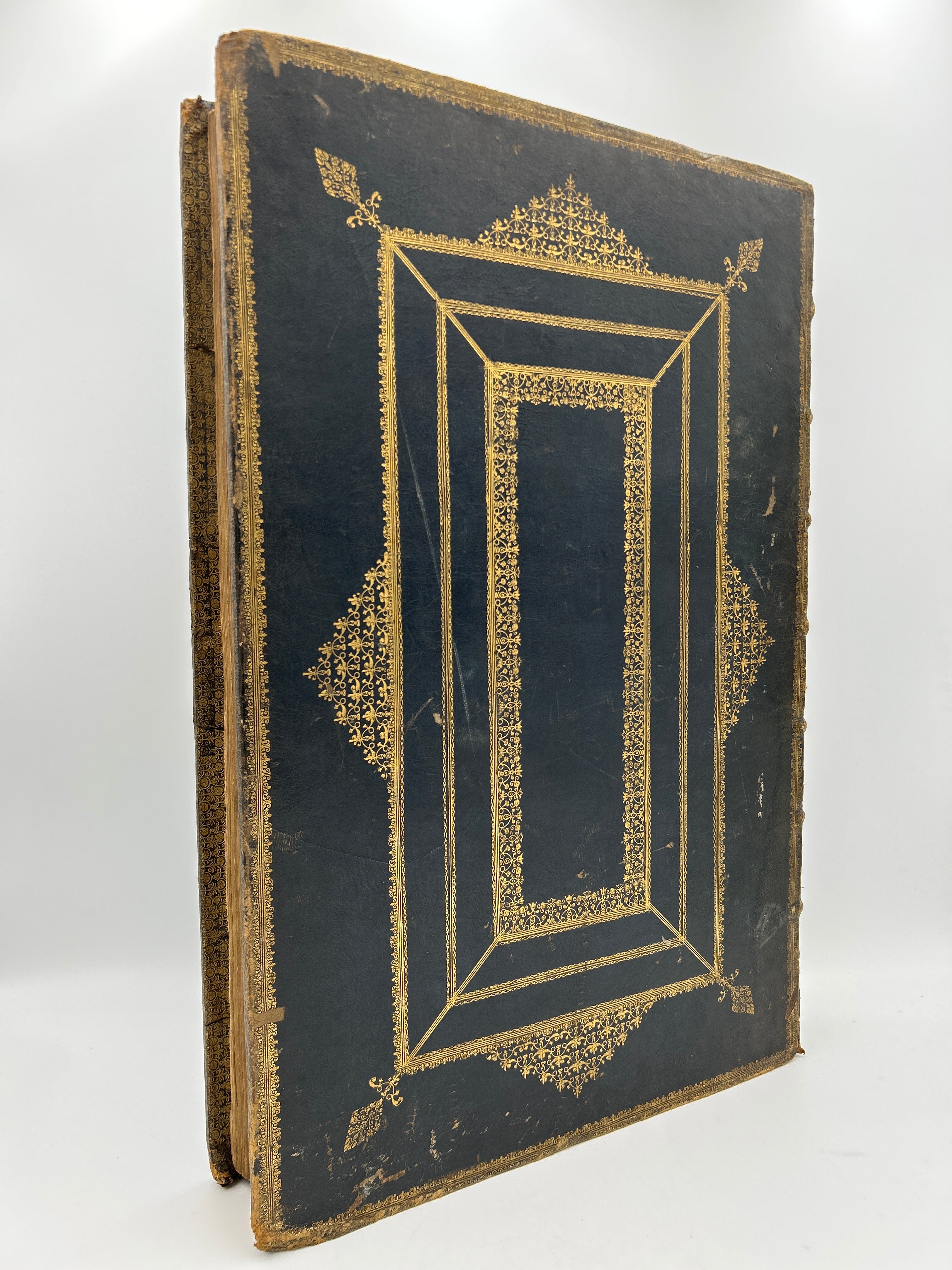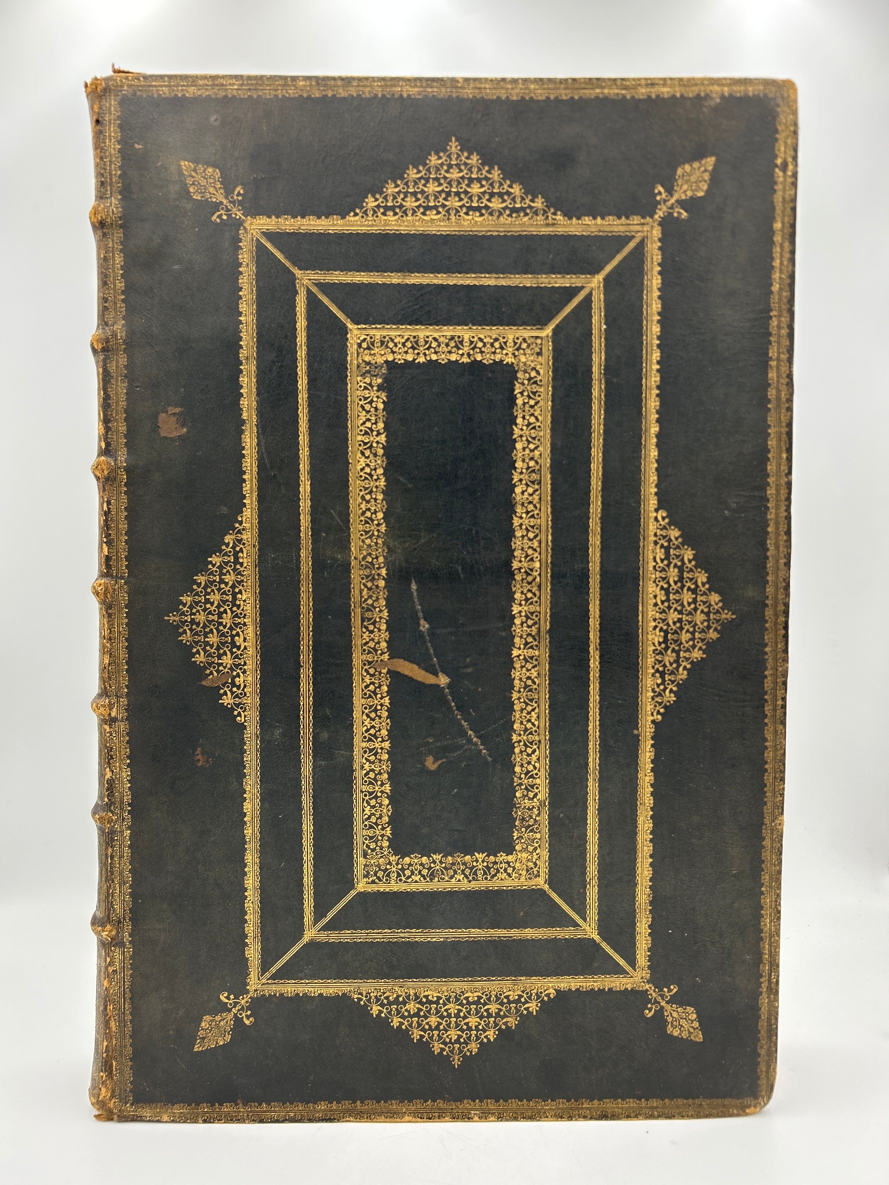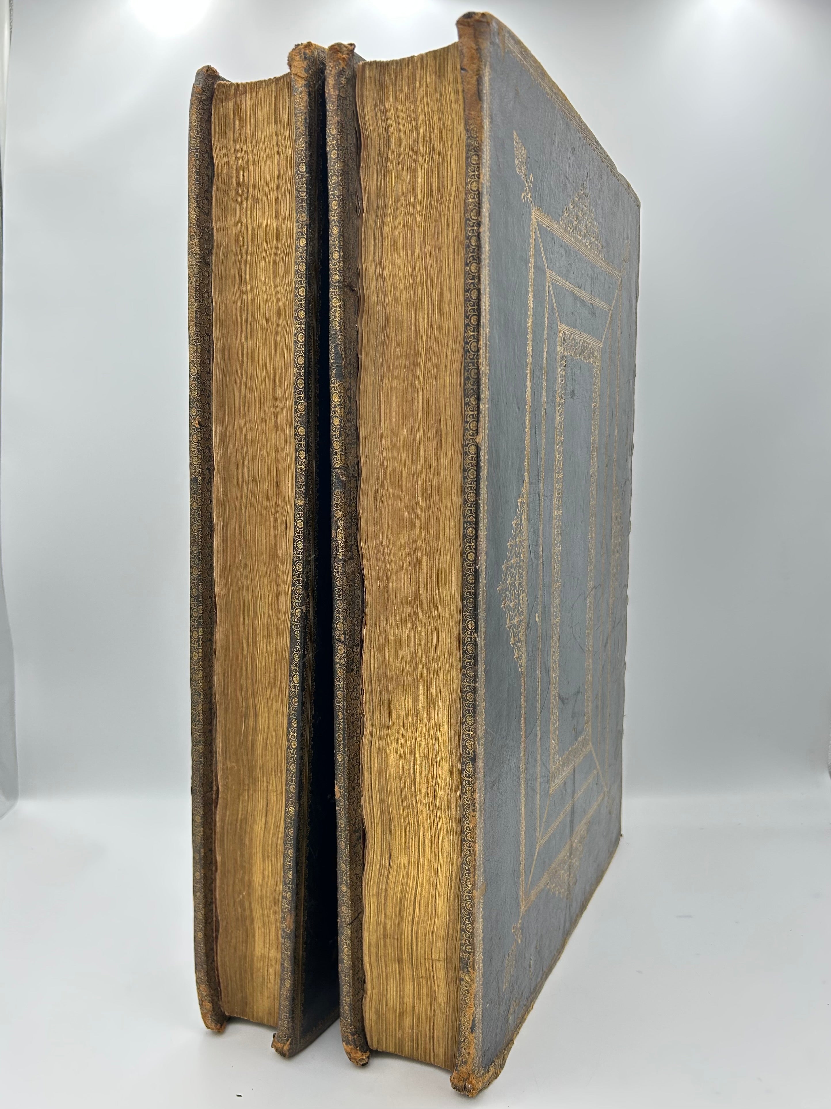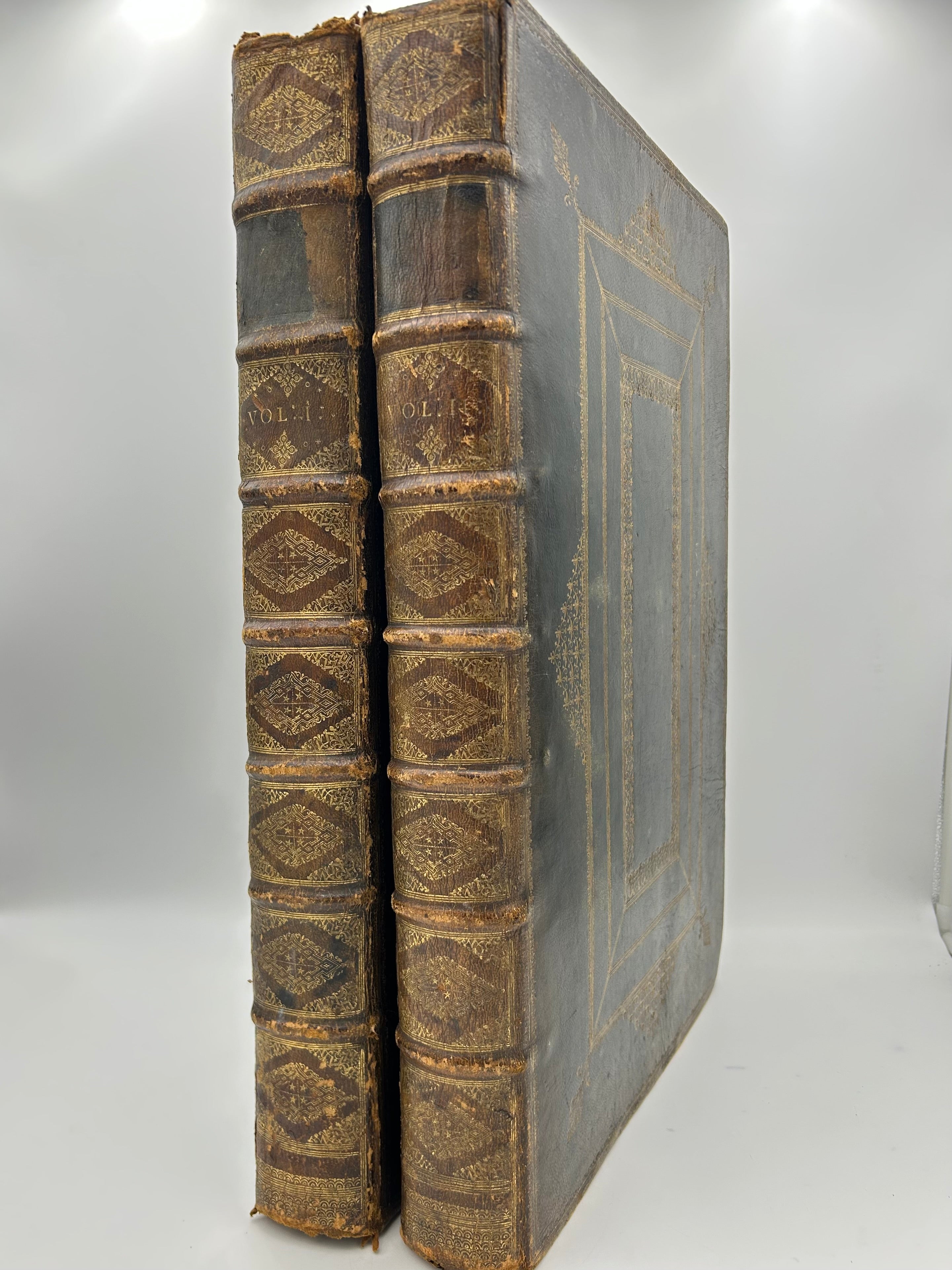 Folio edition in full leather bindings. With hand tooled gilt designs both geometric and organic on upper and lower boards. Seven raised bands with gilt ornamentation. Black leather label in the second compartment and lettering in the third. Gilt edges. Red hand drawn ruling throughout. Silver plate engravings throughout. Marbled endpapers. Very fine paper and materials used. Armorial bookplates of Ingestre Hall on the interior upper board of each volume. Numerous family names of the Chetwynd-Talbot line and dates of births and some deaths inscribed on preliminary blank page along with a lengthy inscription in black ink noting the birth of the twenty-second Earl of Shrewsbury on December 18th, 1952.