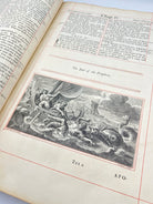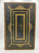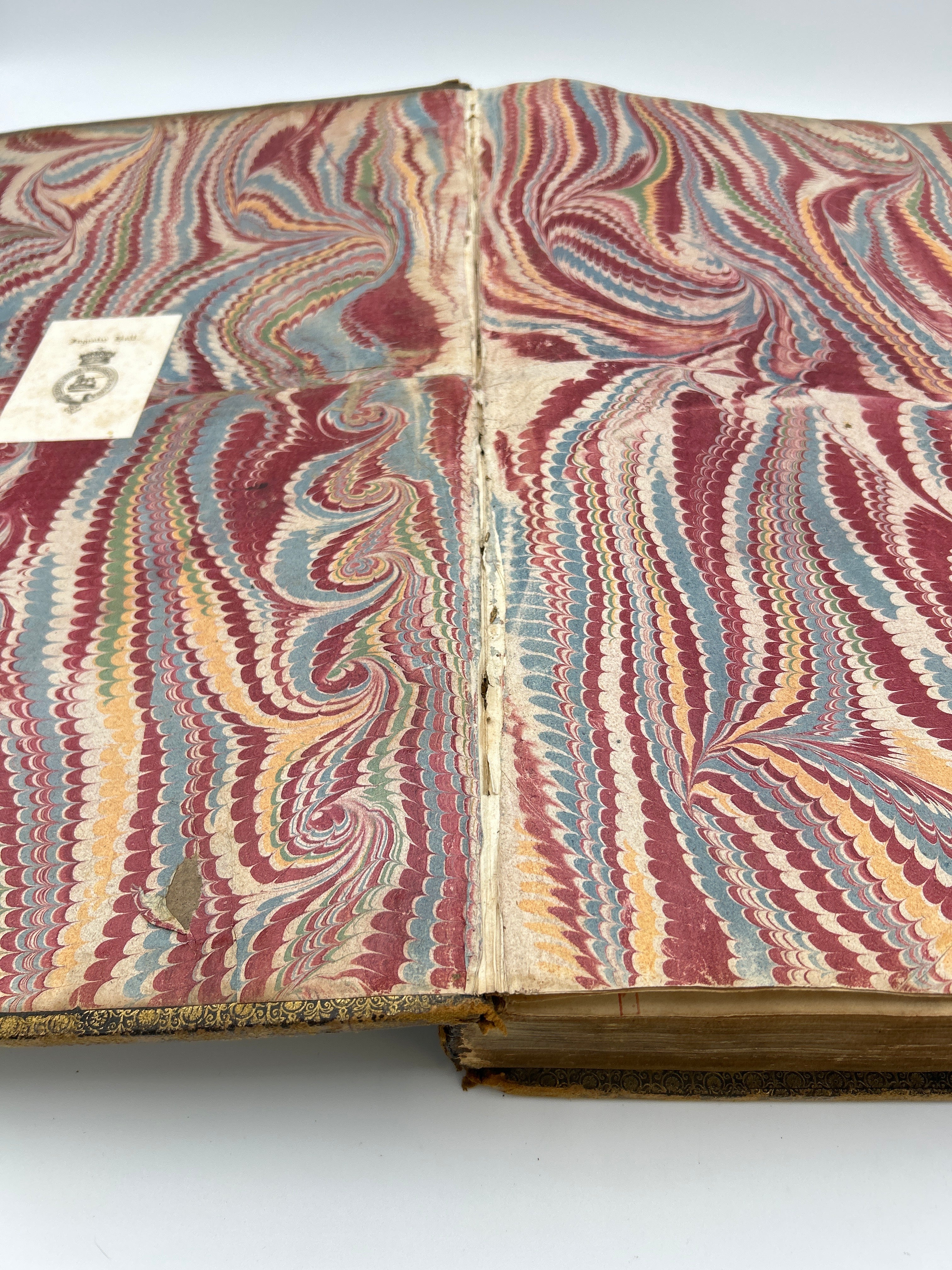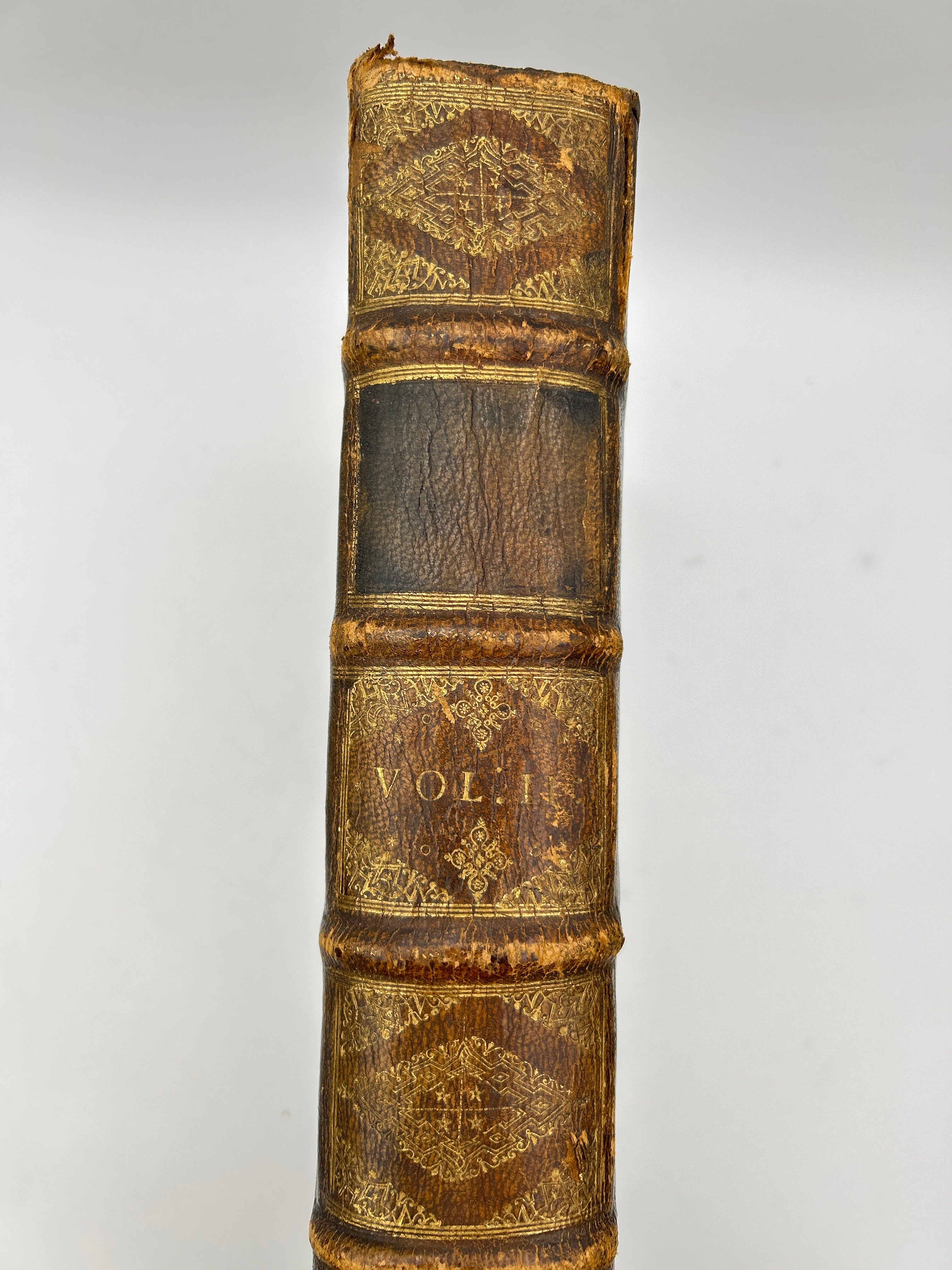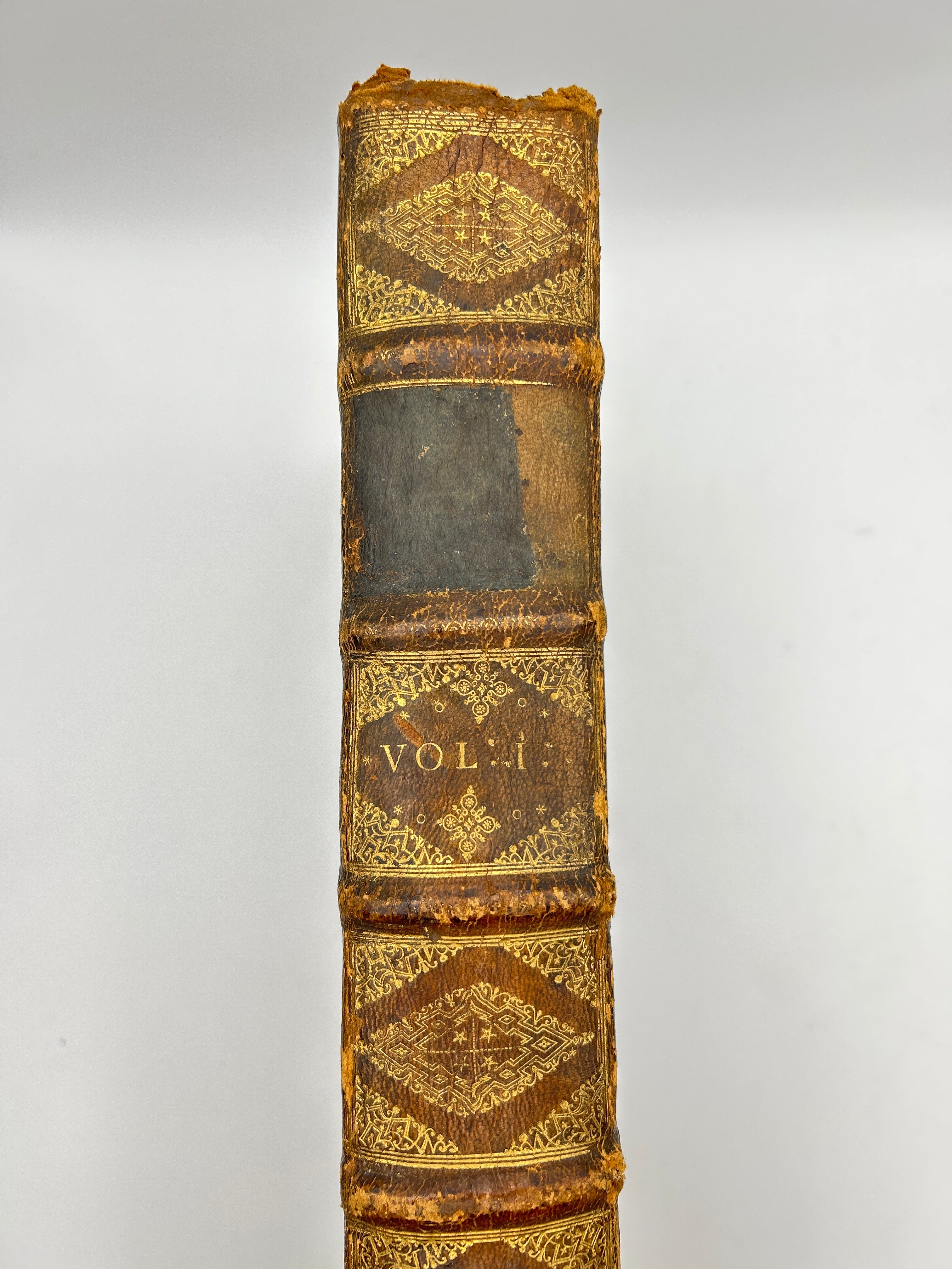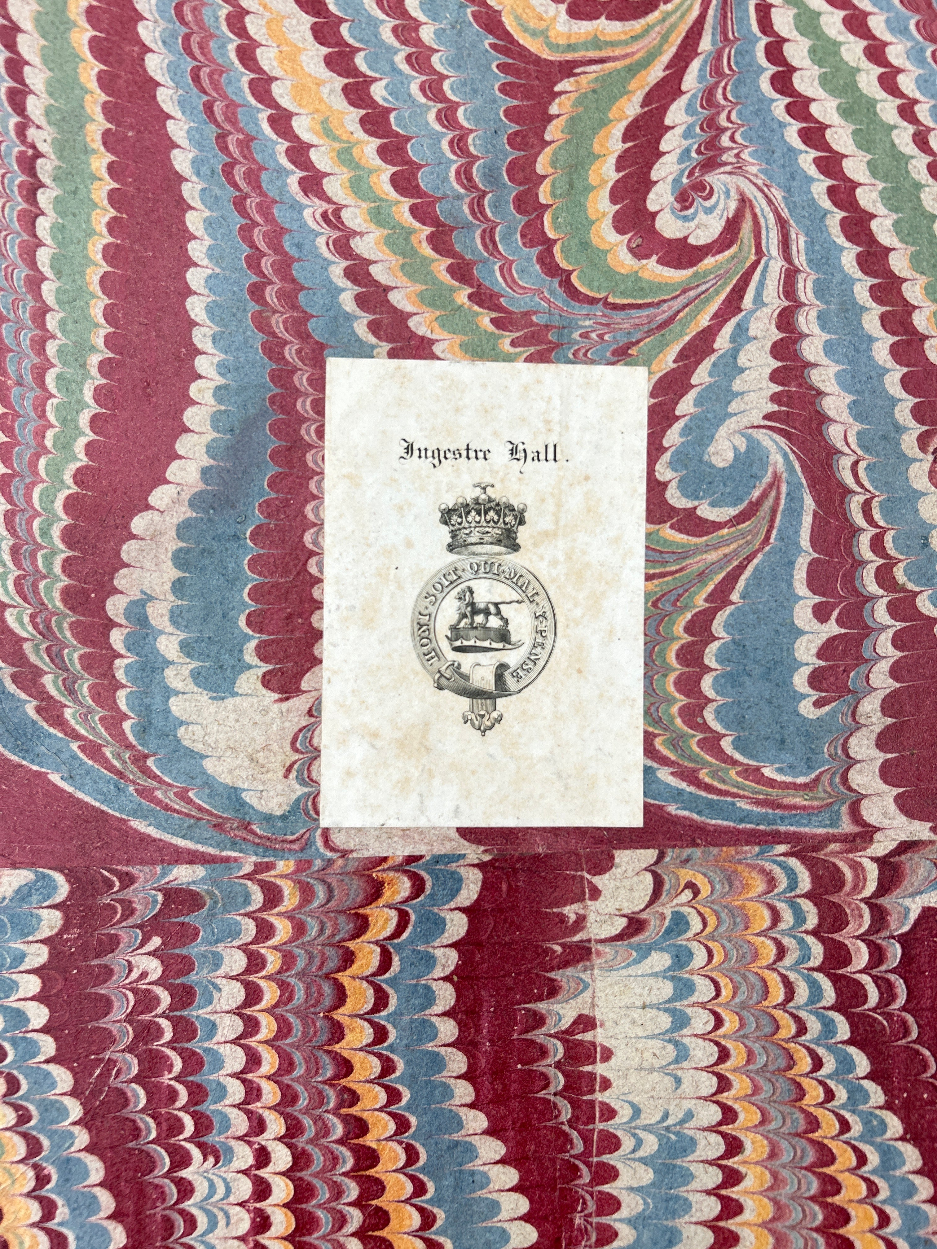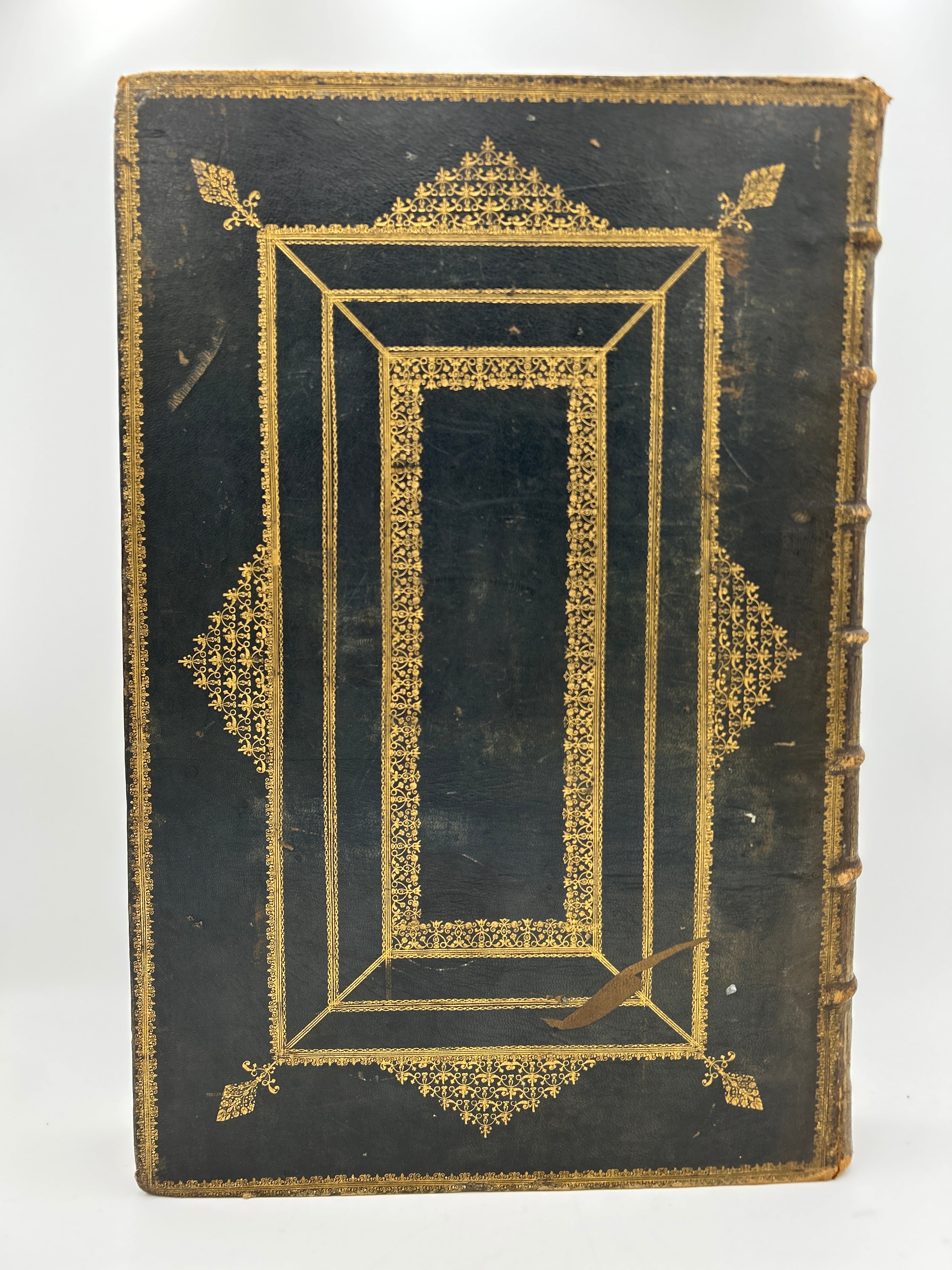 Folio edition in full leather bindings. With hand tooled gilt designs both geometric and organic on upper and lower boards. Seven raised bands with gilt ornamentation. Black leather label in the second compartment and lettering in the third. Gilt edges. Red hand drawn ruling throughout. Silver plate engravings throughout. Marbled endpapers. Very fine paper and materials used. Armorial bookplates of Ingestre Hall on the interior upper board of each volume. Numerous family names of the Chetwynd-Talbot line and dates of births and some deaths inscribed on preliminary blank page along with a lengthy inscription in black ink noting the birth of the twenty-second Earl of Shrewsbury on December 18th, 1952.