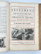 John Baskett was a notable English printer who served as the King’s Printer from 1711 until his death in 1742. This prestigious role granted him the exclusive right to print Bibles, prayer books, and other official religious texts in England. Baskett operated out of Oxford and London, overseeing one of the most expansive and technologically advanced printing operations of the time. His tenure was marked by an ambition to elevate the quality and grandeur of printed Bibles, particularly through the use of large folio formats, fine paper, and elegant type design.