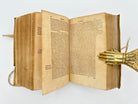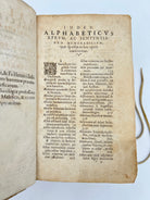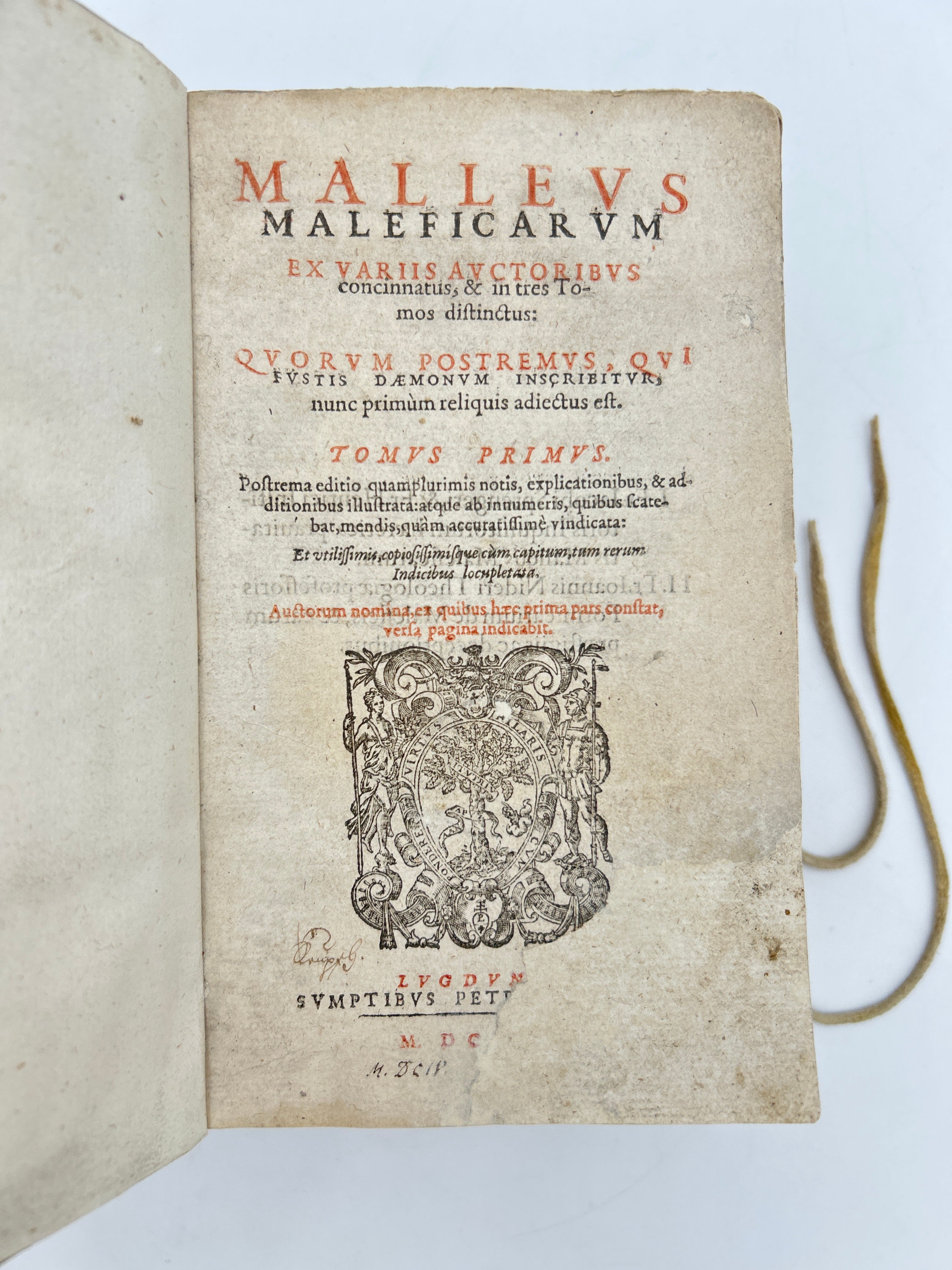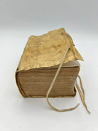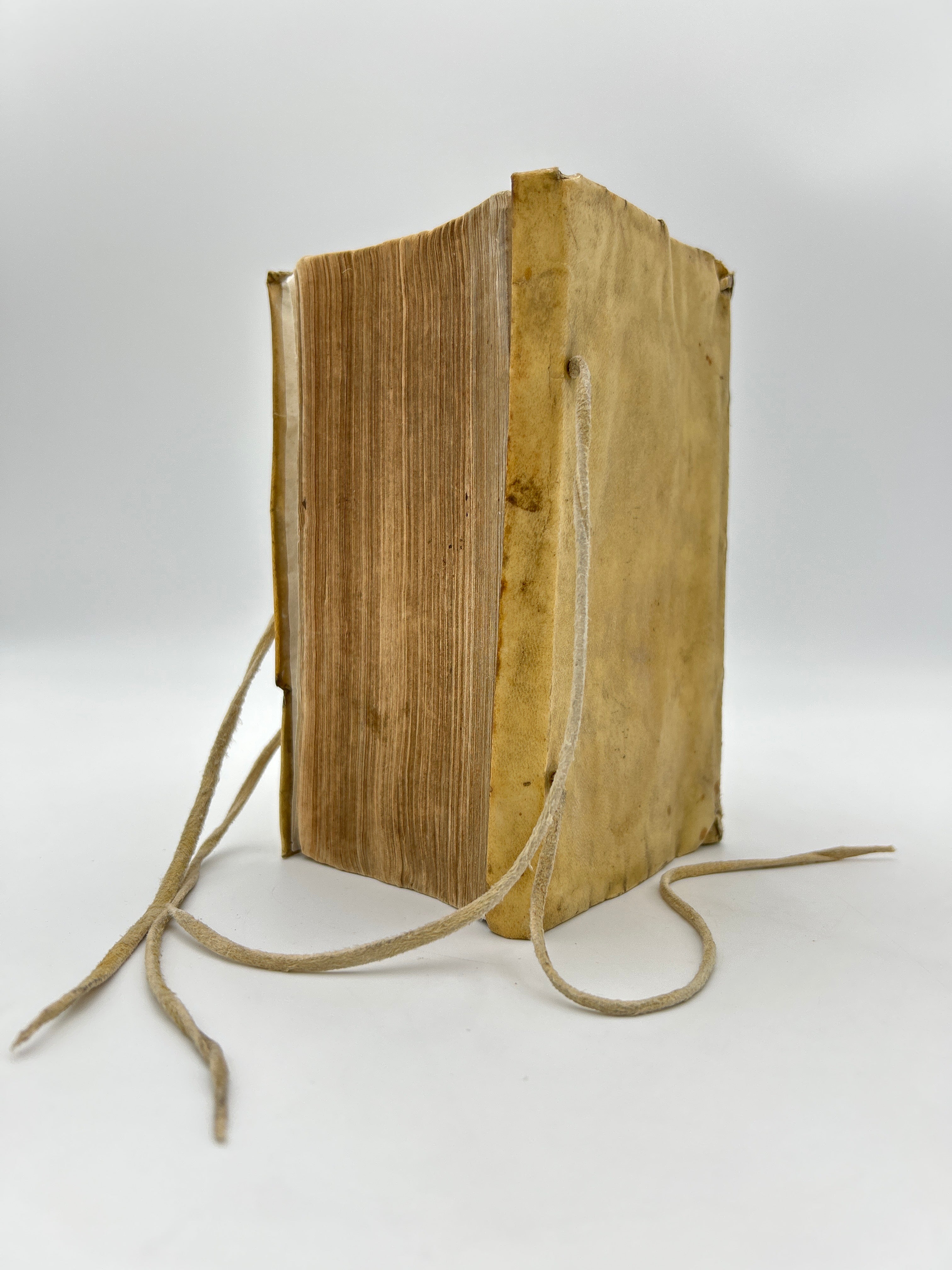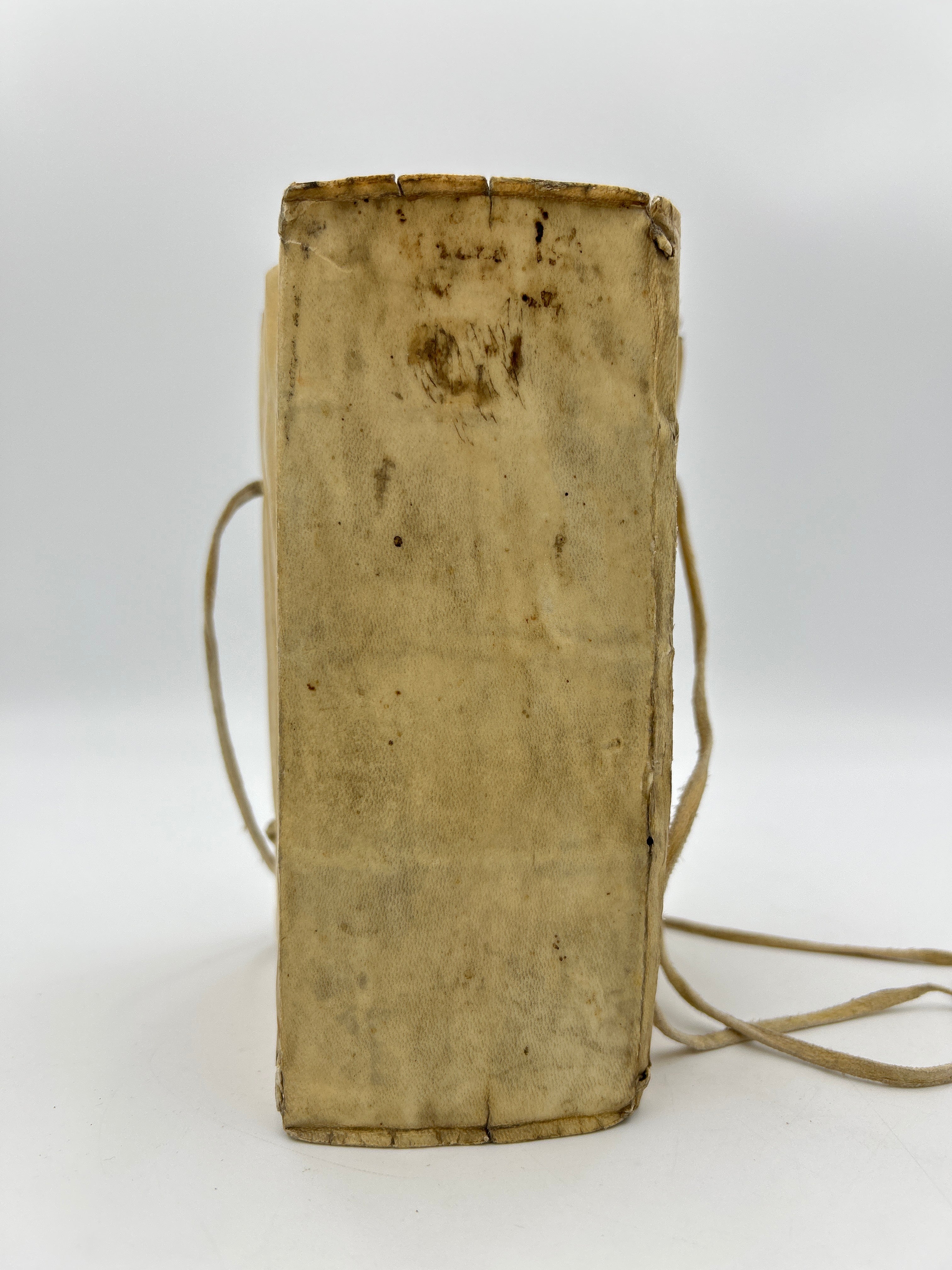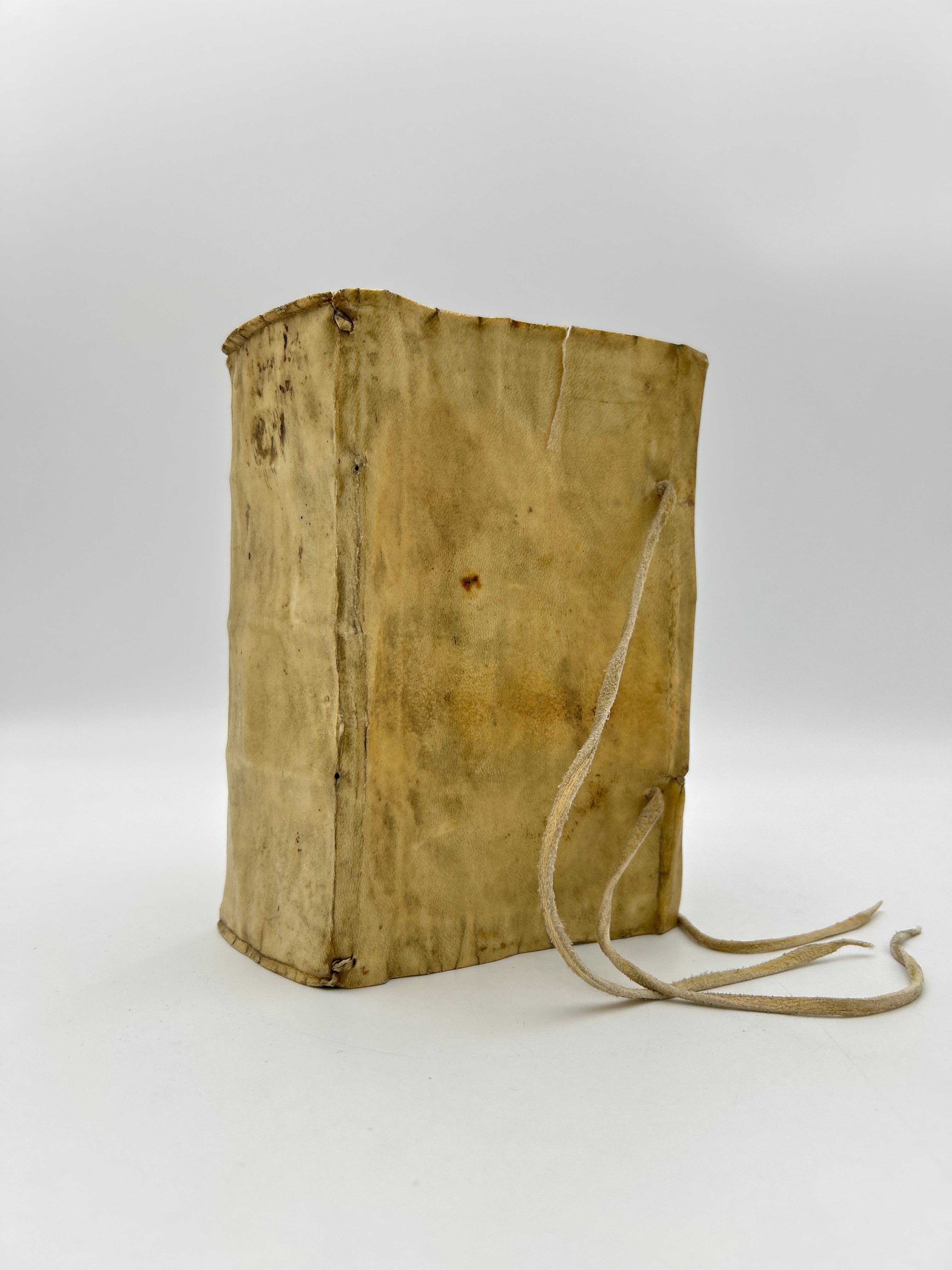 Vellum binding. Tear to upper board. Four white leather ties. Fading inscription to spine. Wear to vellum binding causing ripples in the covers and spine. Several slight cuts into the extremities and discoloration to binding. Red and black lettering to title page and woodcut illustration. Repaired tear to title page obstructing text and date. Very good condition all things considered.