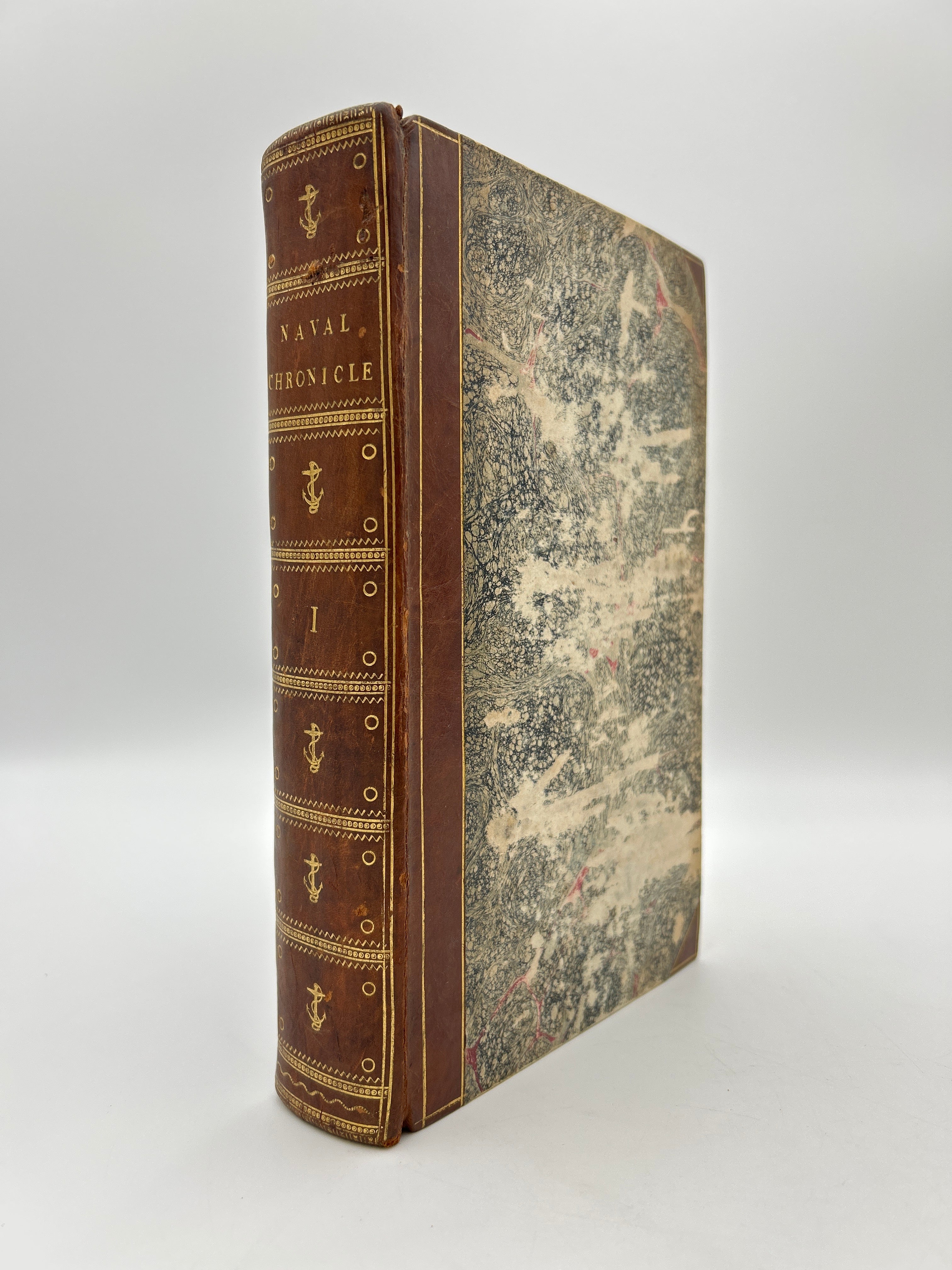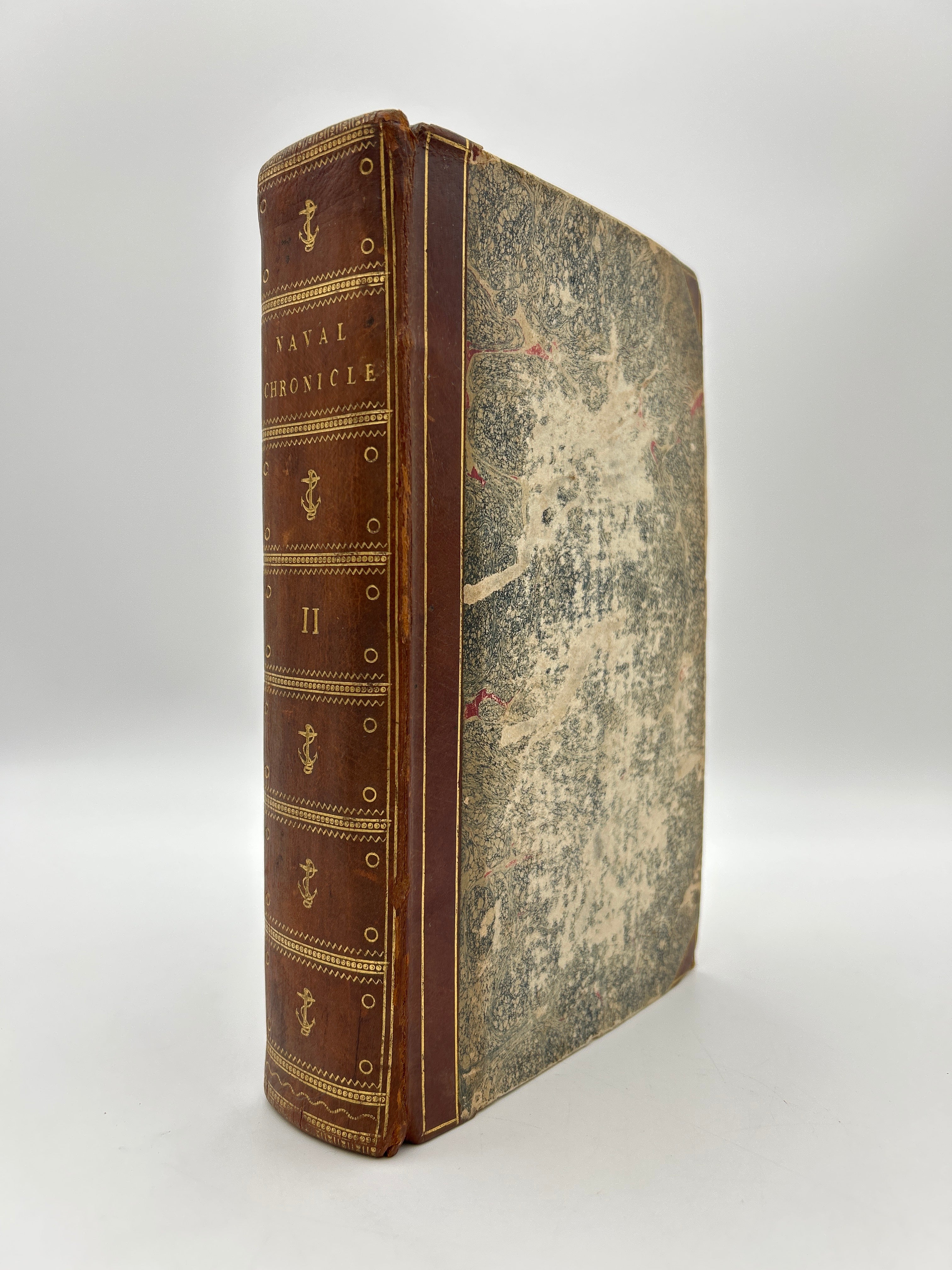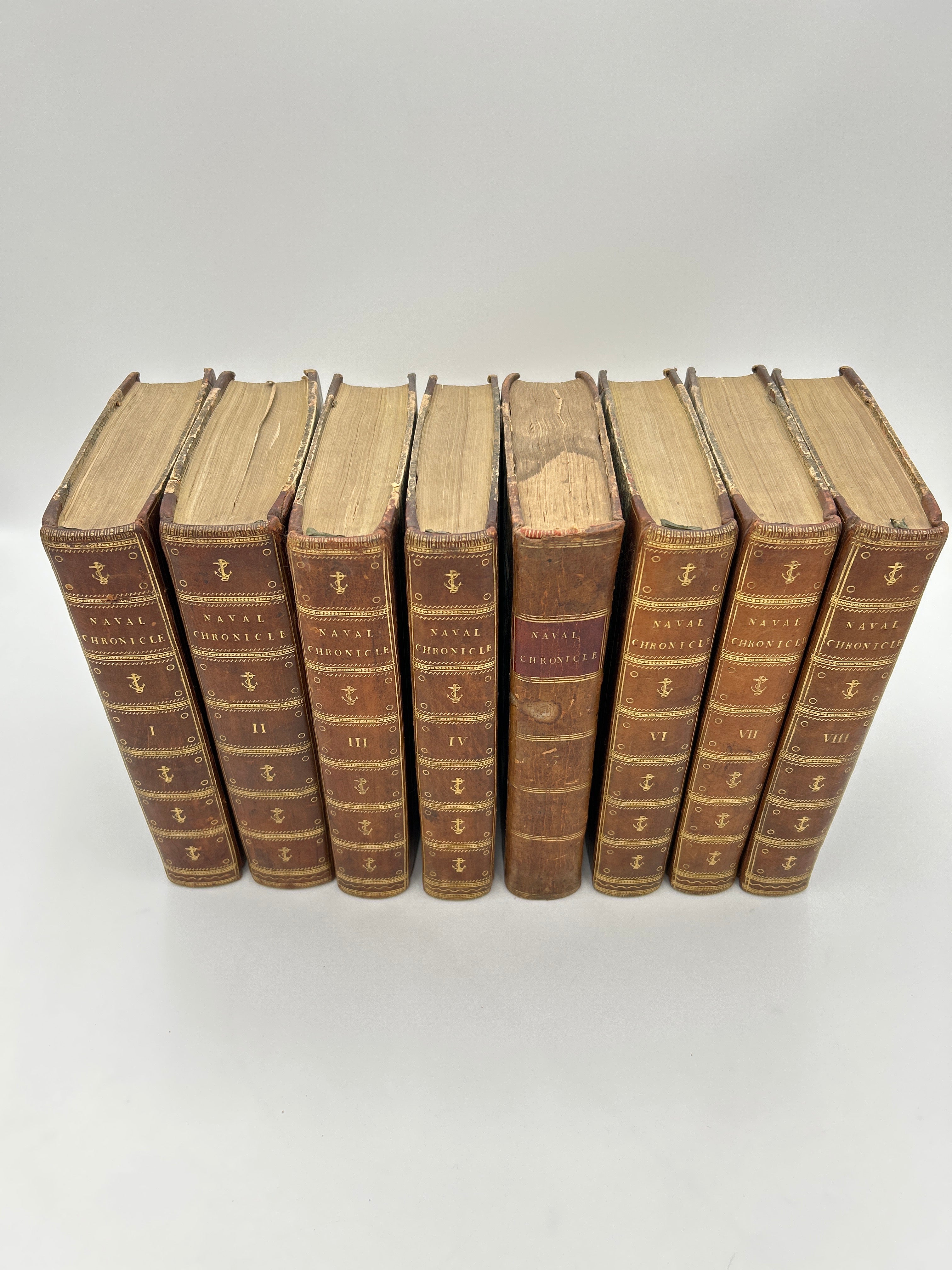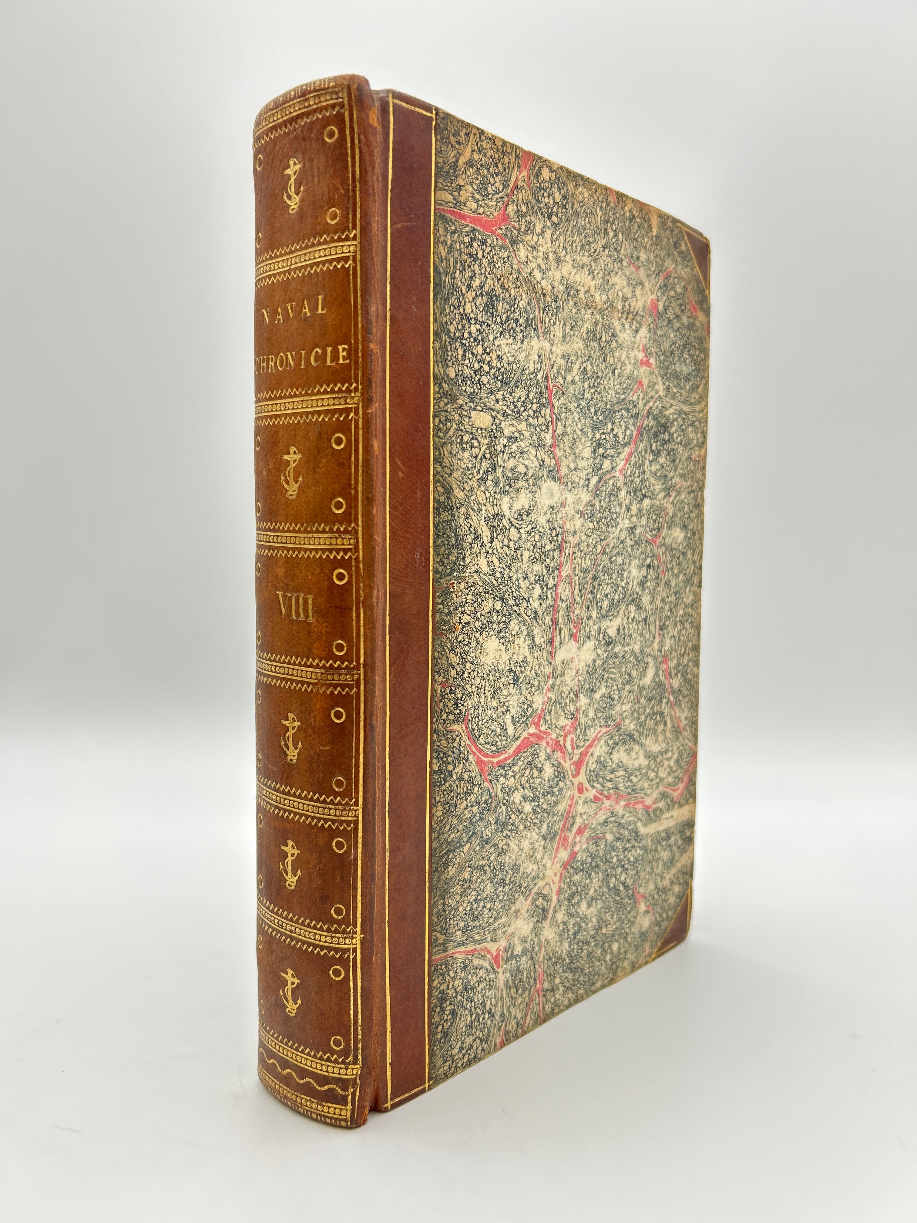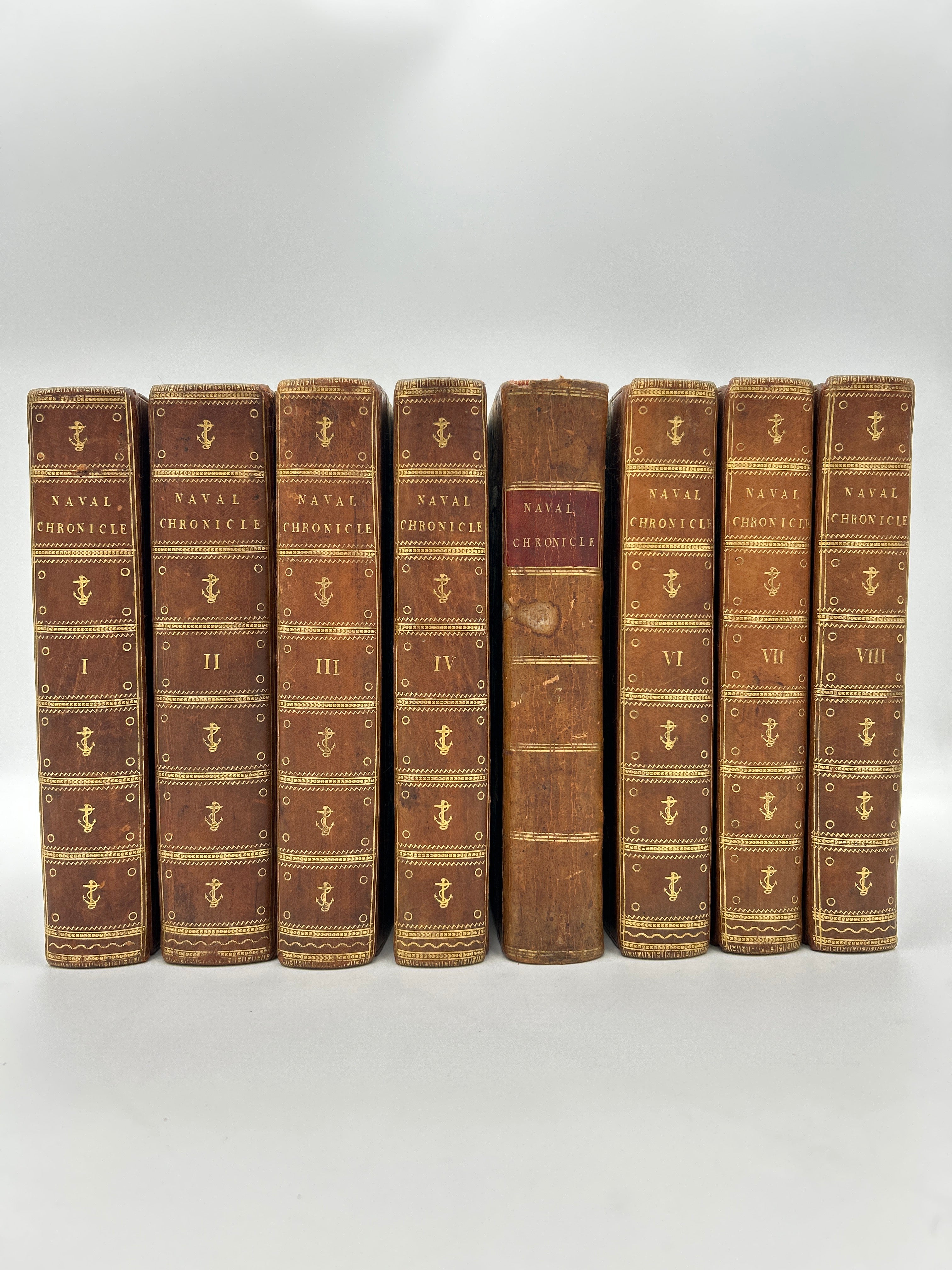 Eight volumes. 8vo in 4s. 232x140mm. Volume I, January to June 1799 has 13 plates including one folding map and two diagrams. Volume II, July to December 1799 has 12 plates and six charts and diagrams. Loosely inserted is an engraved portrait of Nelson with his signature on the endpaper. Volume III, January to July 1800 has 13 plates, plans, and diagrams. Volume IV July to January 1801 has 13 plates and maps. Volume V. January to July 1801 has 8 of 15 plates. Volume VI. July to December 1801 has 14 plates and diagrams. Volume VII January to July 1802 has 12 plates and maps including a chart of Newfoundland and a View of Wampooh in China. Volume VIII. July to December 1802. pp. viii, 520, [8]. 12 plates. Bound in half calf, marbled paper covered boards, flat spines decorated in gilt with anchor motifs and lettered in gilt. Volume V is bound with different marbled paper and spine and is from a different set but the other seven are uniformly bound. Fine condition overall.