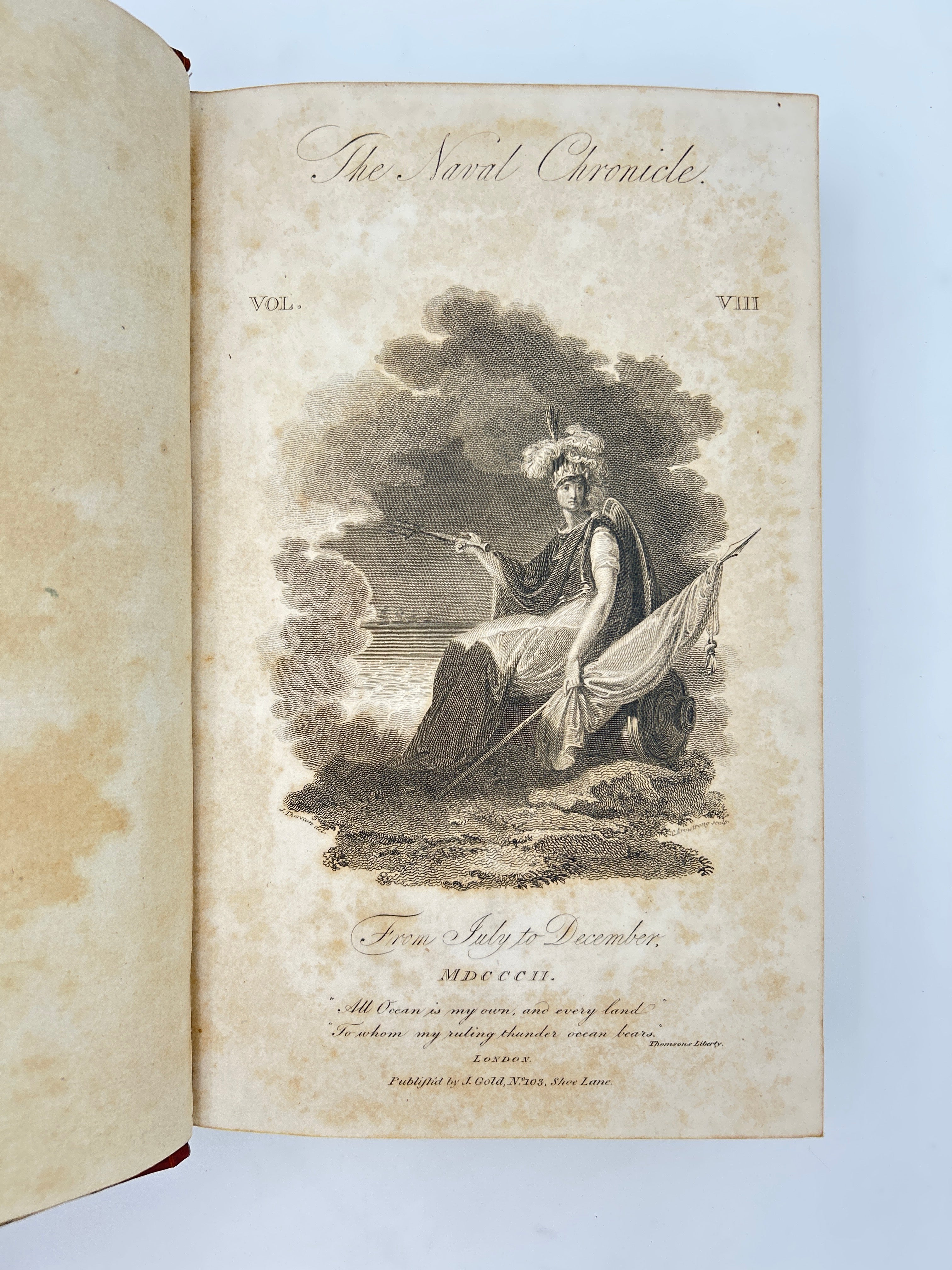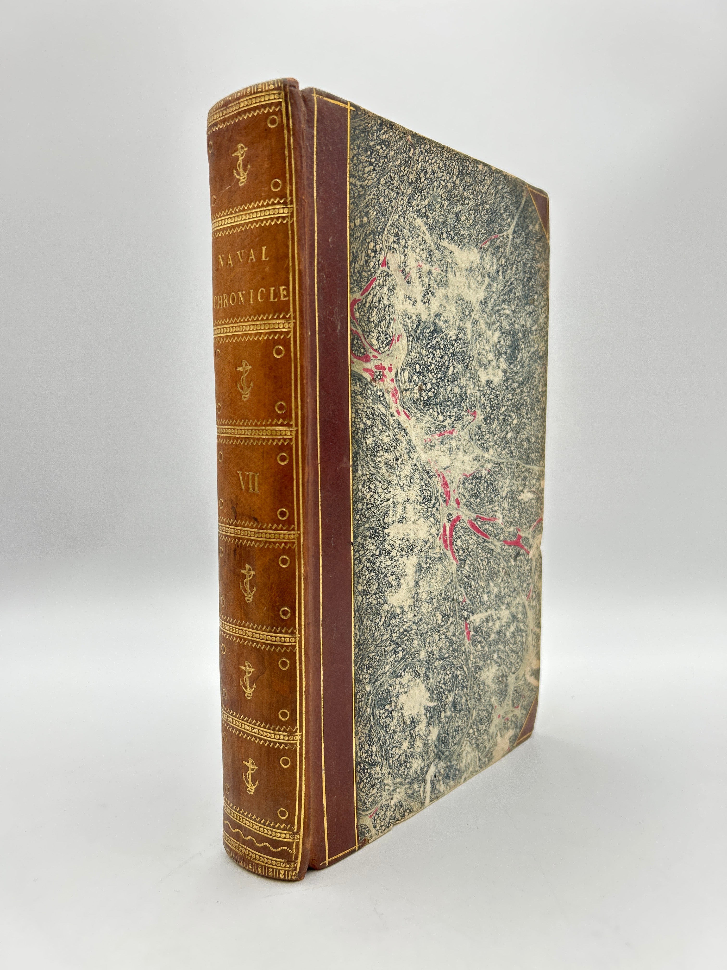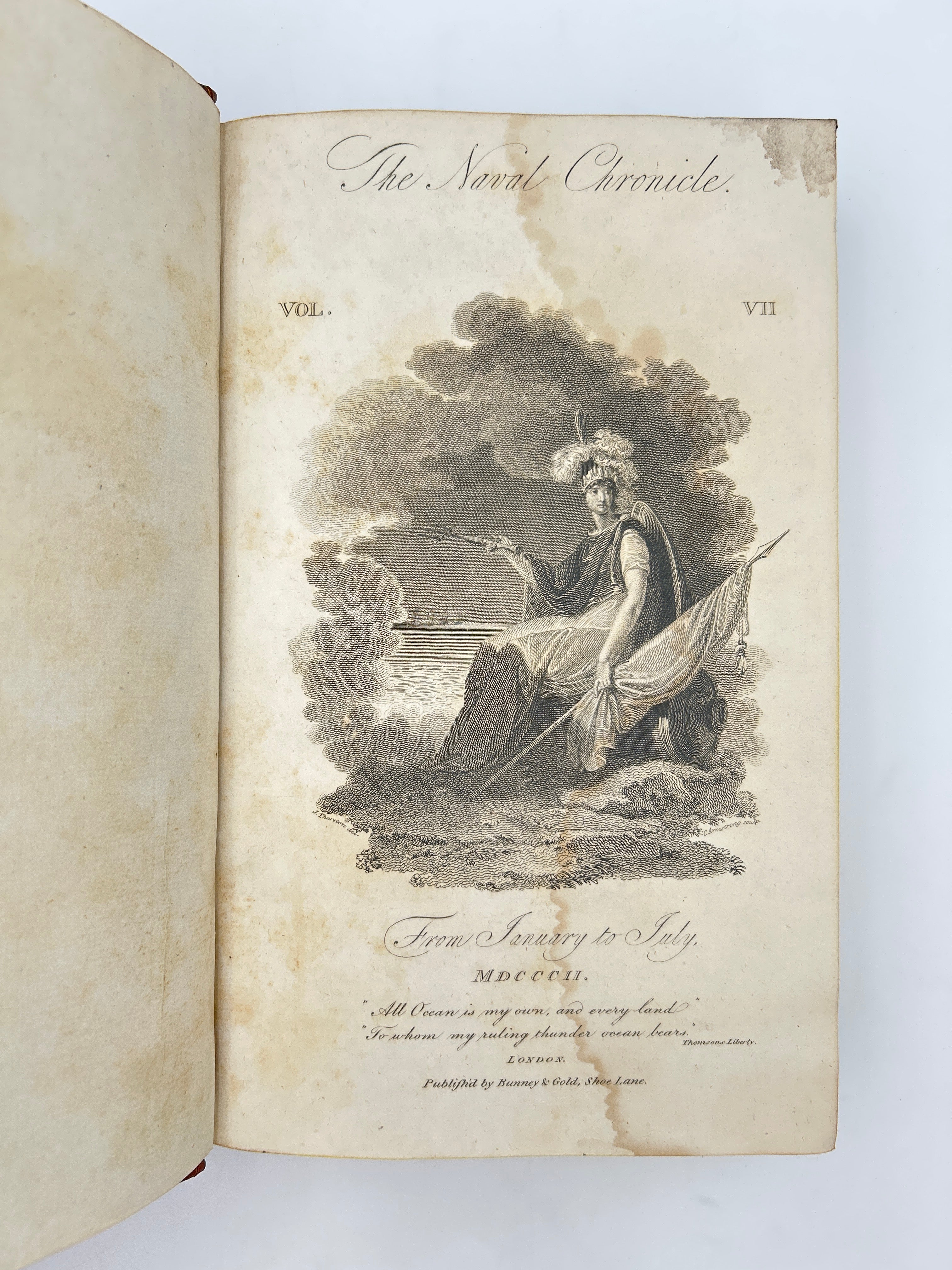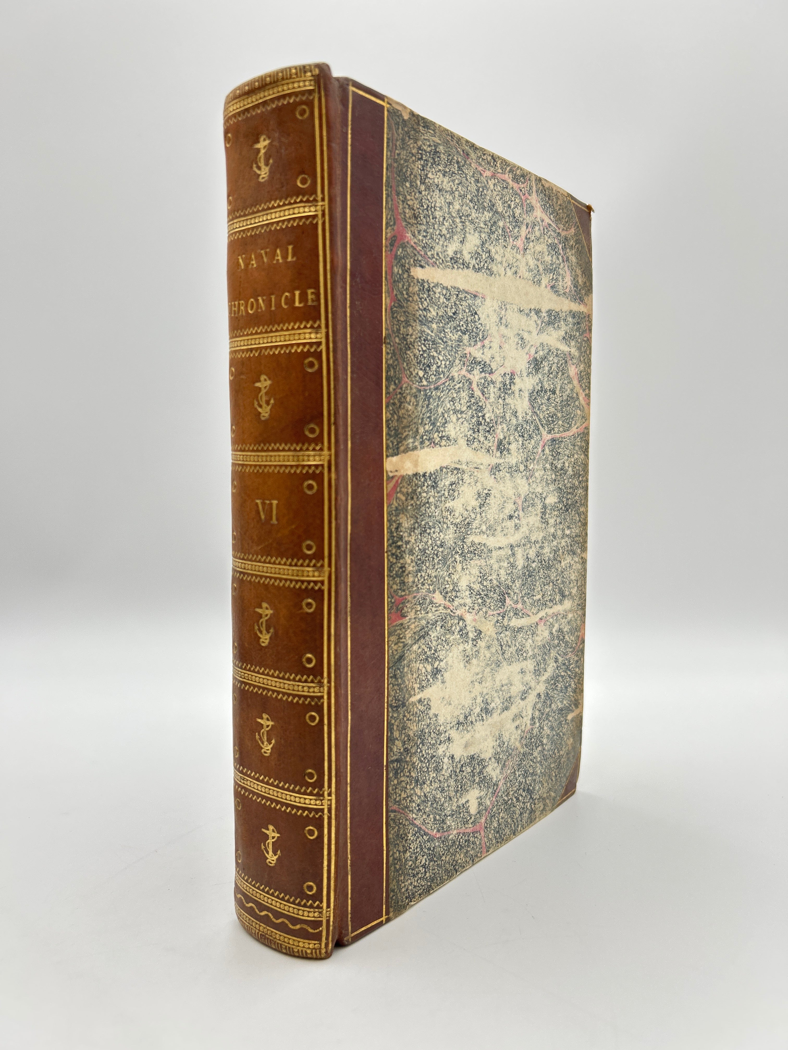 Eight volumes. 8vo in 4s. 232x140mm. Volume I, January to June 1799 has 13 plates including one folding map and two diagrams. Volume II, July to December 1799 has 12 plates and six charts and diagrams. Loosely inserted is an engraved portrait of Nelson with his signature on the endpaper. Volume III, January to July 1800 has 13 plates, plans, and diagrams. Volume IV July to January 1801 has 13 plates and maps. Volume V. January to July 1801 has 8 of 15 plates. Volume VI. July to December 1801 has 14 plates and diagrams. Volume VII January to July 1802 has 12 plates and maps including a chart of Newfoundland and a View of Wampooh in China. Volume VIII. July to December 1802. pp. viii, 520, [8]. 12 plates. Bound in half calf, marbled paper covered boards, flat spines decorated in gilt with anchor motifs and lettered in gilt. Volume V is bound with different marbled paper and spine and is from a different set but the other seven are uniformly bound. Fine condition overall.
