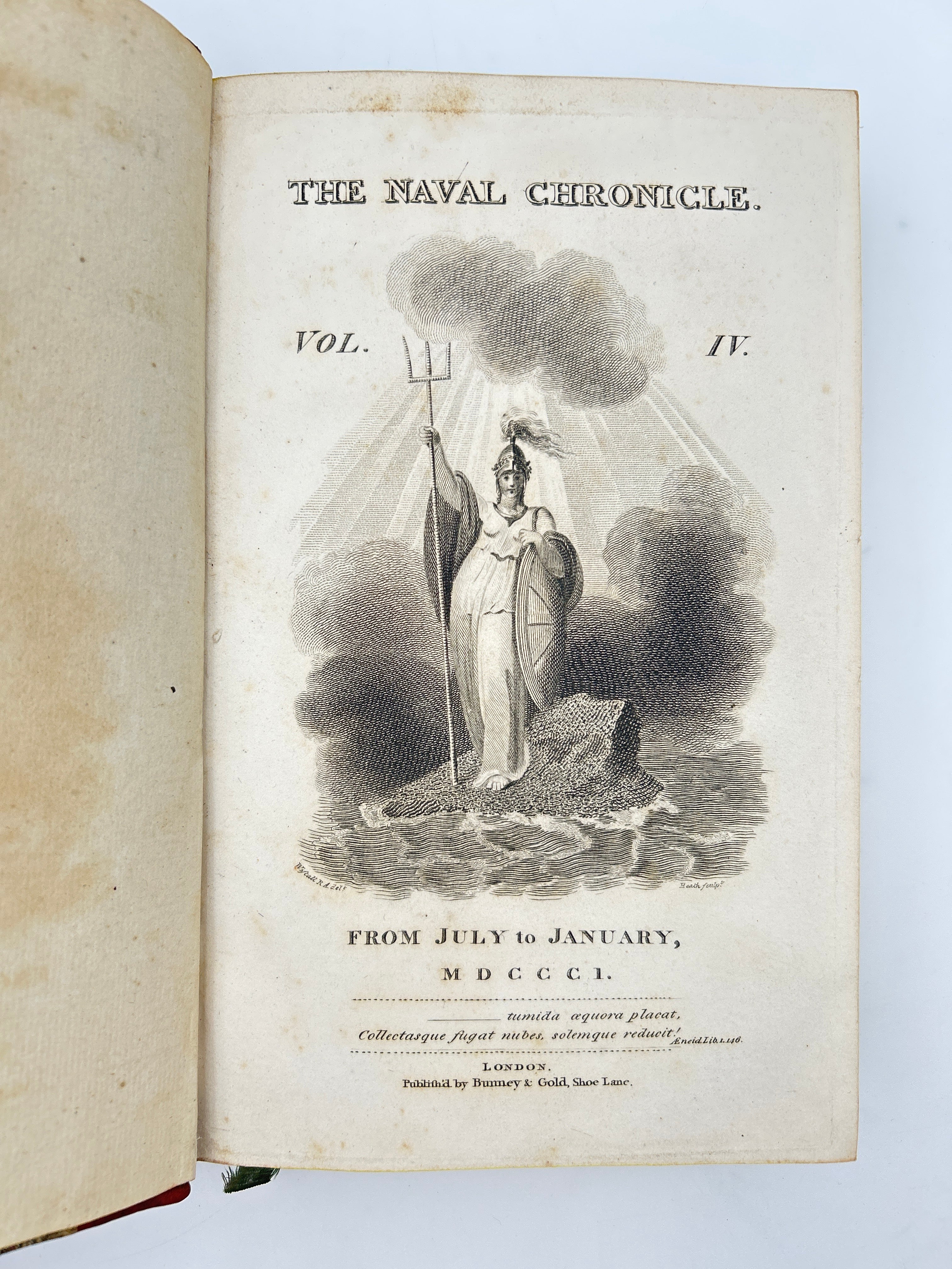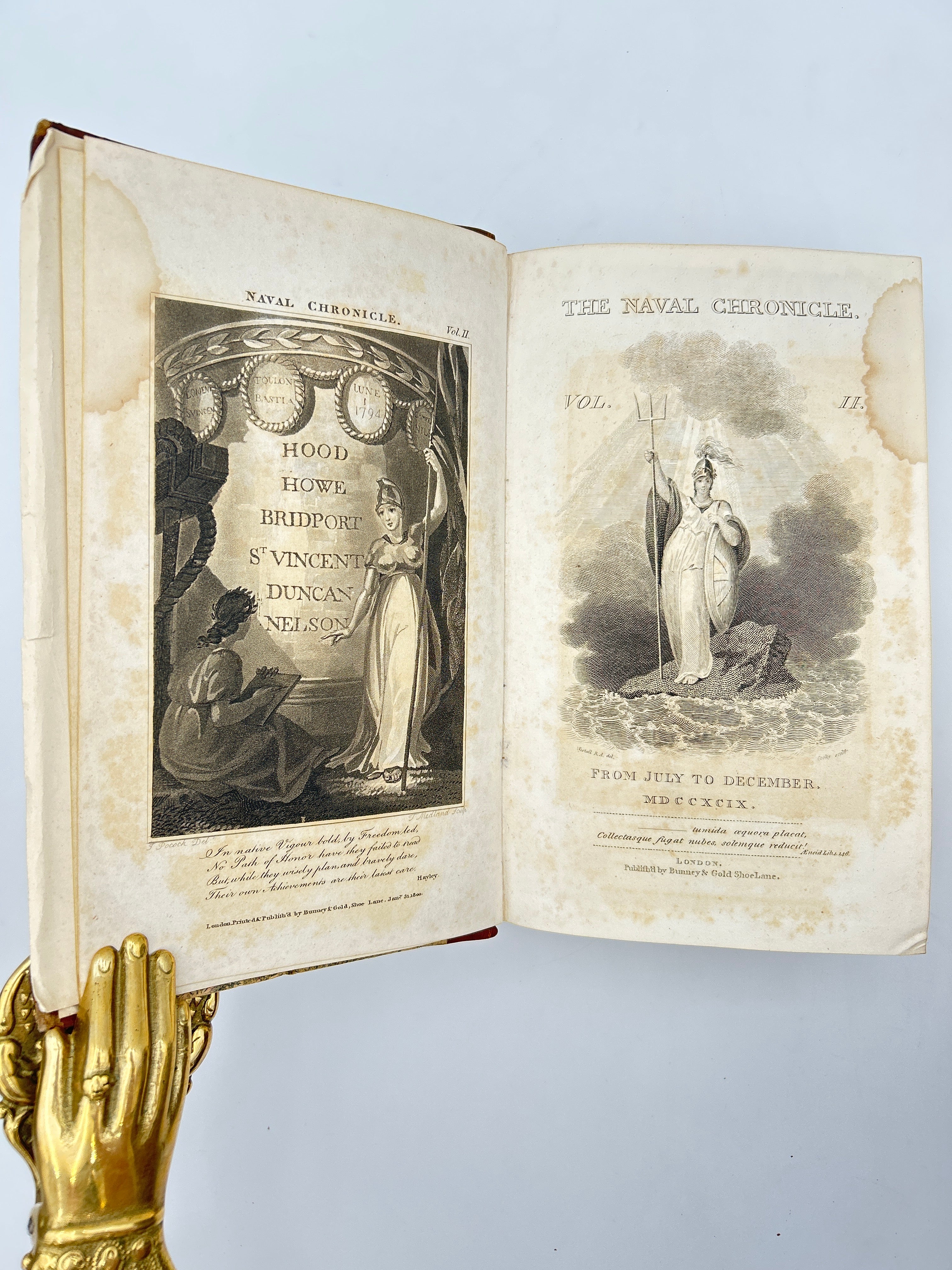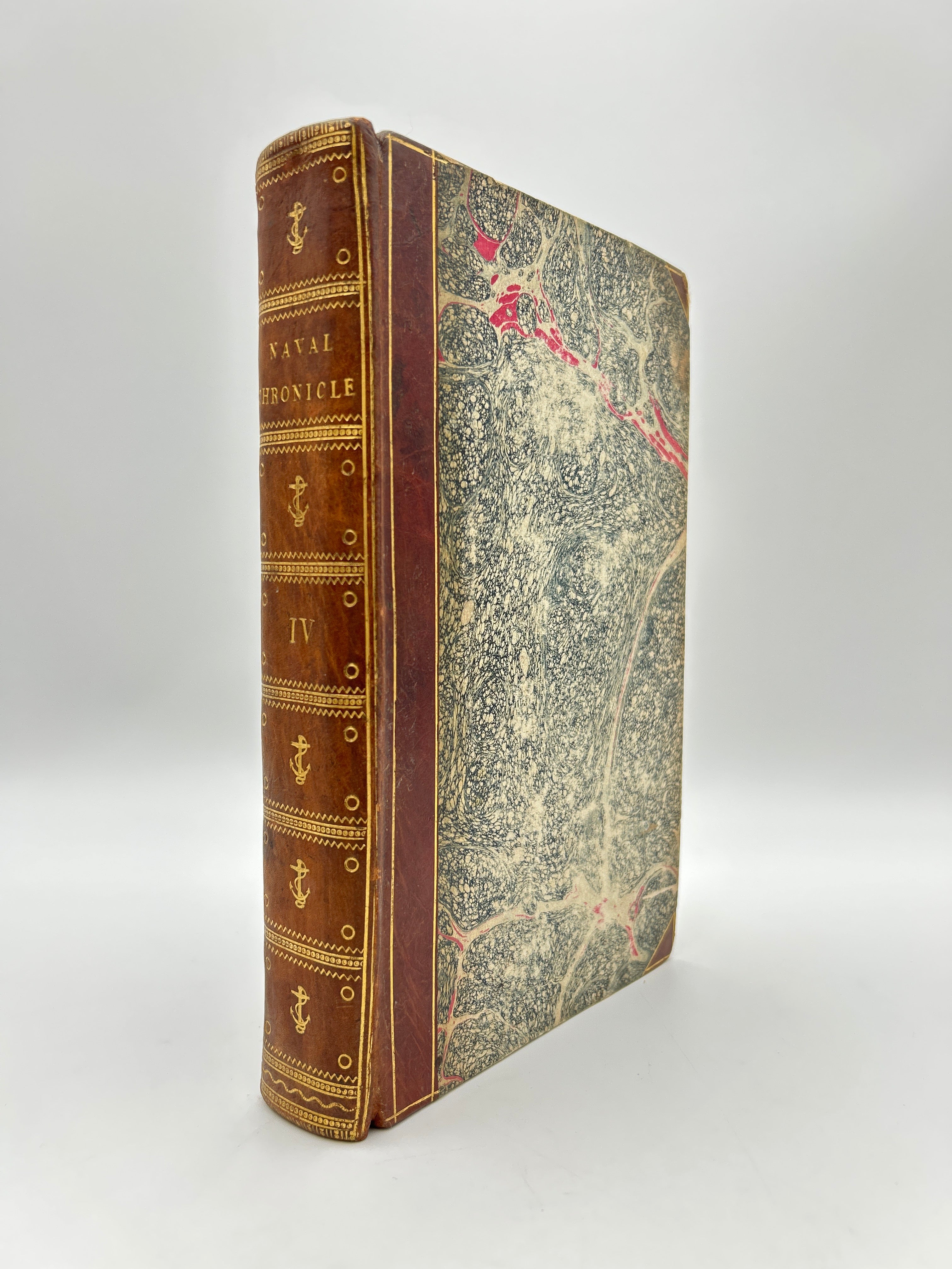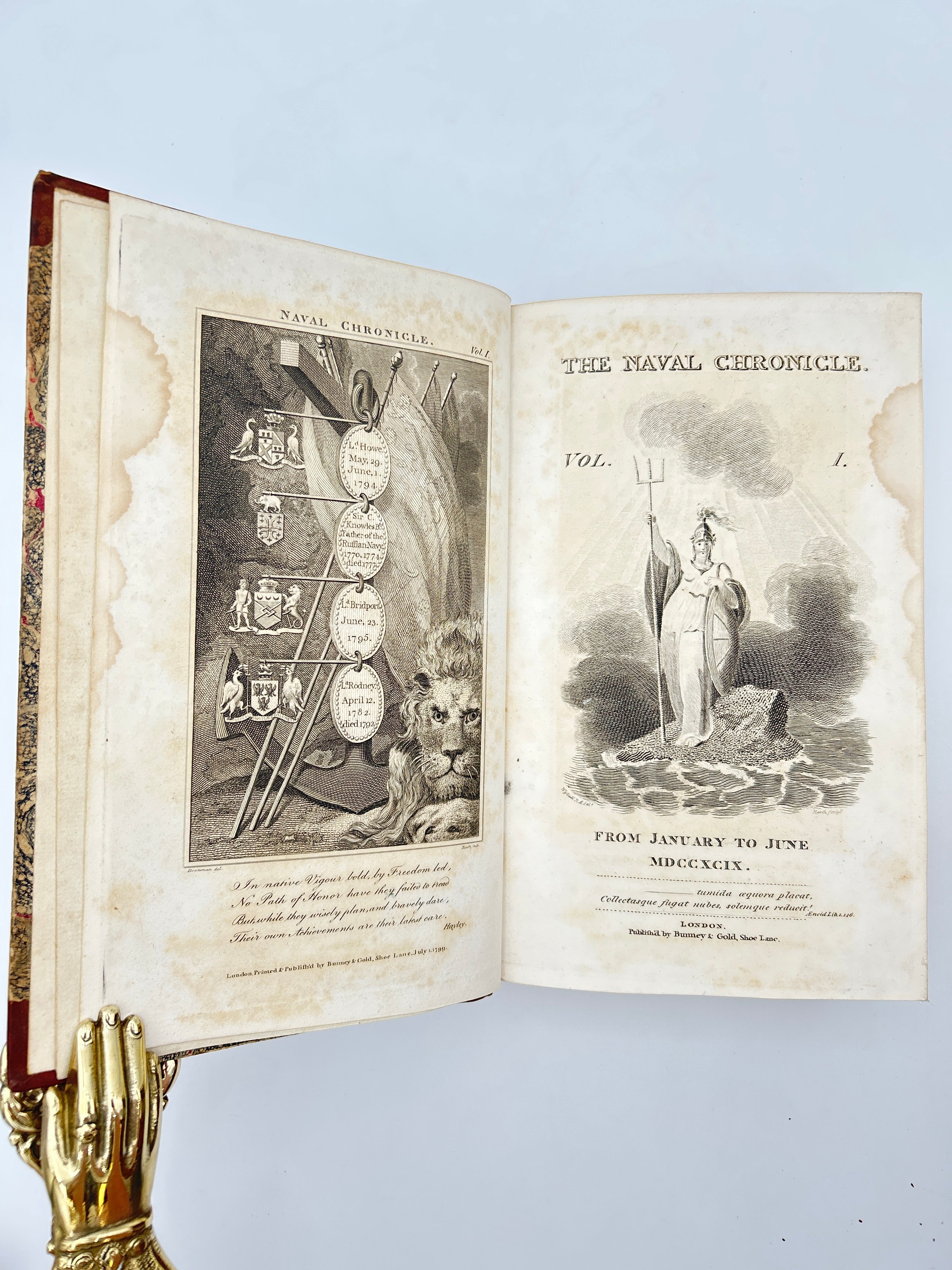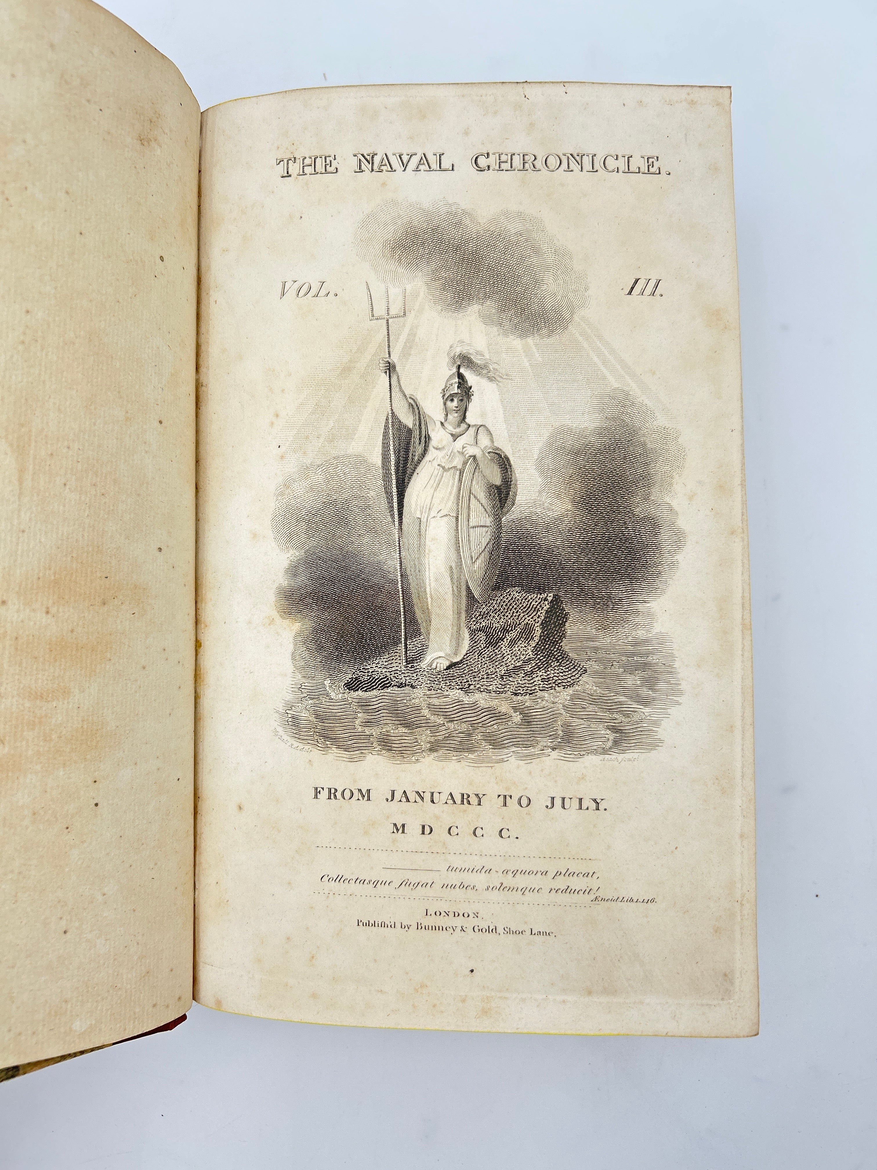 Eight volumes. 8vo in 4s. 232x140mm. Volume I, January to June 1799 has 13 plates including one folding map and two diagrams. Volume II, July to December 1799 has 12 plates and six charts and diagrams. Loosely inserted is an engraved portrait of Nelson with his signature on the endpaper. Volume III, January to July 1800 has 13 plates, plans, and diagrams. Volume IV July to January 1801 has 13 plates and maps. Volume V. January to July 1801 has 8 of 15 plates. Volume VI. July to December 1801 has 14 plates and diagrams. Volume VII January to July 1802 has 12 plates and maps including a chart of Newfoundland and a View of Wampooh in China. Volume VIII. July to December 1802. pp. viii, 520, [8]. 12 plates. Bound in half calf, marbled paper covered boards, flat spines decorated in gilt with anchor motifs and lettered in gilt. Volume V is bound with different marbled paper and spine and is from a different set but the other seven are uniformly bound. Fine condition overall.