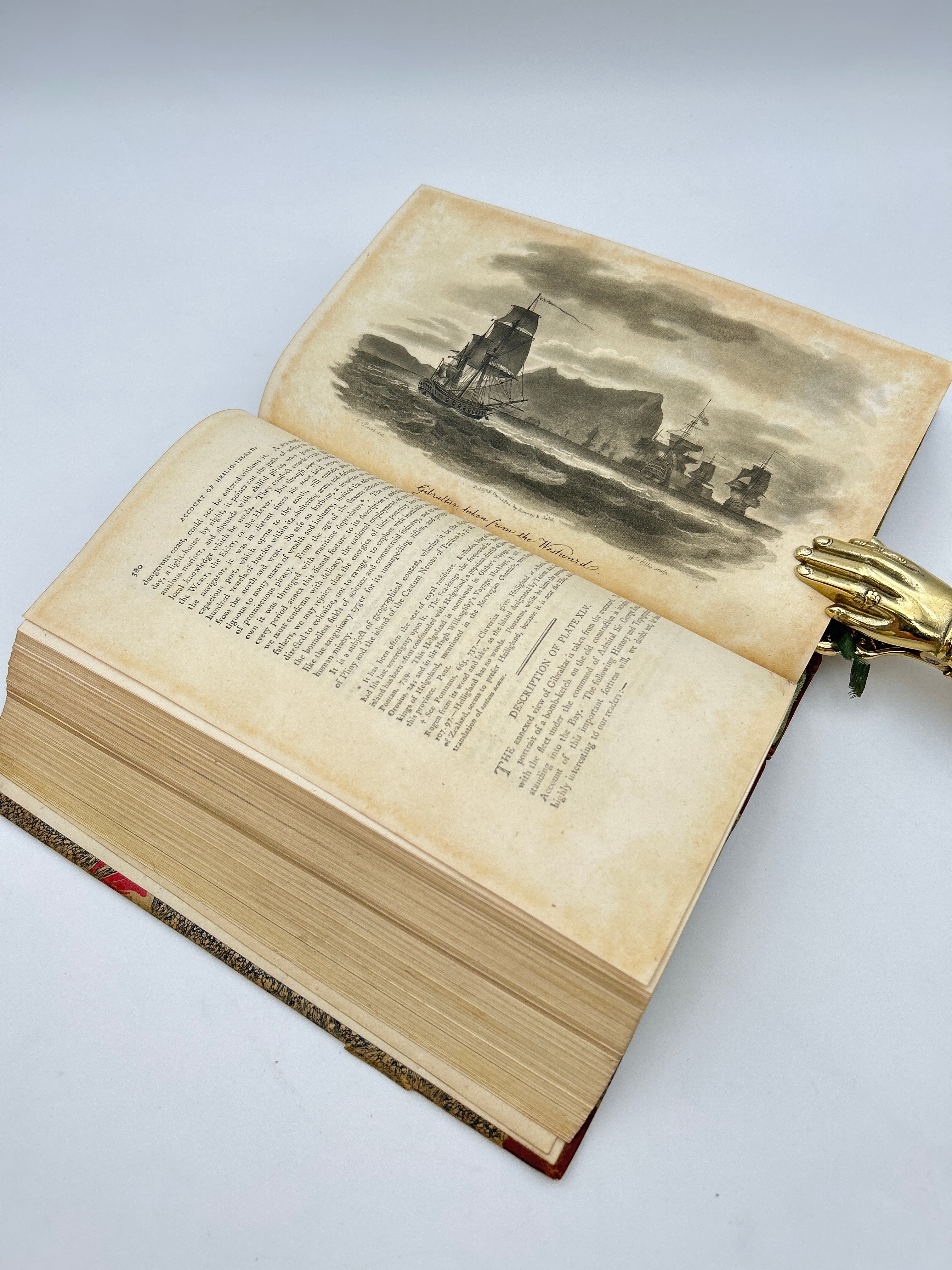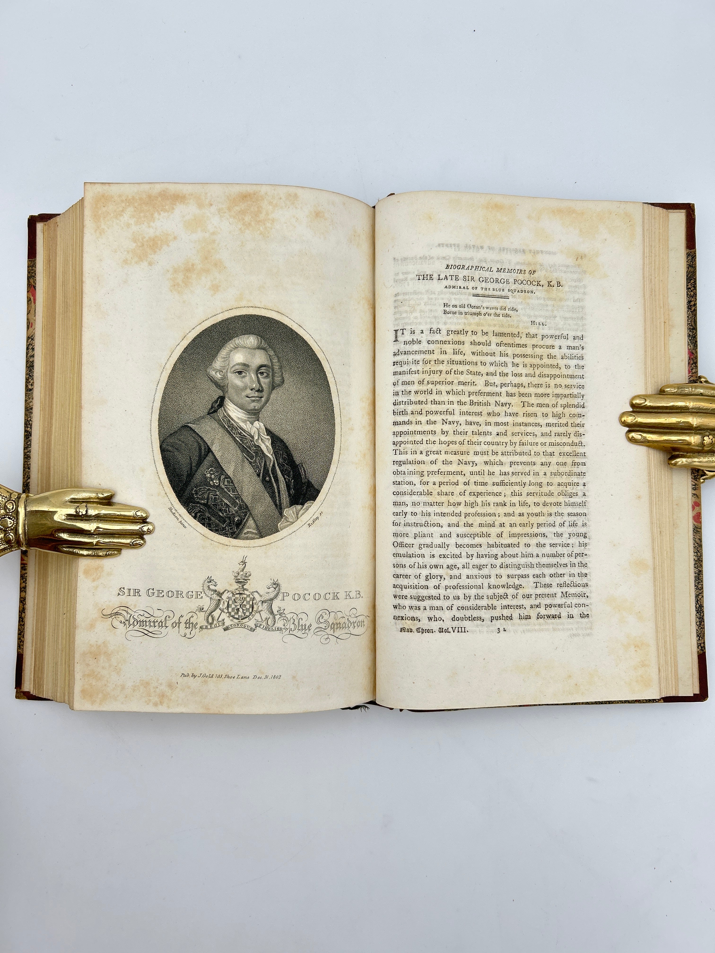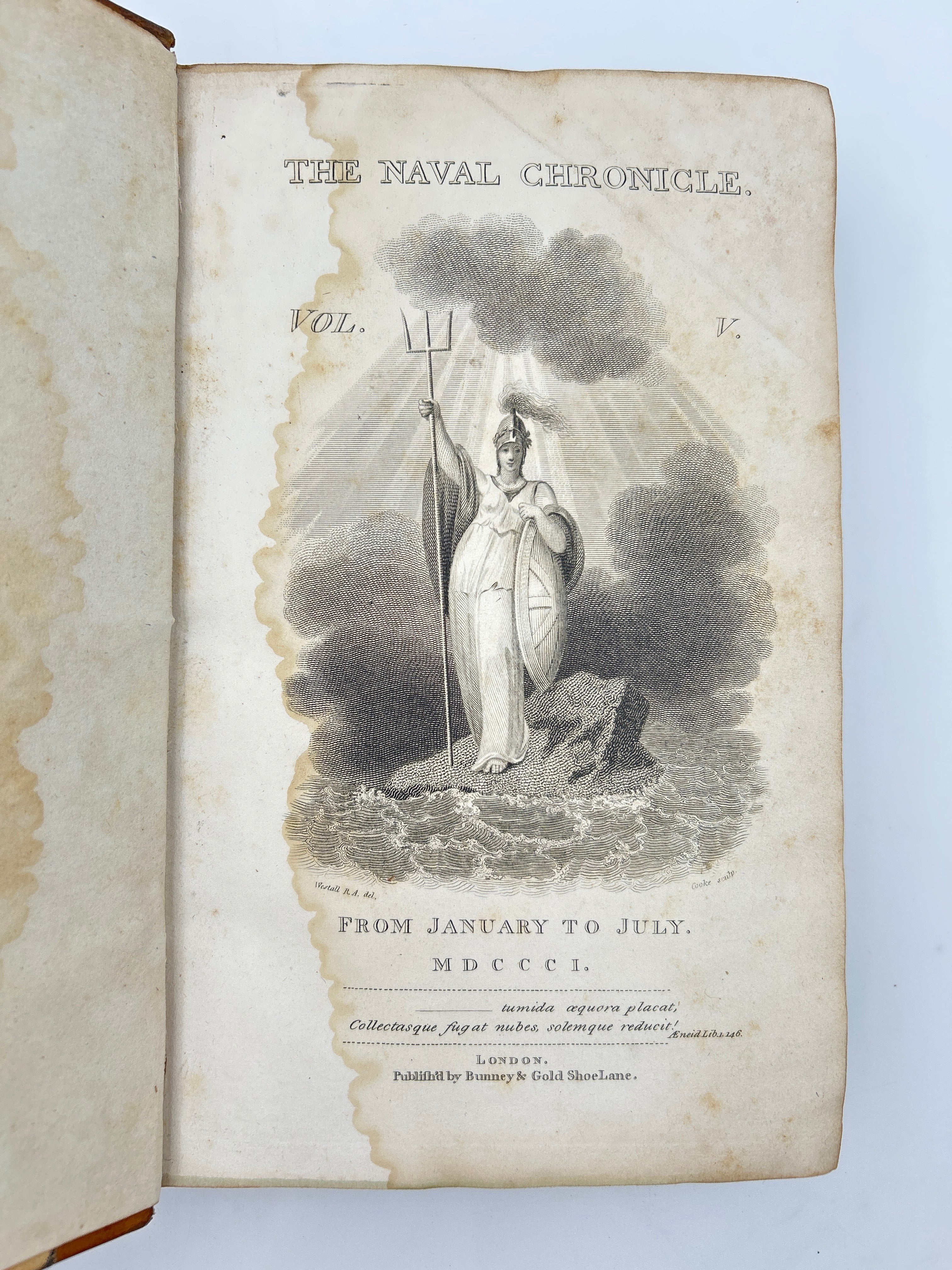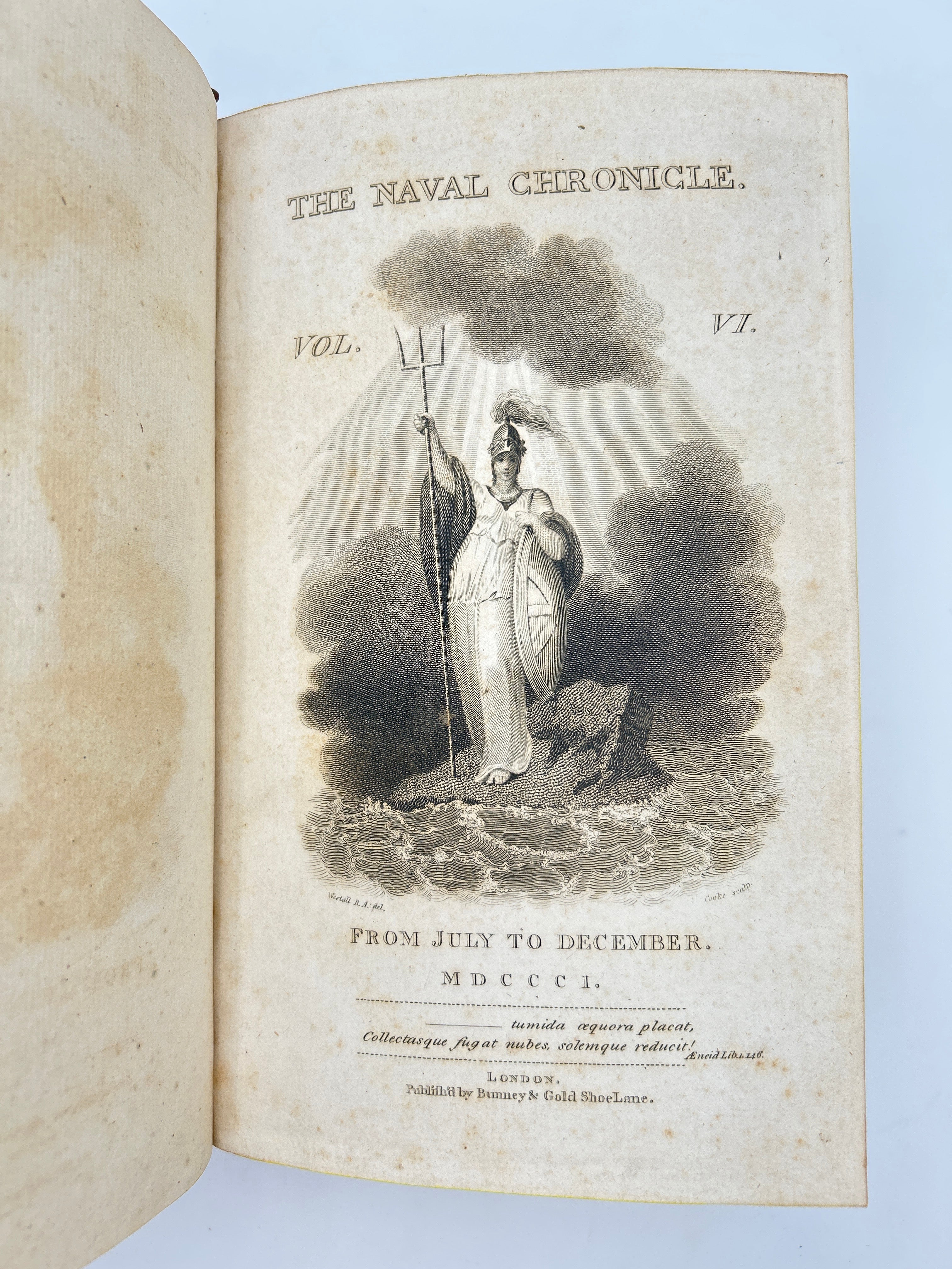 Eight volumes. 8vo in 4s. 232x140mm. Volume I, January to June 1799 has 13 plates including one folding map and two diagrams. Volume II, July to December 1799 has 12 plates and six charts and diagrams. Loosely inserted is an engraved portrait of Nelson with his signature on the endpaper. Volume III, January to July 1800 has 13 plates, plans, and diagrams. Volume IV July to January 1801 has 13 plates and maps. Volume V. January to July 1801 has 8 of 15 plates. Volume VI. July to December 1801 has 14 plates and diagrams. Volume VII January to July 1802 has 12 plates and maps including a chart of Newfoundland and a View of Wampooh in China. Volume VIII. July to December 1802. pp. viii, 520, [8]. 12 plates. Bound in half calf, marbled paper covered boards, flat spines decorated in gilt with anchor motifs and lettered in gilt. Volume V is bound with different marbled paper and spine and is from a different set but the other seven are uniformly bound. Fine condition overall.