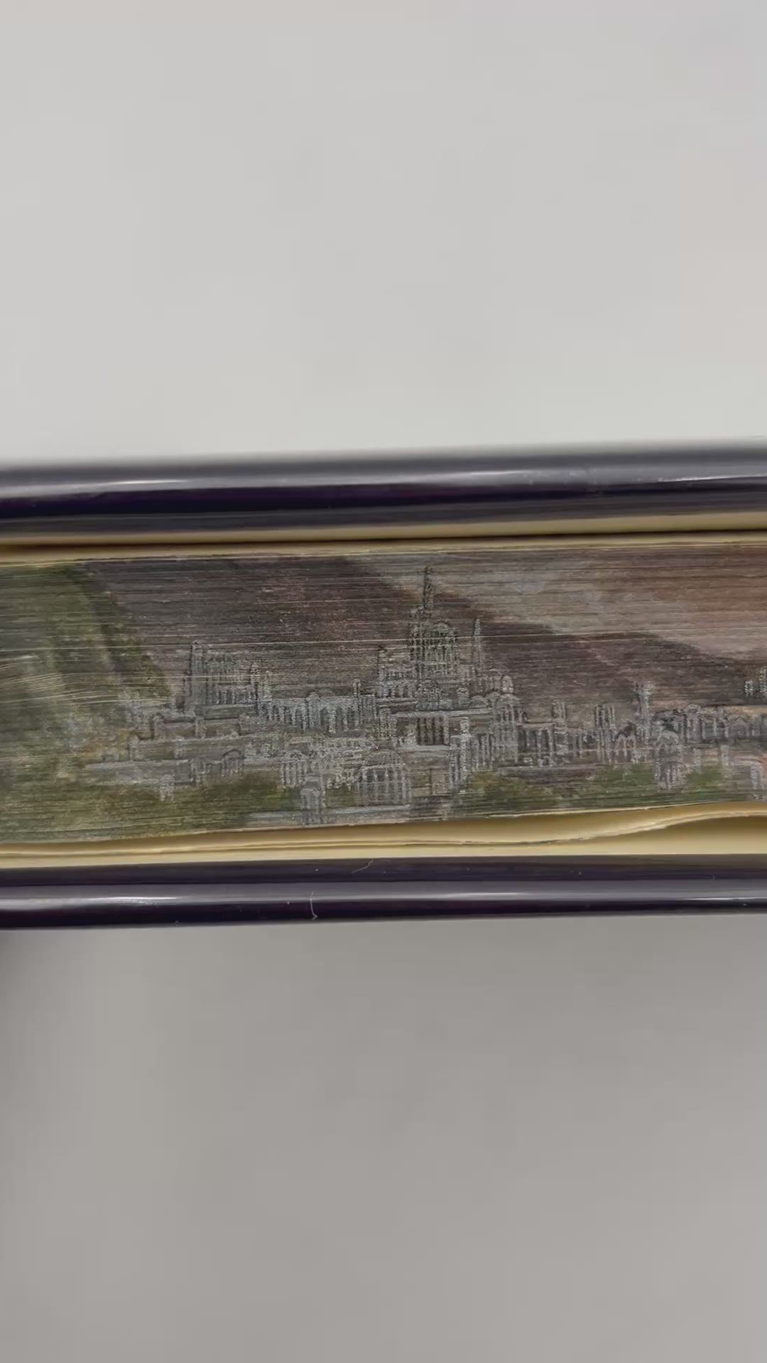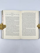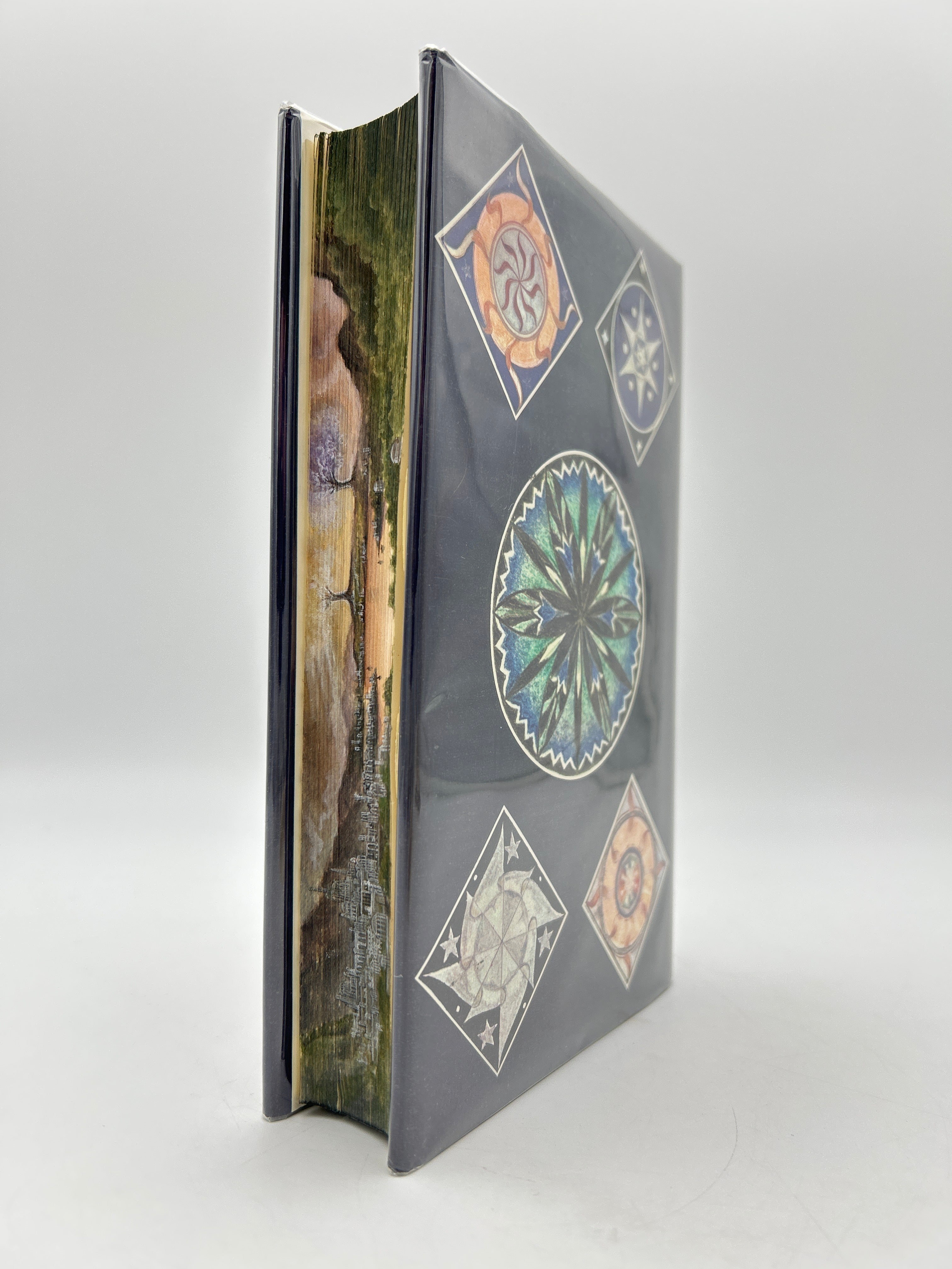Maisie Matilda is a contemporary British artist who specializes in a modern take on the old art of fore-edge paintings. Her work blends fine detail with a deep appreciation for mythic storytelling, often drawing inspiration from classic works of fantasy literature. In her fore-edge design for The Silmarillion, she depicts the radiant Elvish realm in luminous, layered tones, centering the composition on the Two Trees of Valinor—Telperion and Laurelin—whose silver and golden light defined the earliest age of Tolkien’s world. The glowing trees rise against an ethereal landscape, capturing the beauty and sacred stillness of the Blessed Realm.