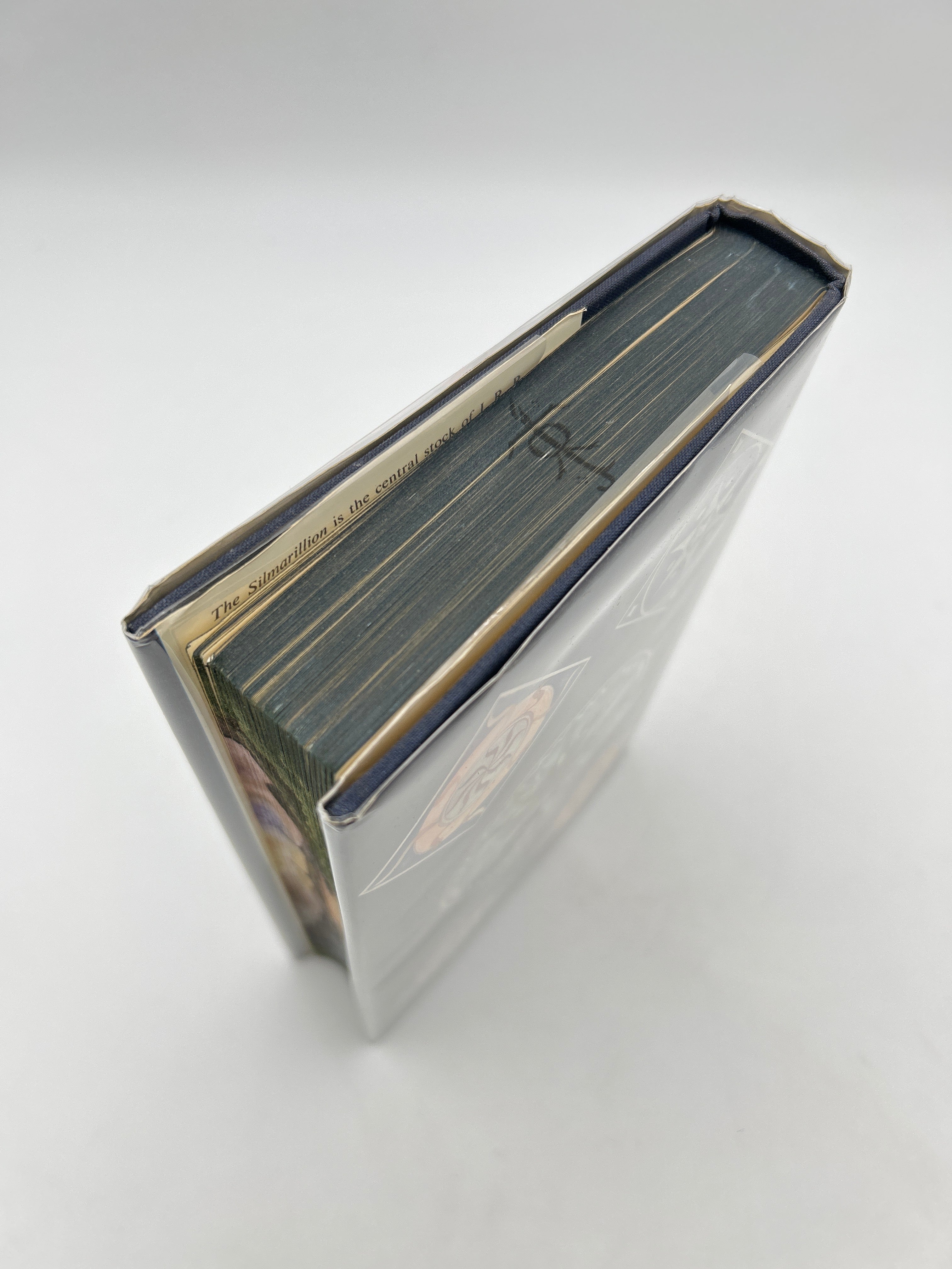 Original blue cloth binding with gilt lettering to spine. Original dust wrapper, very clean. All three edges painted by Maisie Matilda with Tolkien’s monogram on the upper edge, Valinor, Telperion, and Laurelin on fore edge, three copies of Tolkiens heraldic circles on lower edge. Very clean copy with no bumps or tears to binding or wrapper. Very fine condition.