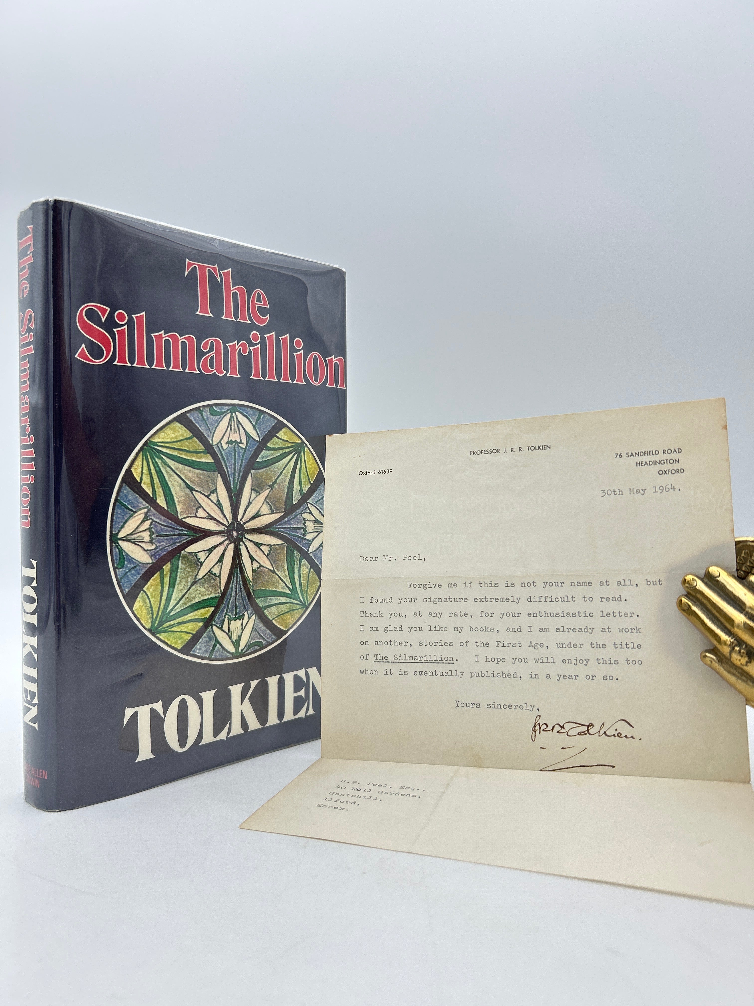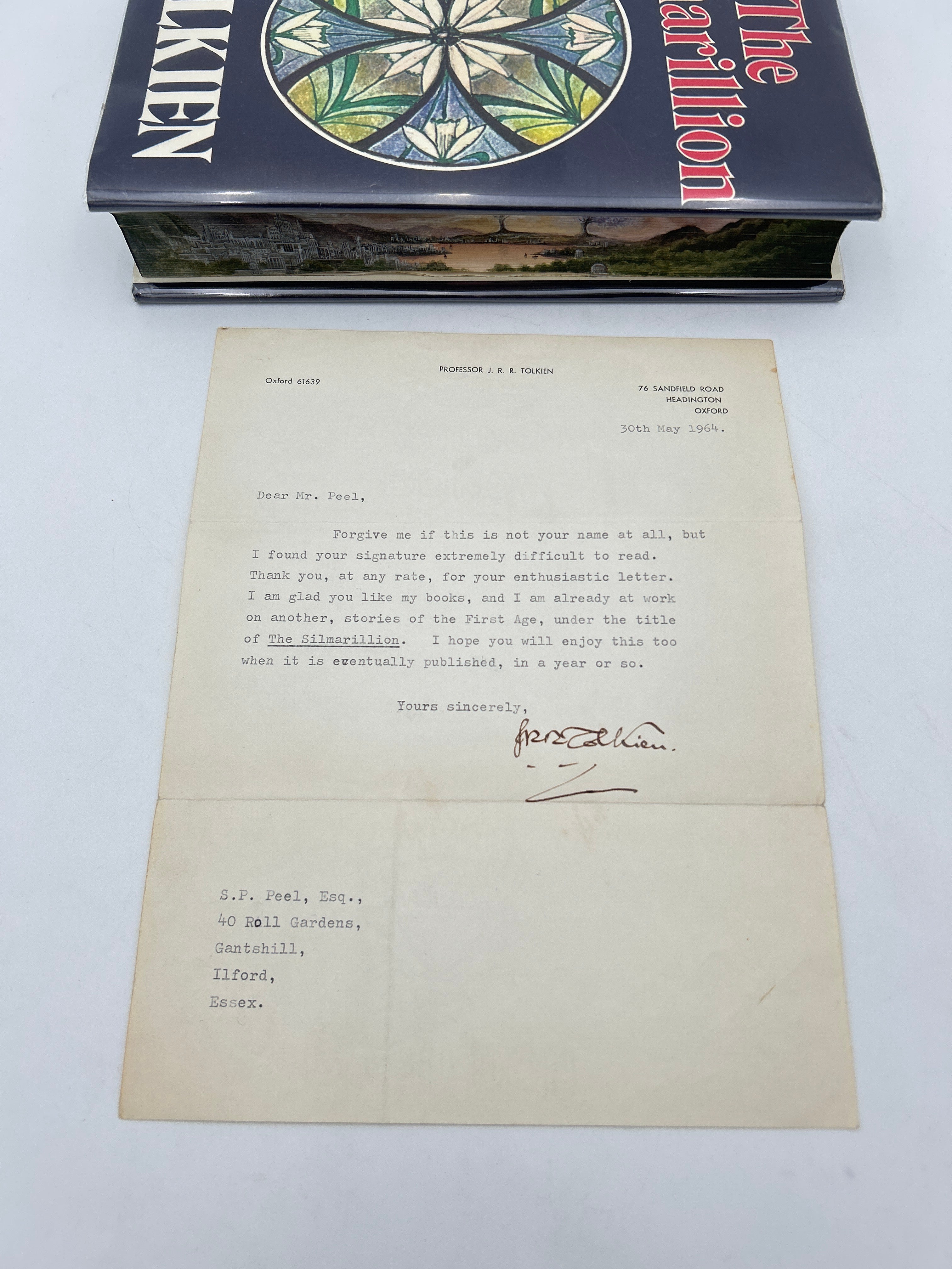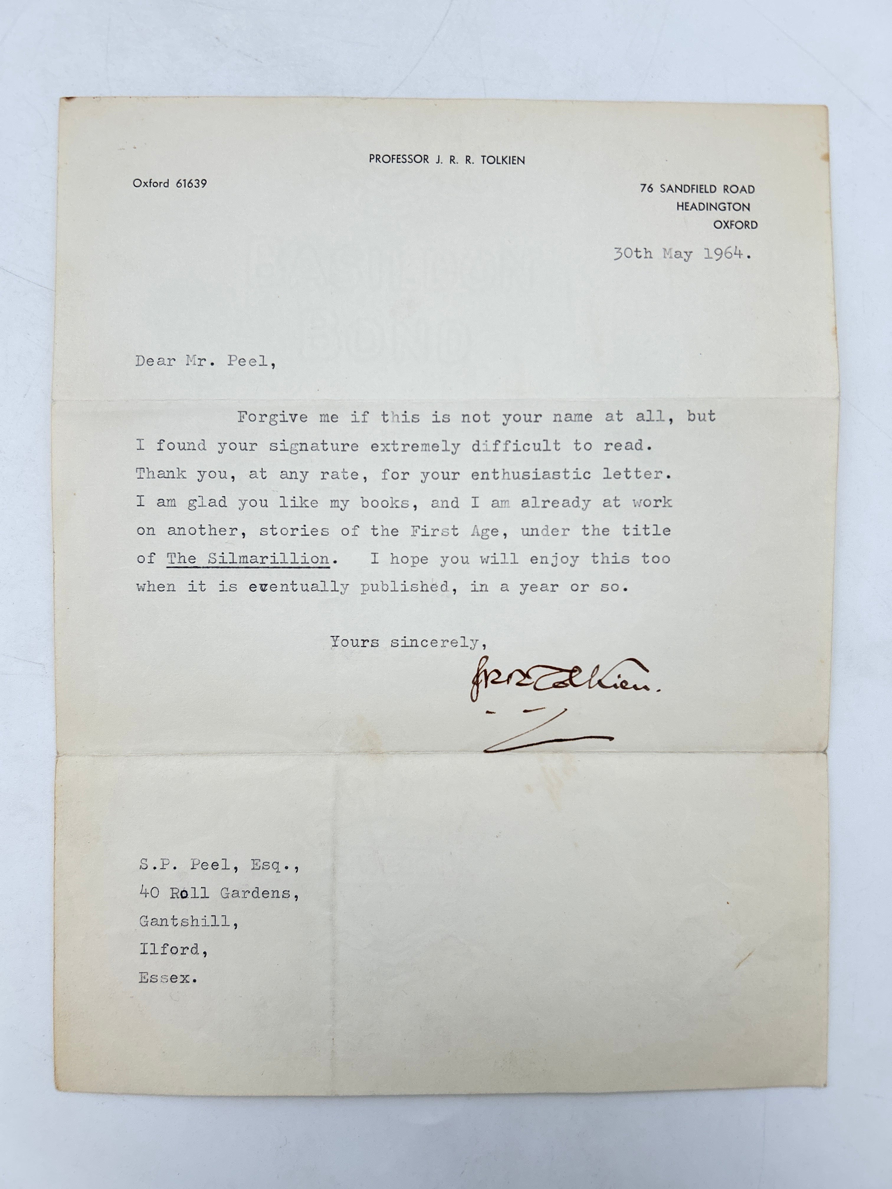Signed letter is folded in thirds. Composed on a typewriter and signed by J. R. R. Tolkien. Letter id dated 30th May 1964 and reads: “Dear Mr. Peel, Forgive me if this is not your name at all, but I found your signature extremely difficult to read. Thank you, at any rate, for your enthusiastic letter. I am glad you like my books, and I am already at work on another, stories of the First Age, under the title The Silmarillion. I hope you will enjoy this too when it is eventually published, in a year or so. Yours sincerely, J. R. R. Tolkien.”