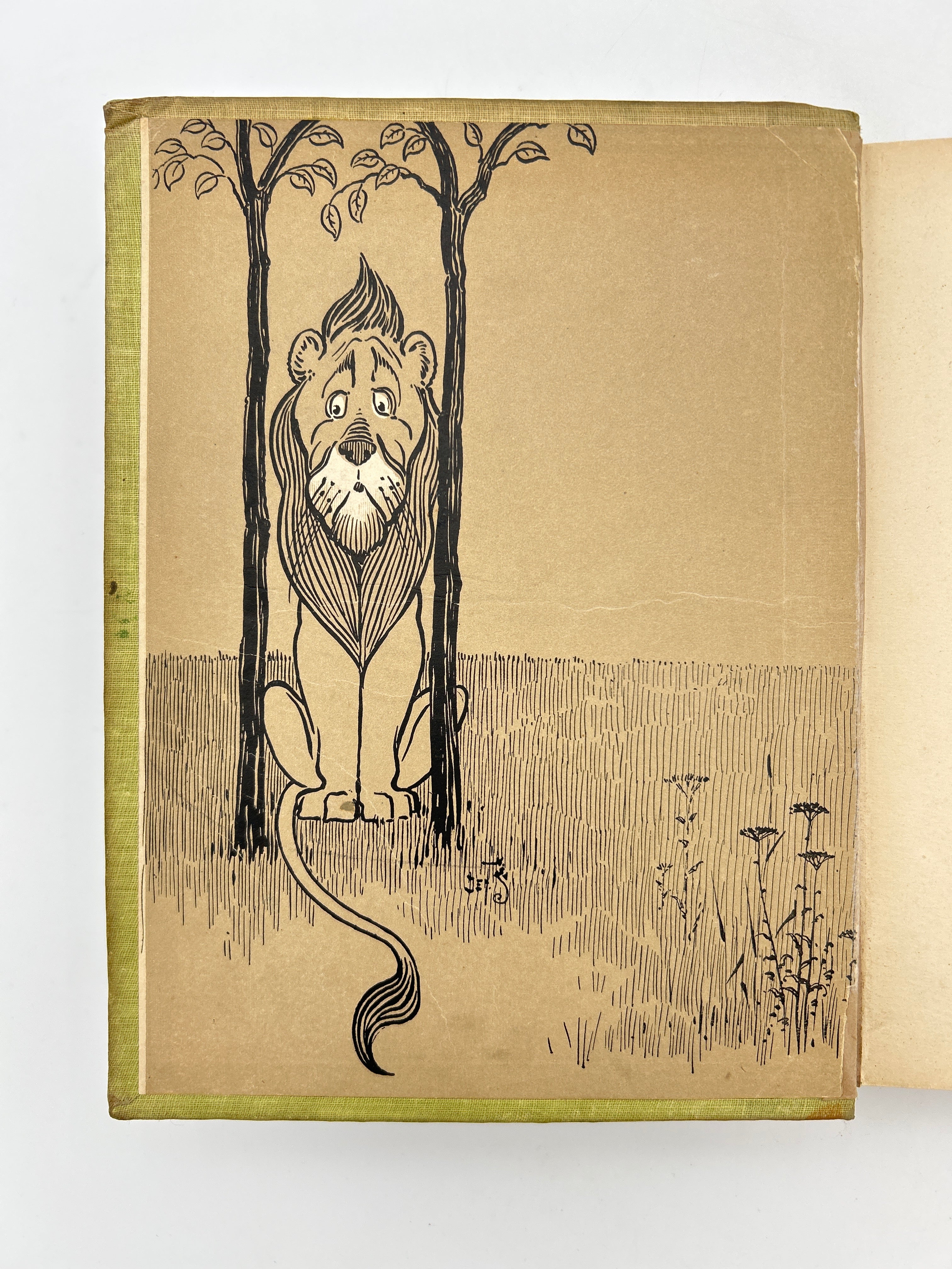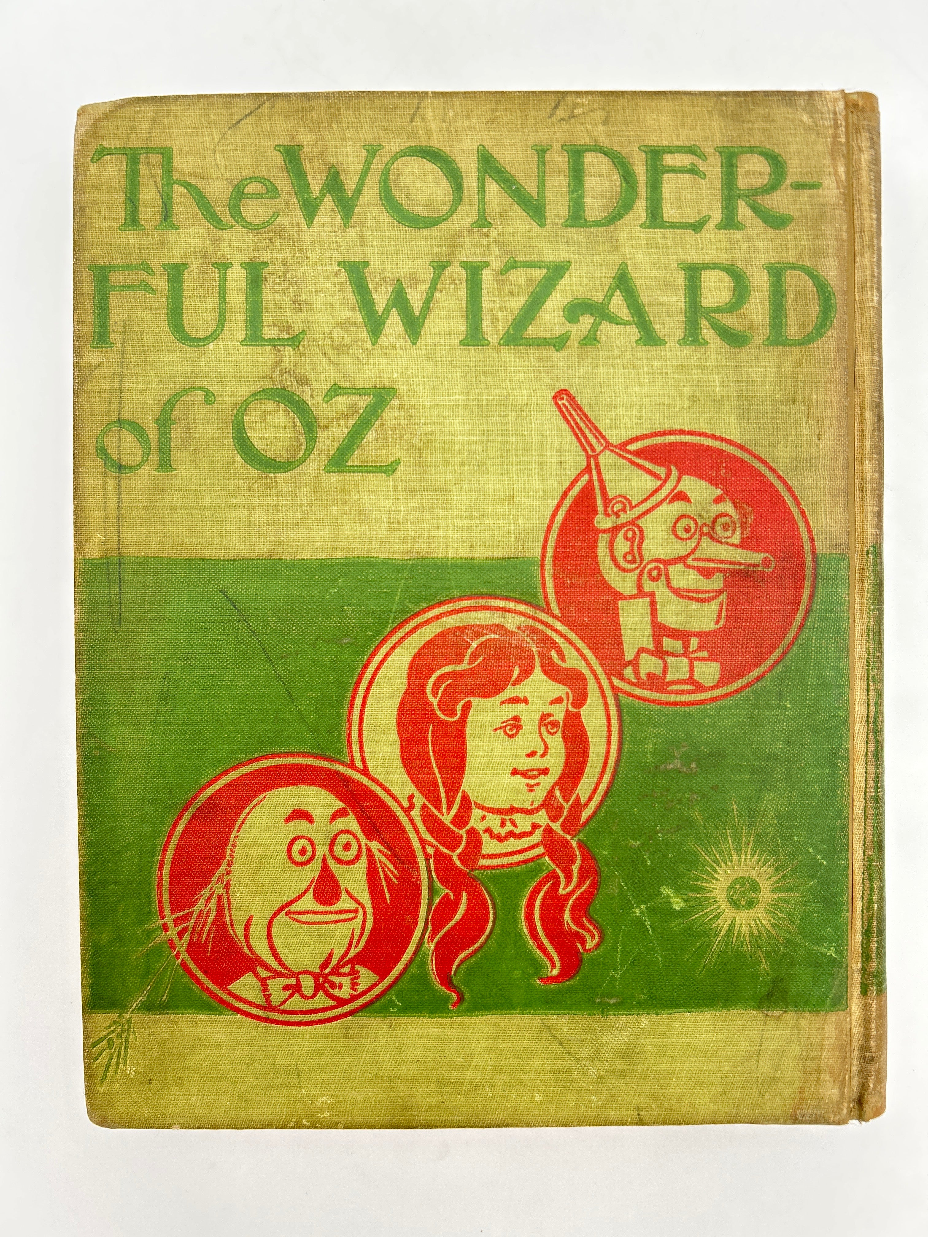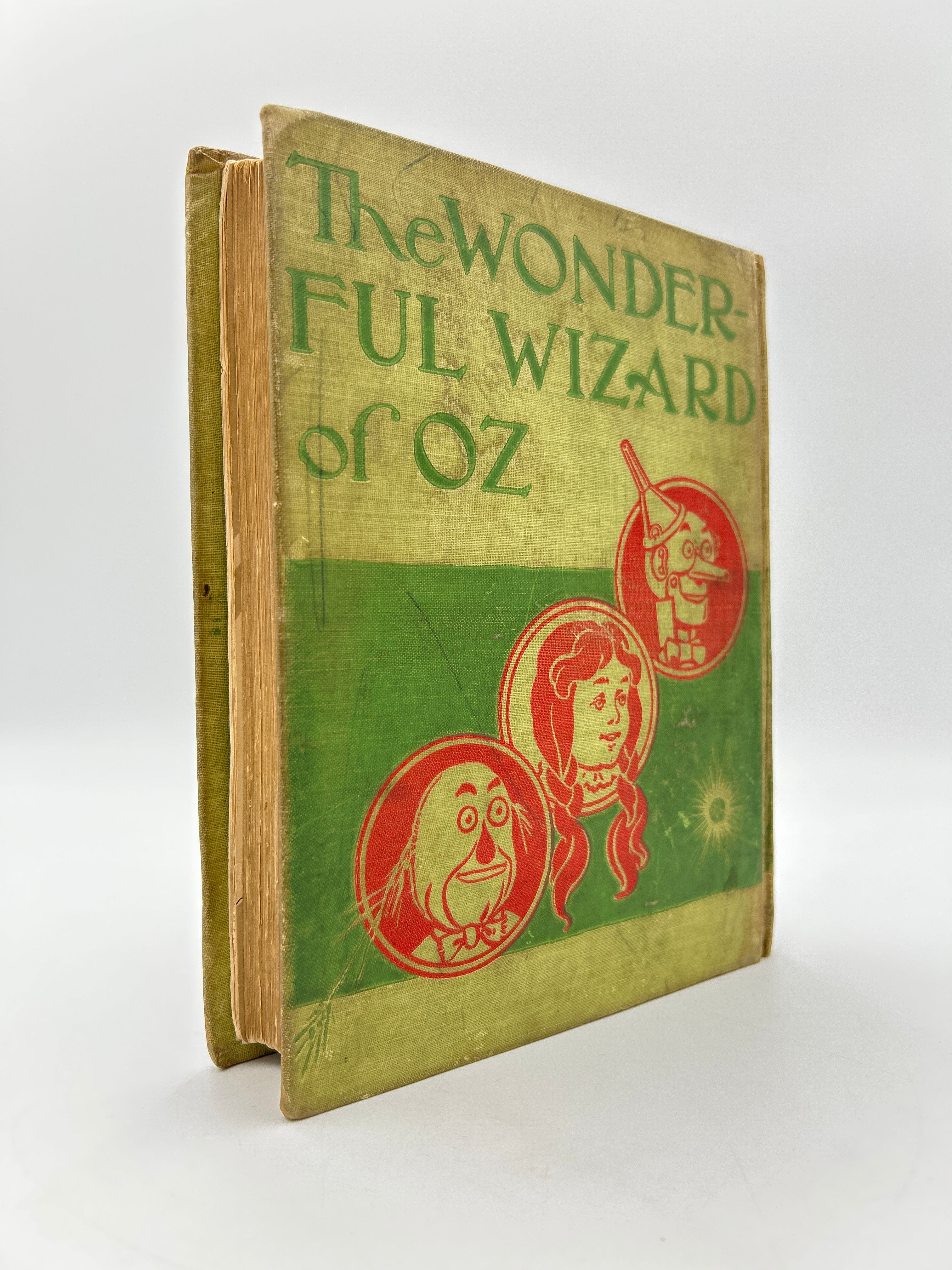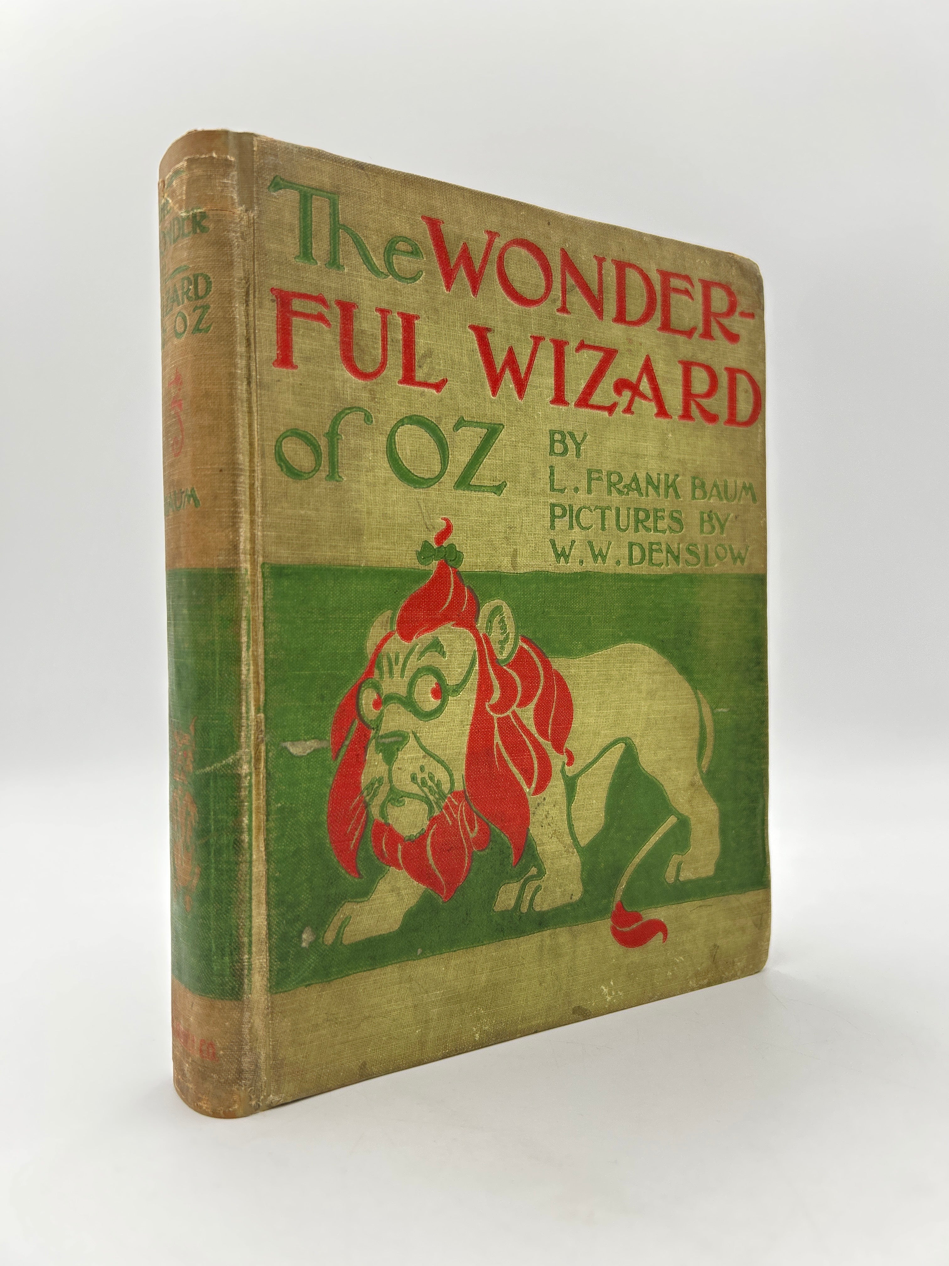 Light green cloth binding with dark green and red lettering on the upper board. Green lettering to spine and lower board. Lion illustration in green and red on upper board. Illustration of Toto on spine in green with red eyes. Faces of the tin man, Dorothy, and the scarecrow on the lower board in red. Professional repair work done to spine hinges as well as head and foot of the spine. Corners bumped. General scuffing to covers. Multicolored illustrations throughout with Twenty-four full-page illustrations. Pictorial endpapers. Inscription on preliminary flyleaf which reads “Merry Christmas to Horace from his cousins Florence, John, and Horace.” Extremely minimal smudges or marking throughout. Fine condition.