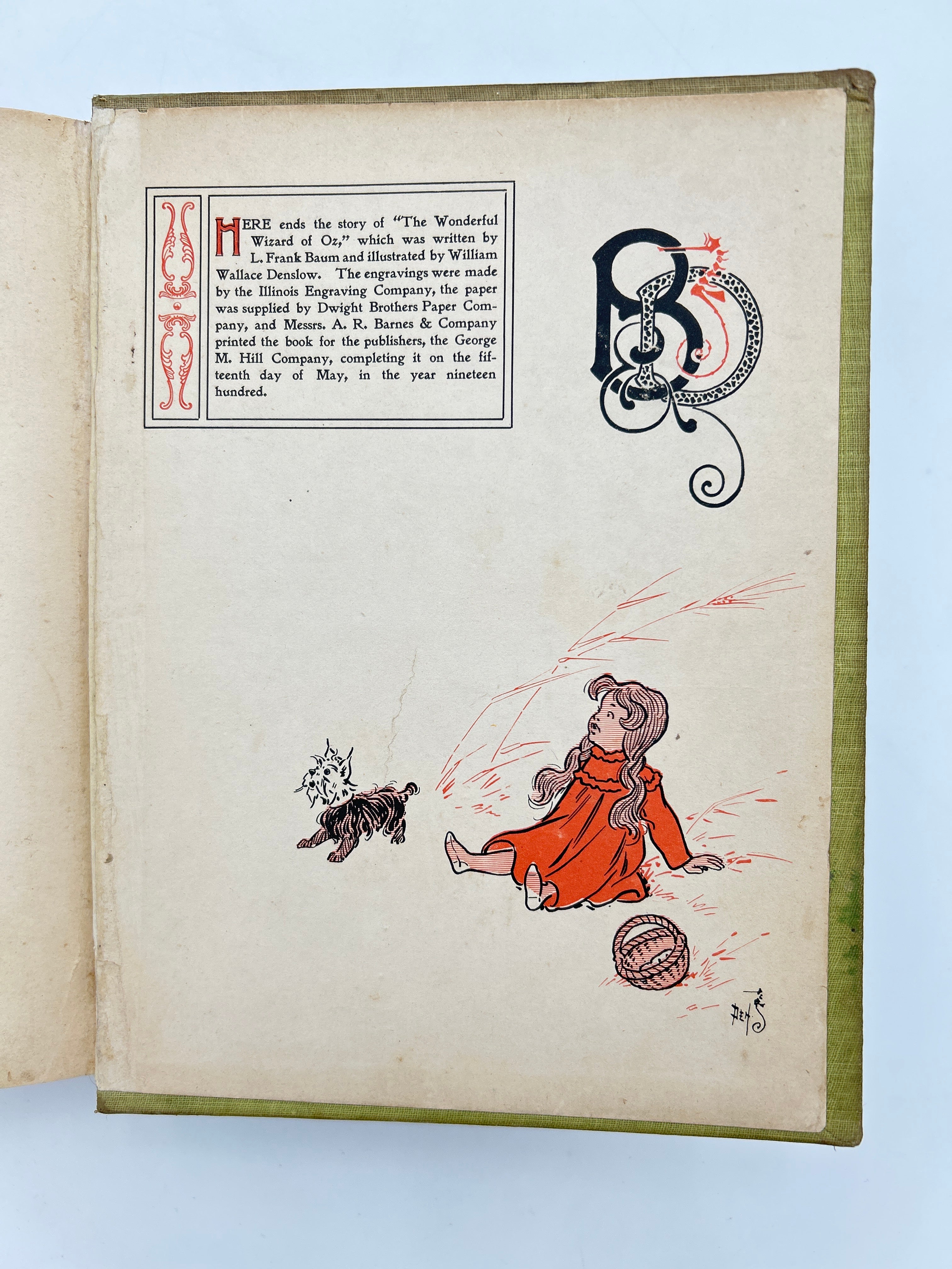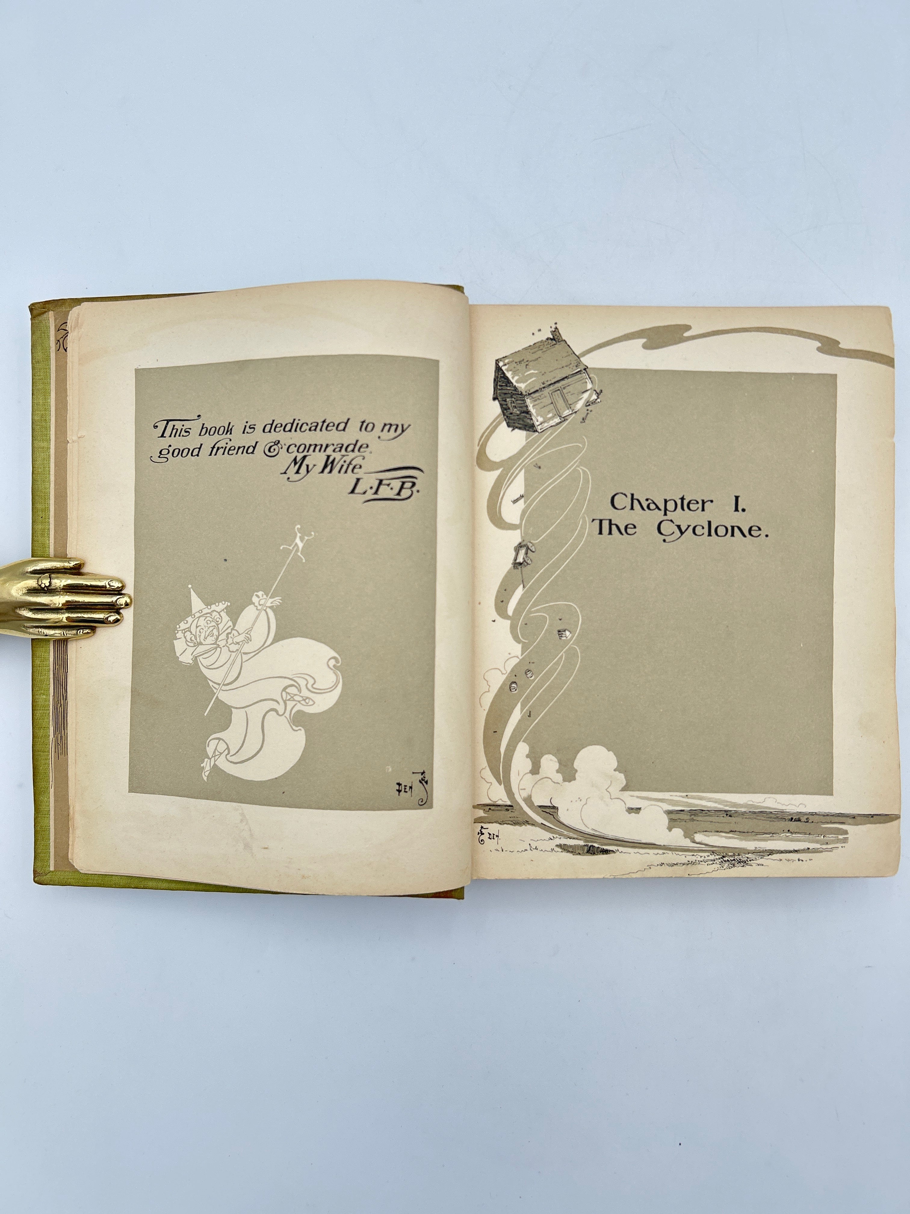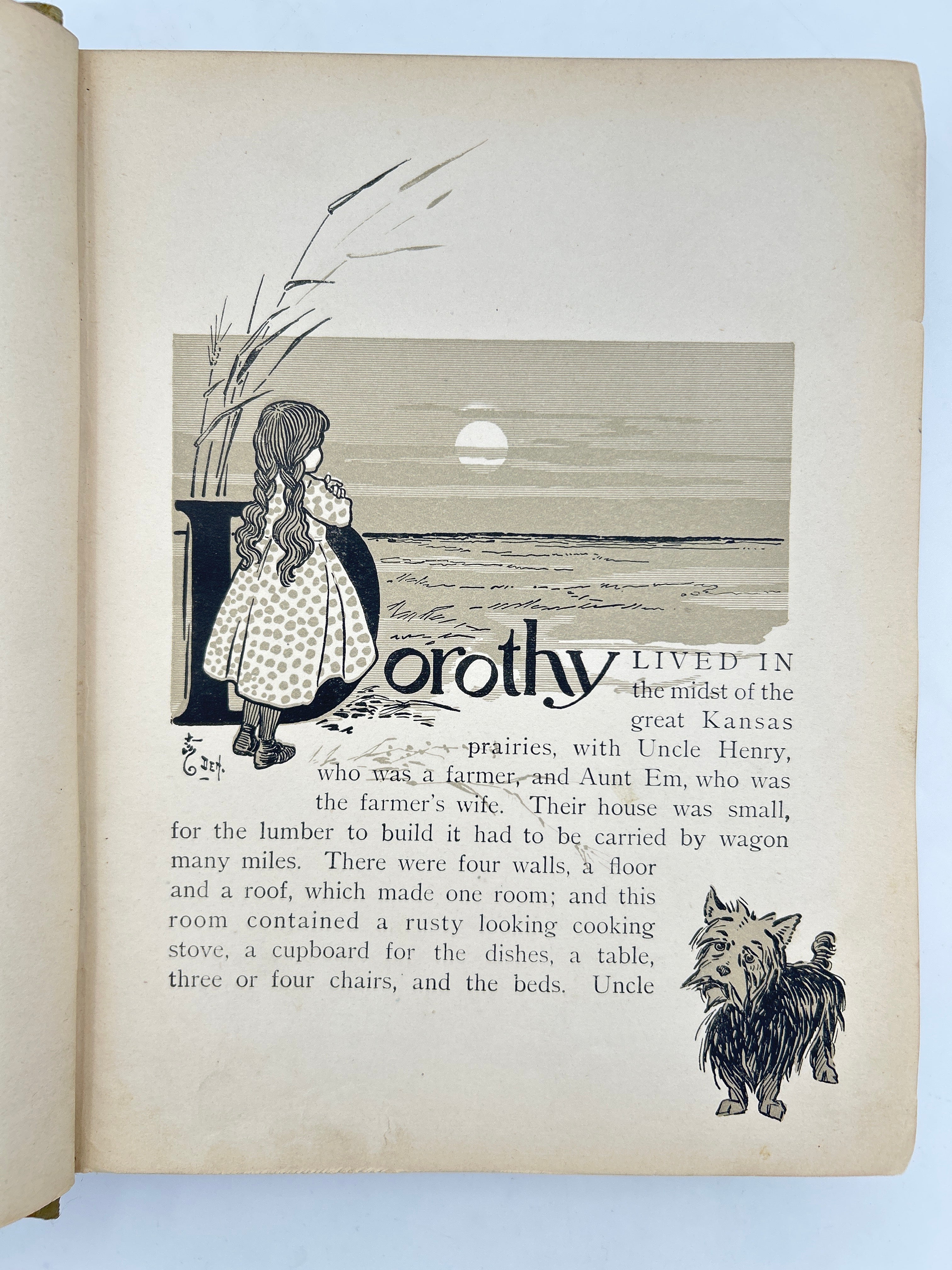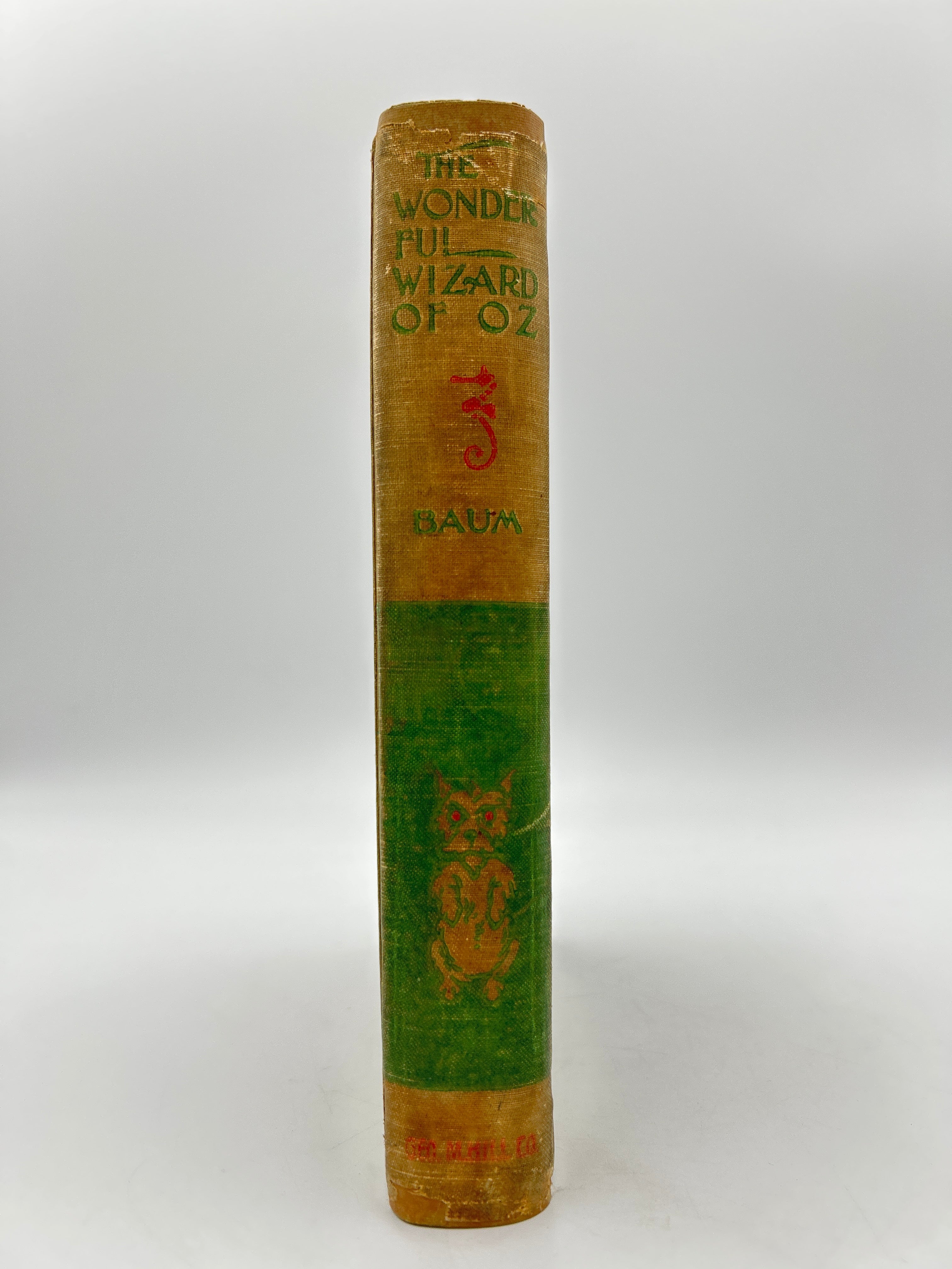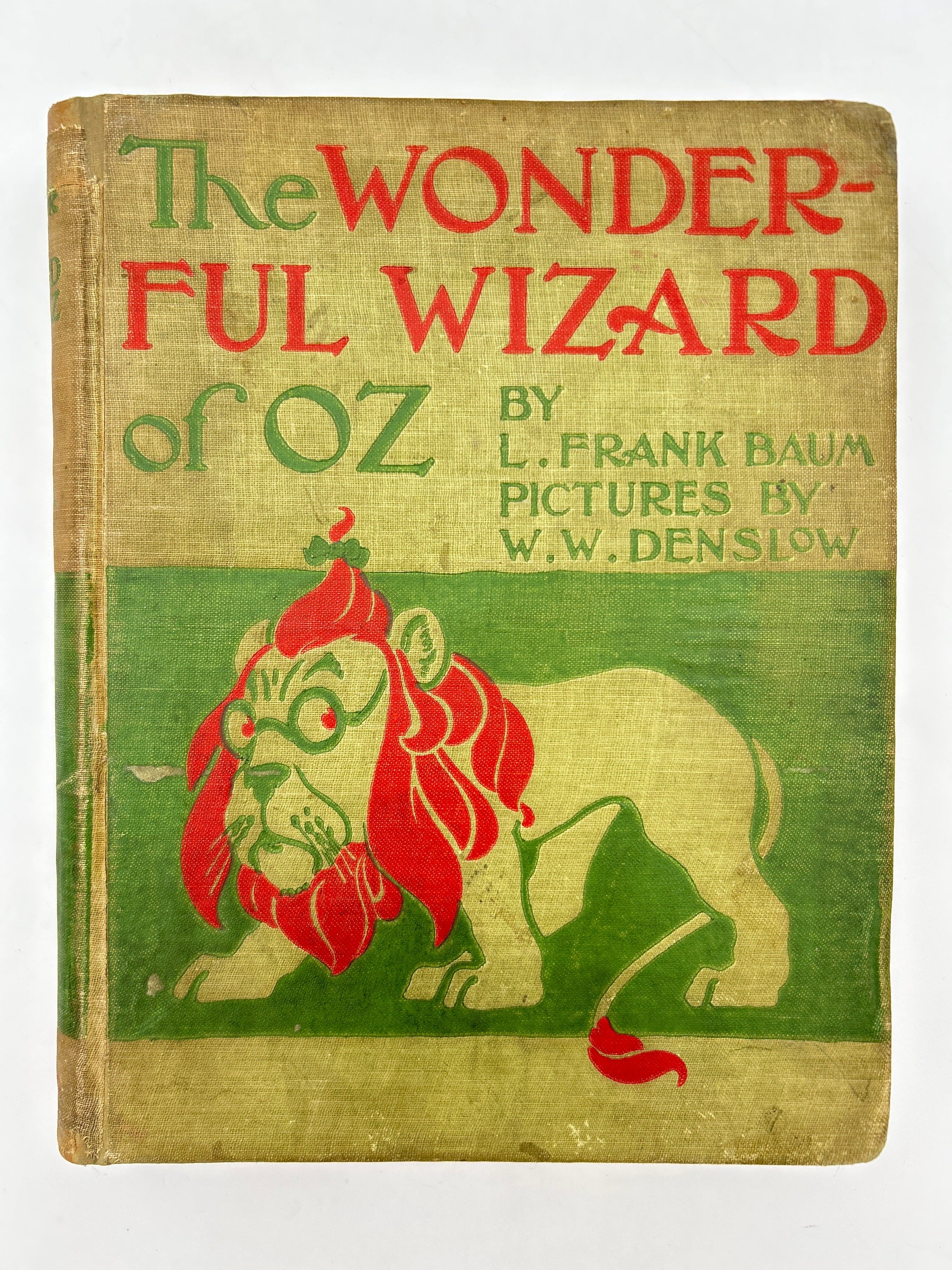 Light green cloth binding with dark green and red lettering on the upper board. Green lettering to spine and lower board. Lion illustration in green and red on upper board. Illustration of Toto on spine in green with red eyes. Faces of the tin man, Dorothy, and the scarecrow on the lower board in red. Professional repair work done to spine hinges as well as head and foot of the spine. Corners bumped. General scuffing to covers. Multicolored illustrations throughout with Twenty-four full-page illustrations. Pictorial endpapers. Inscription on preliminary flyleaf which reads “Merry Christmas to Horace from his cousins Florence, John, and Horace.” Extremely minimal smudges or marking throughout. Fine condition.