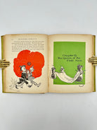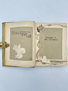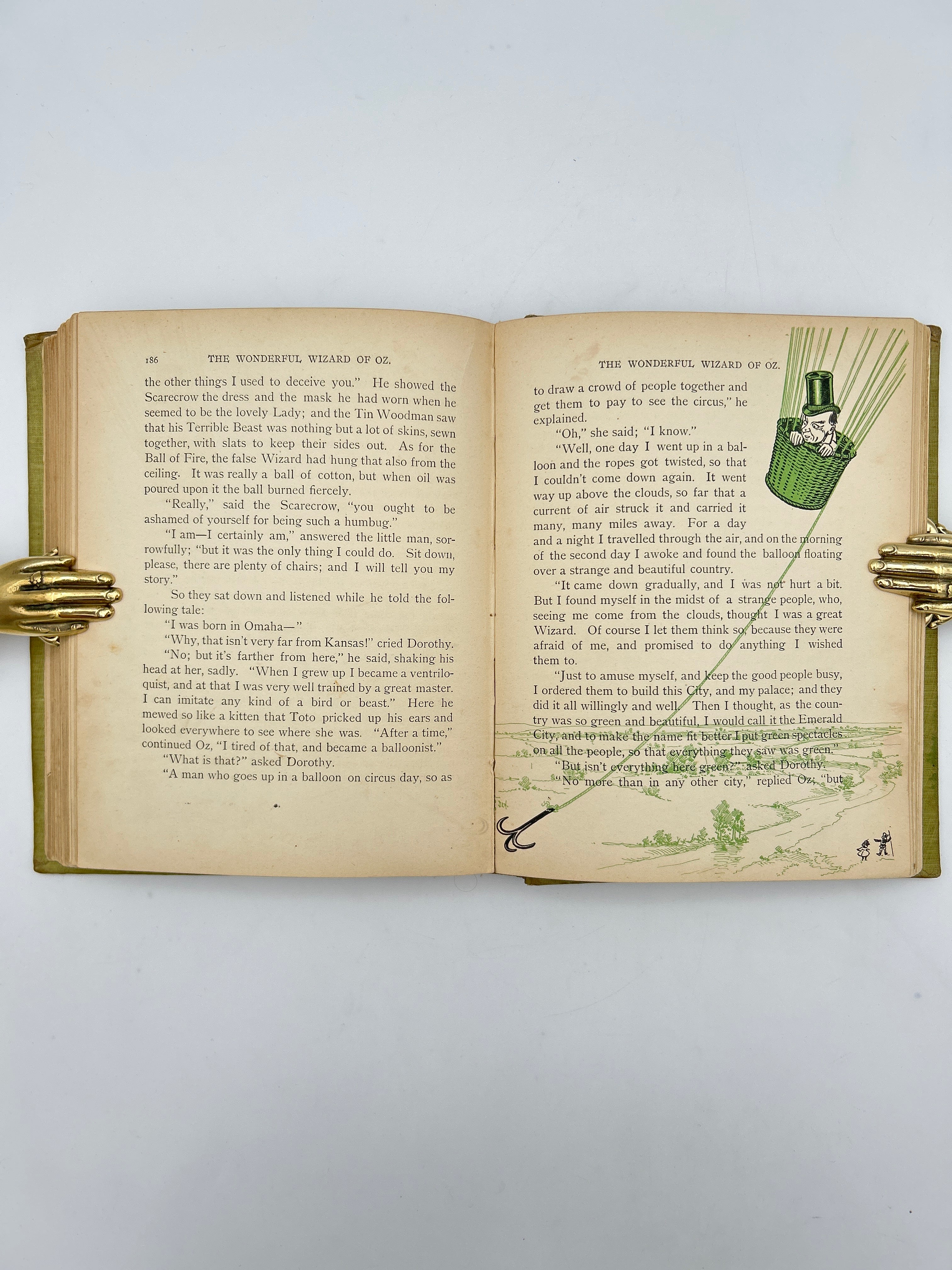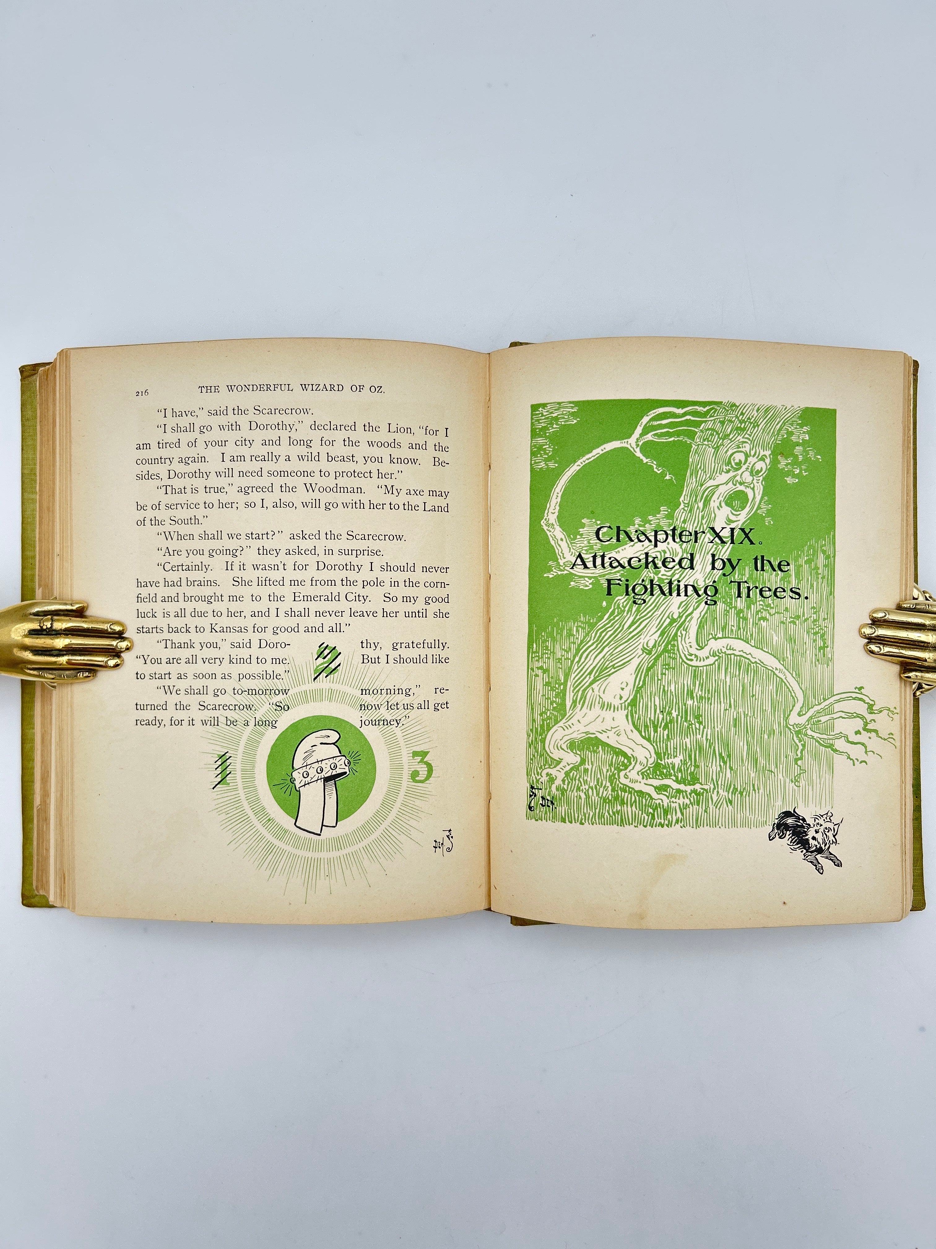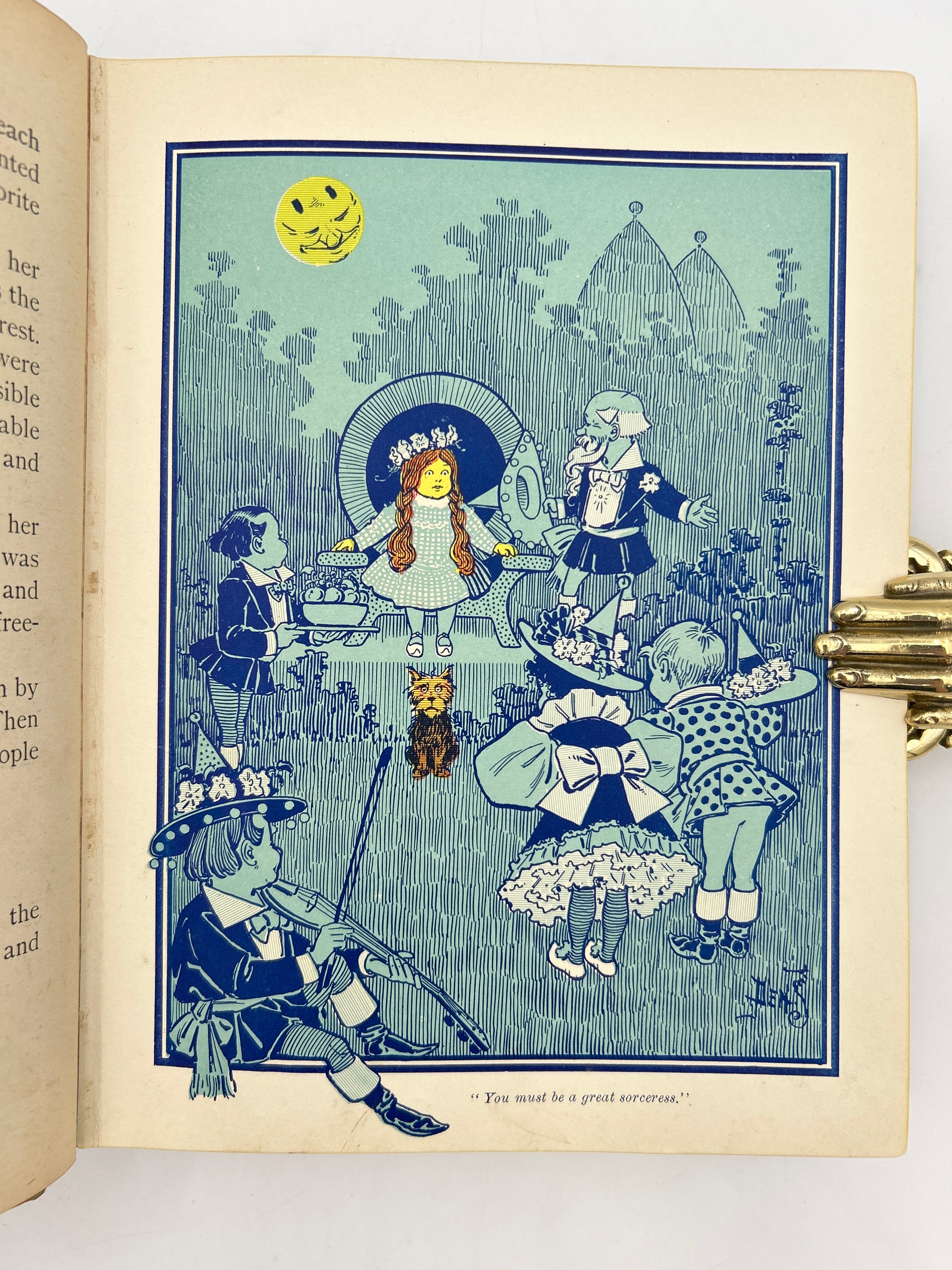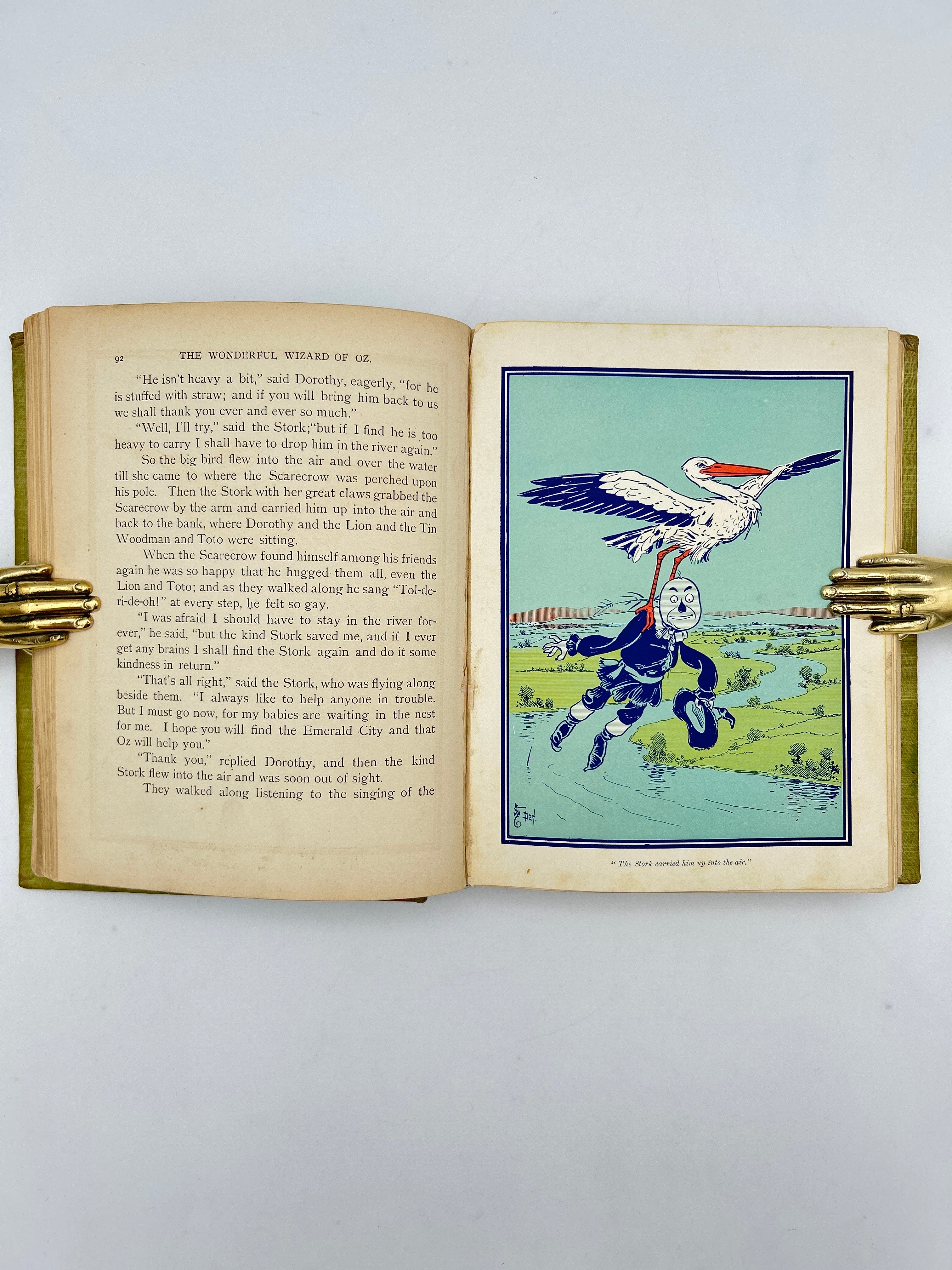 Light green cloth binding with dark green and red lettering on the upper board. Green lettering to spine and lower board. Lion illustration in green and red on upper board. Illustration of Toto on spine in green with red eyes. Faces of the tin man, Dorothy, and the scarecrow on the lower board in red. Professional repair work done to spine hinges as well as head and foot of the spine. Corners bumped. General scuffing to covers. Multicolored illustrations throughout with Twenty-four full-page illustrations. Pictorial endpapers. Inscription on preliminary flyleaf which reads “Merry Christmas to Horace from his cousins Florence, John, and Horace.” Extremely minimal smudges or marking throughout. Fine condition.