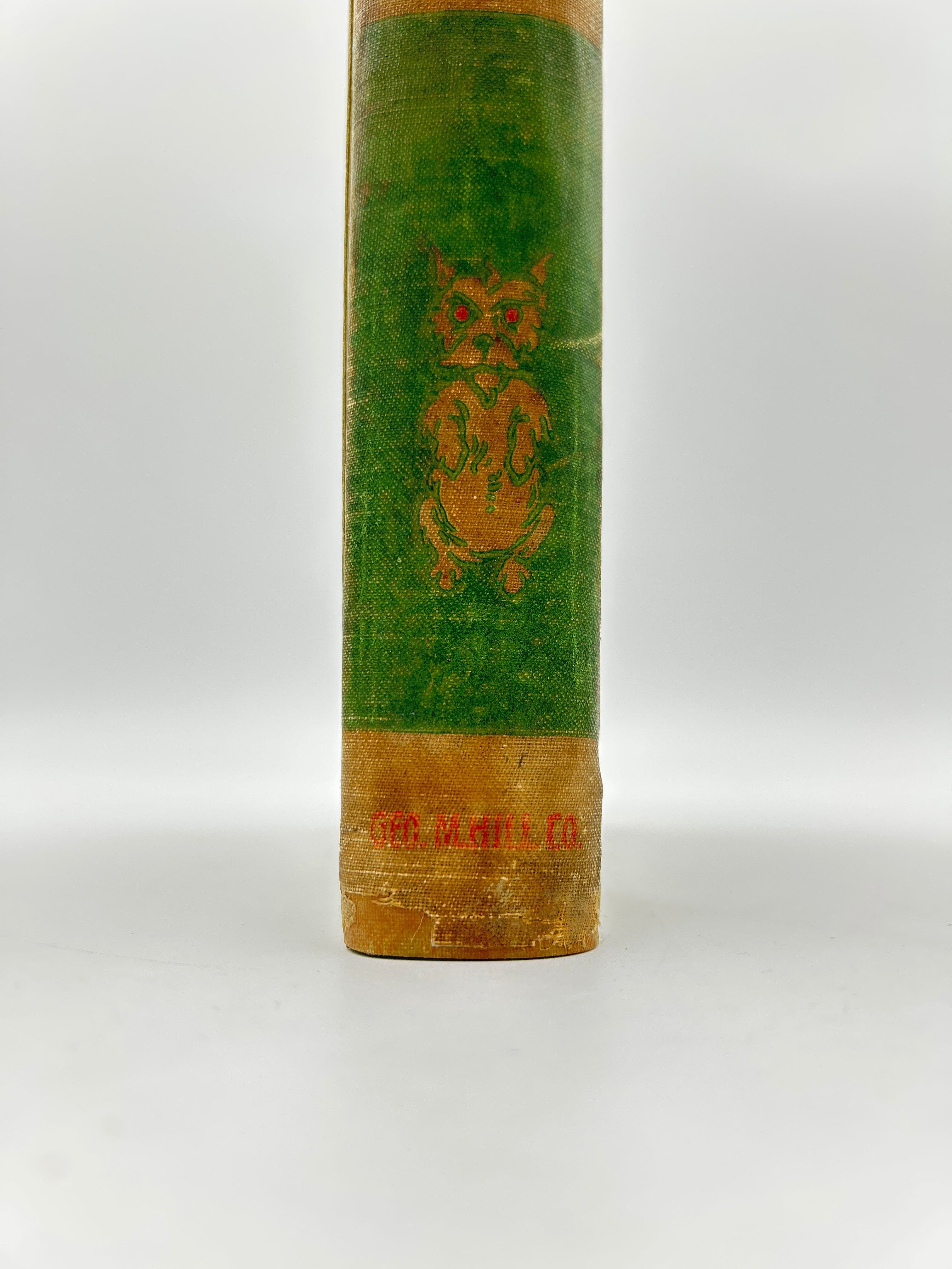 There are three binding variants for the publishers imprint “Geo. M. Hill Co.” at the foot of the spine. Variant A features a plain sans serif type stamped in deep green. Variant B, of which this book is a copy has the same but is printed in red. Variant C features a serif type stamped in red with the ‘C’ encircling the ‘o’ in ‘Co.’ which is most common on later first printings.