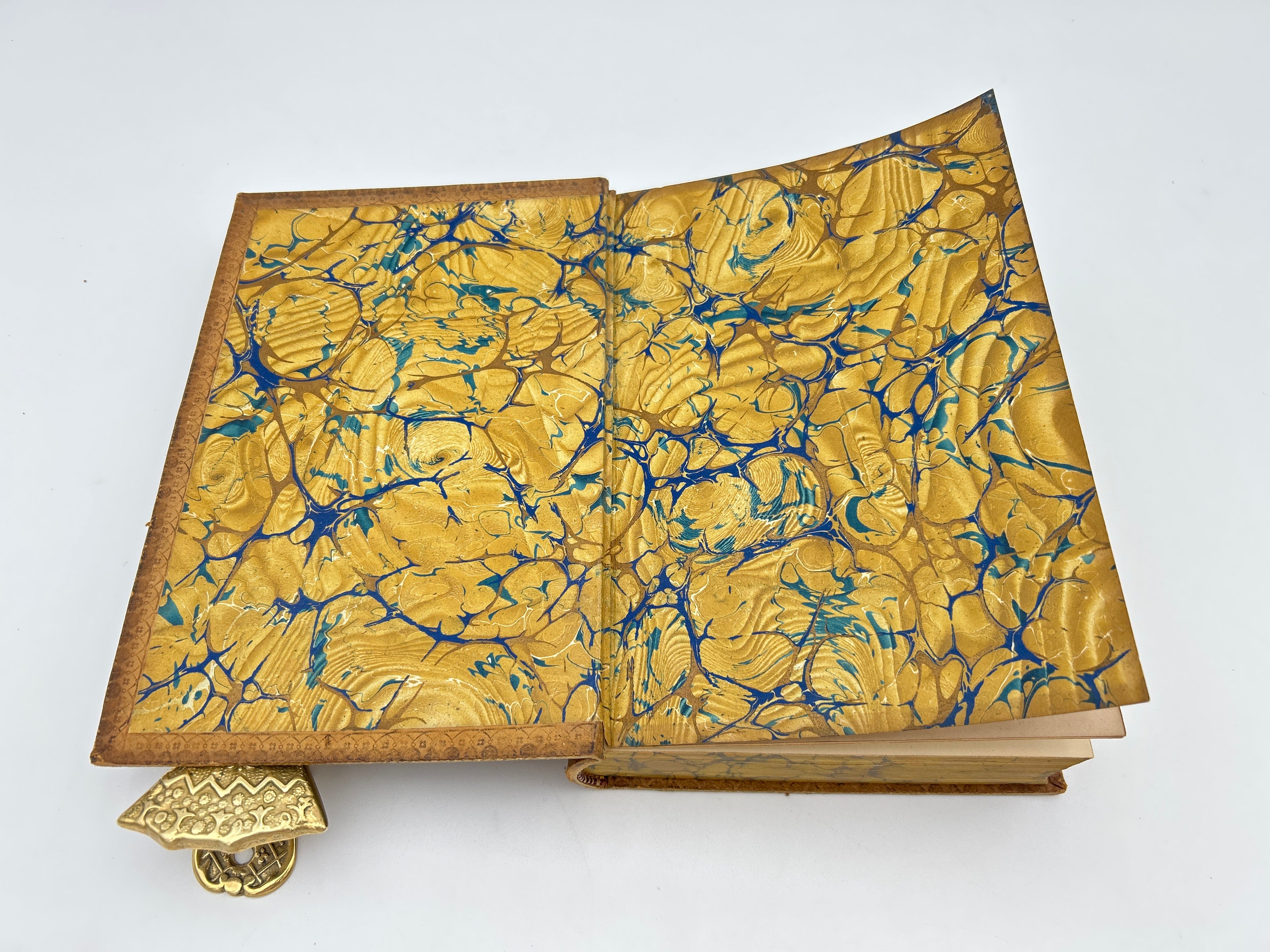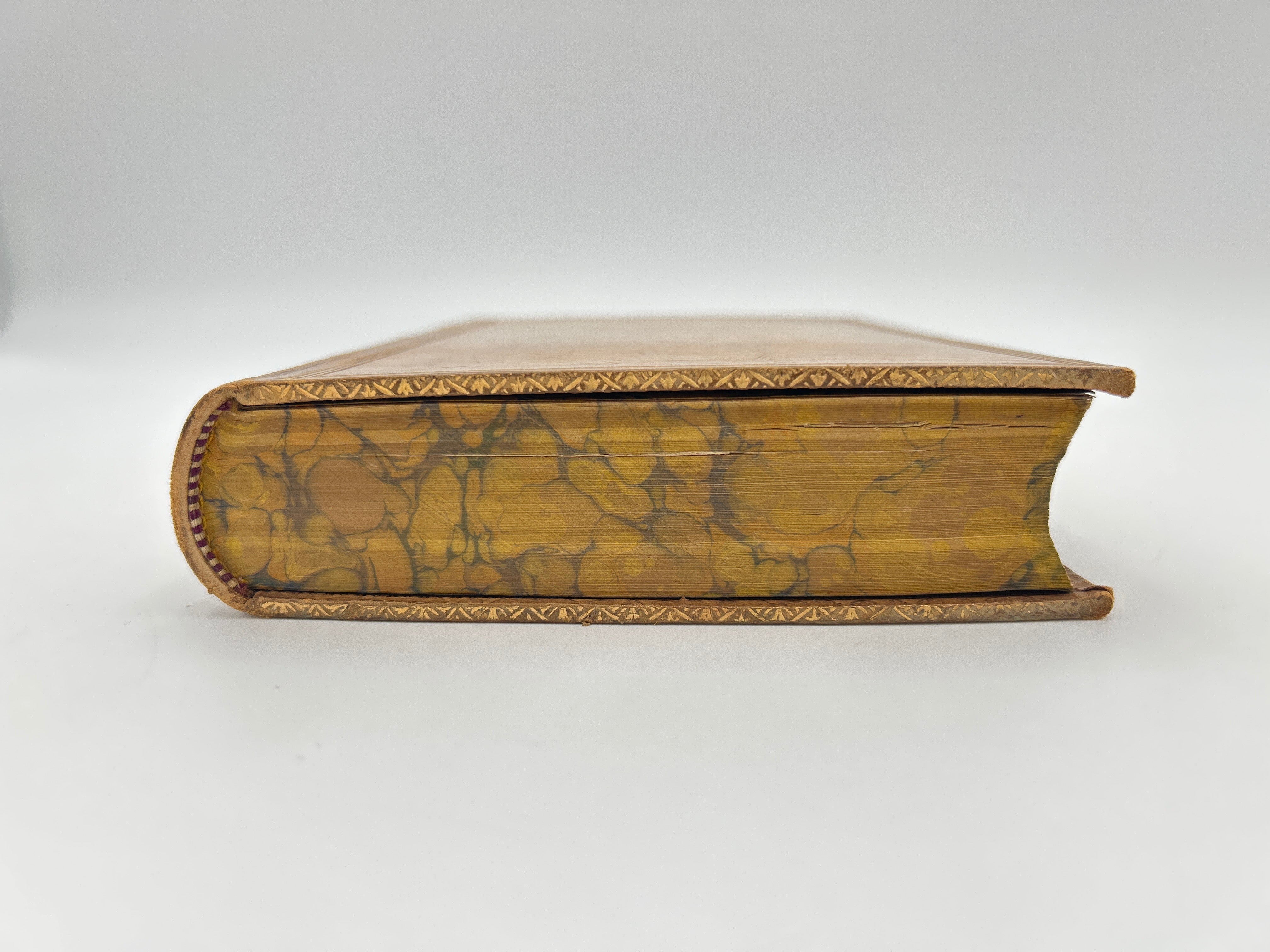 Leather camel cover with gold embossing down spine with burgundy title band.
