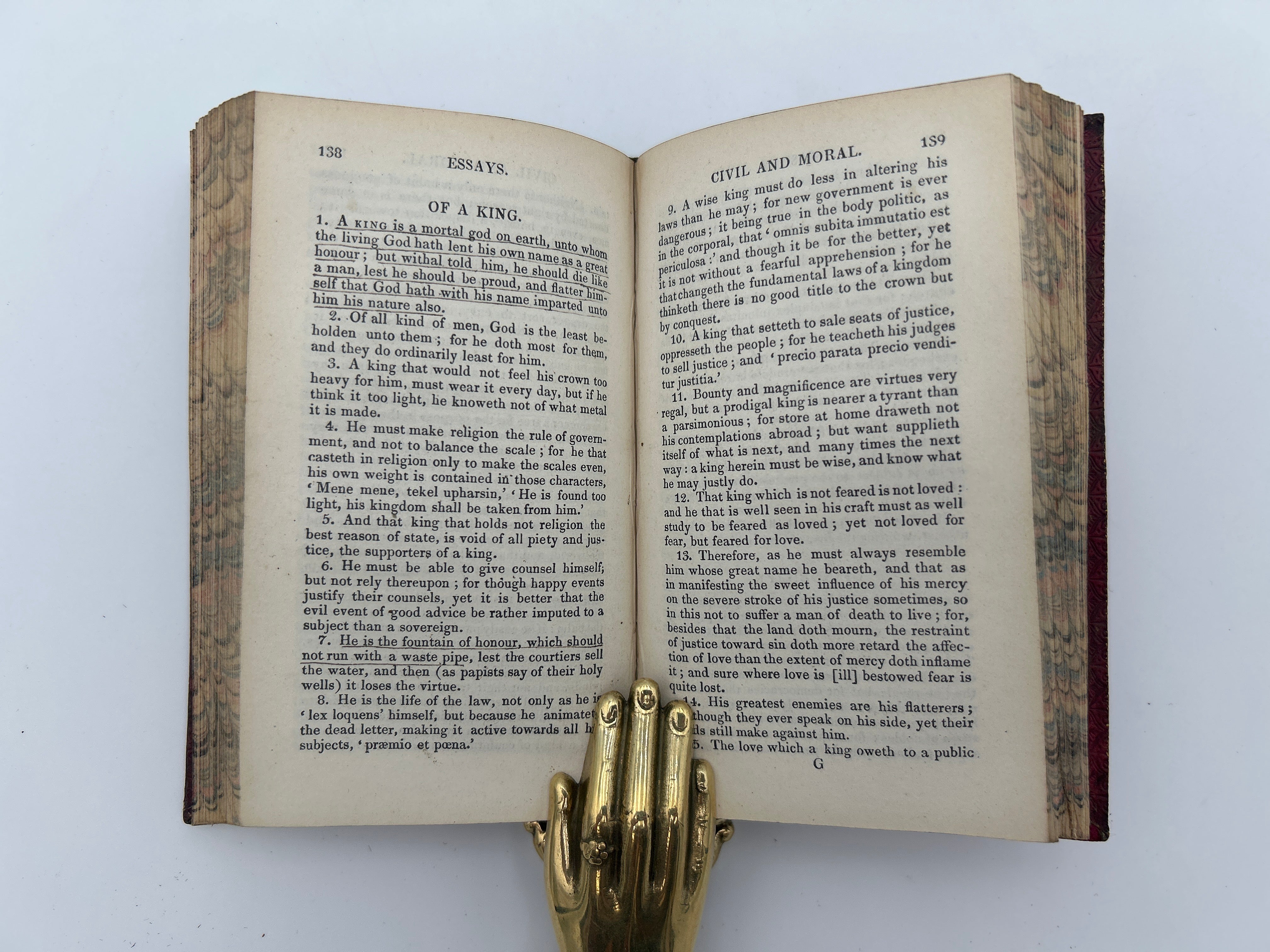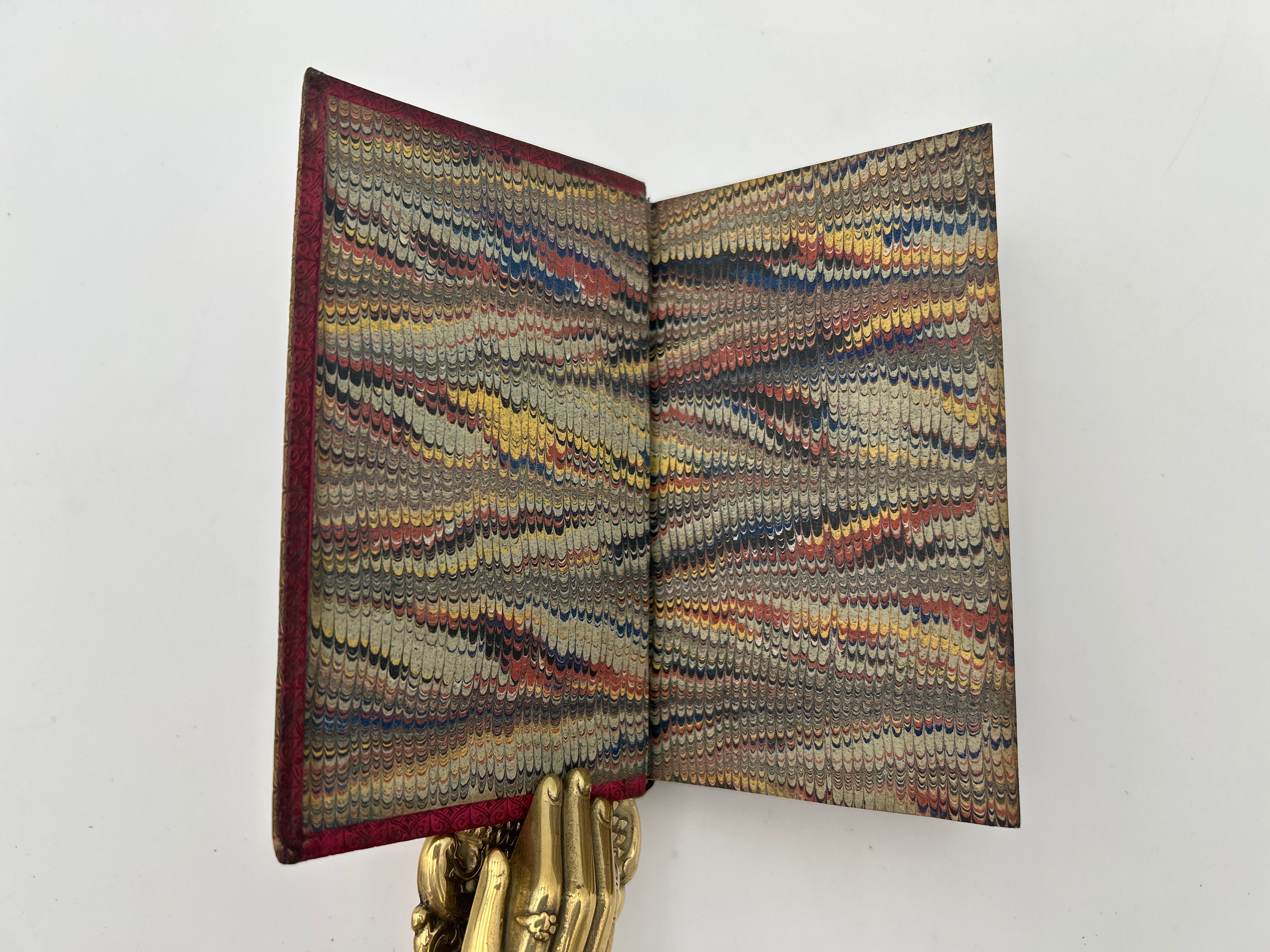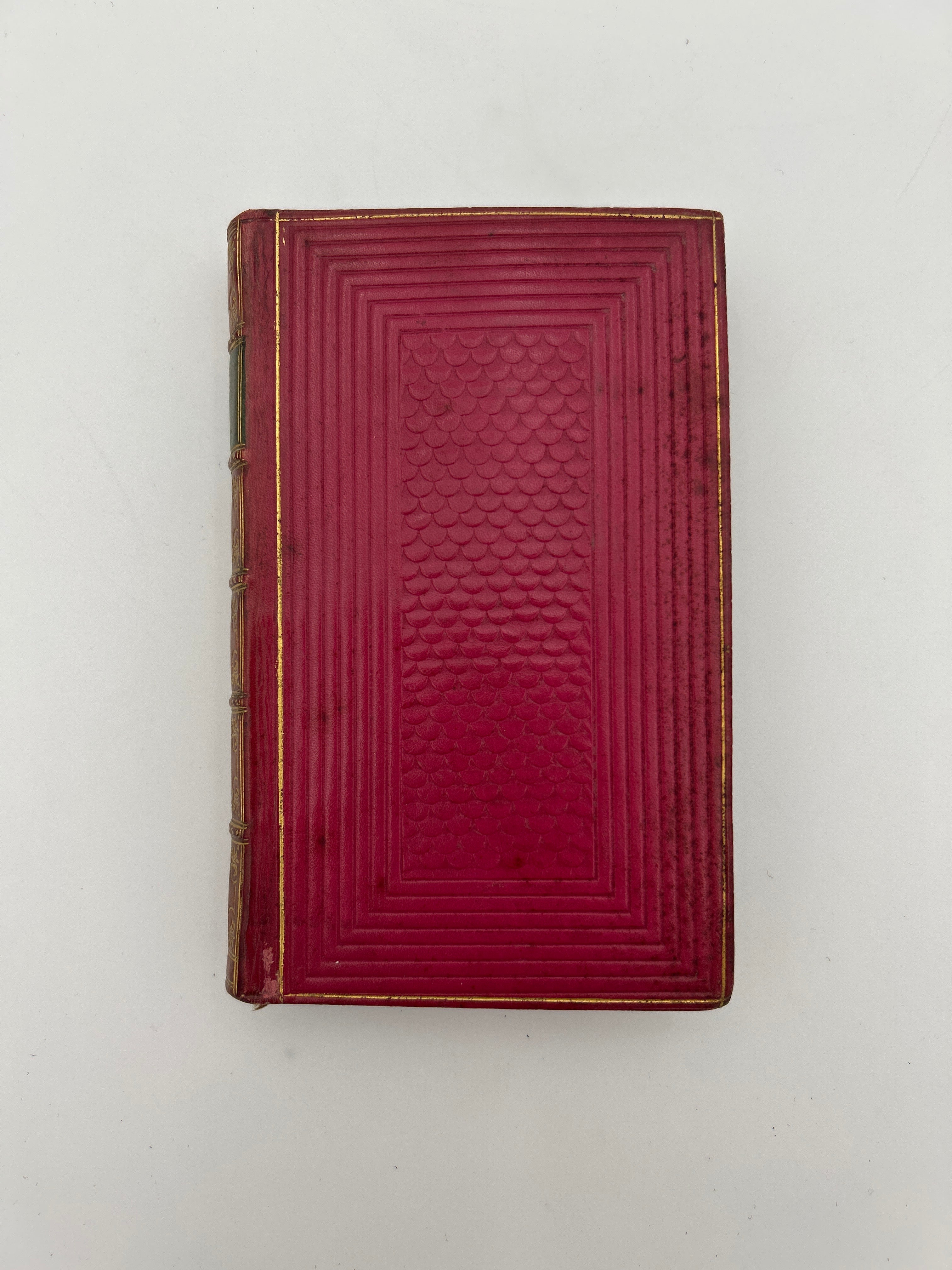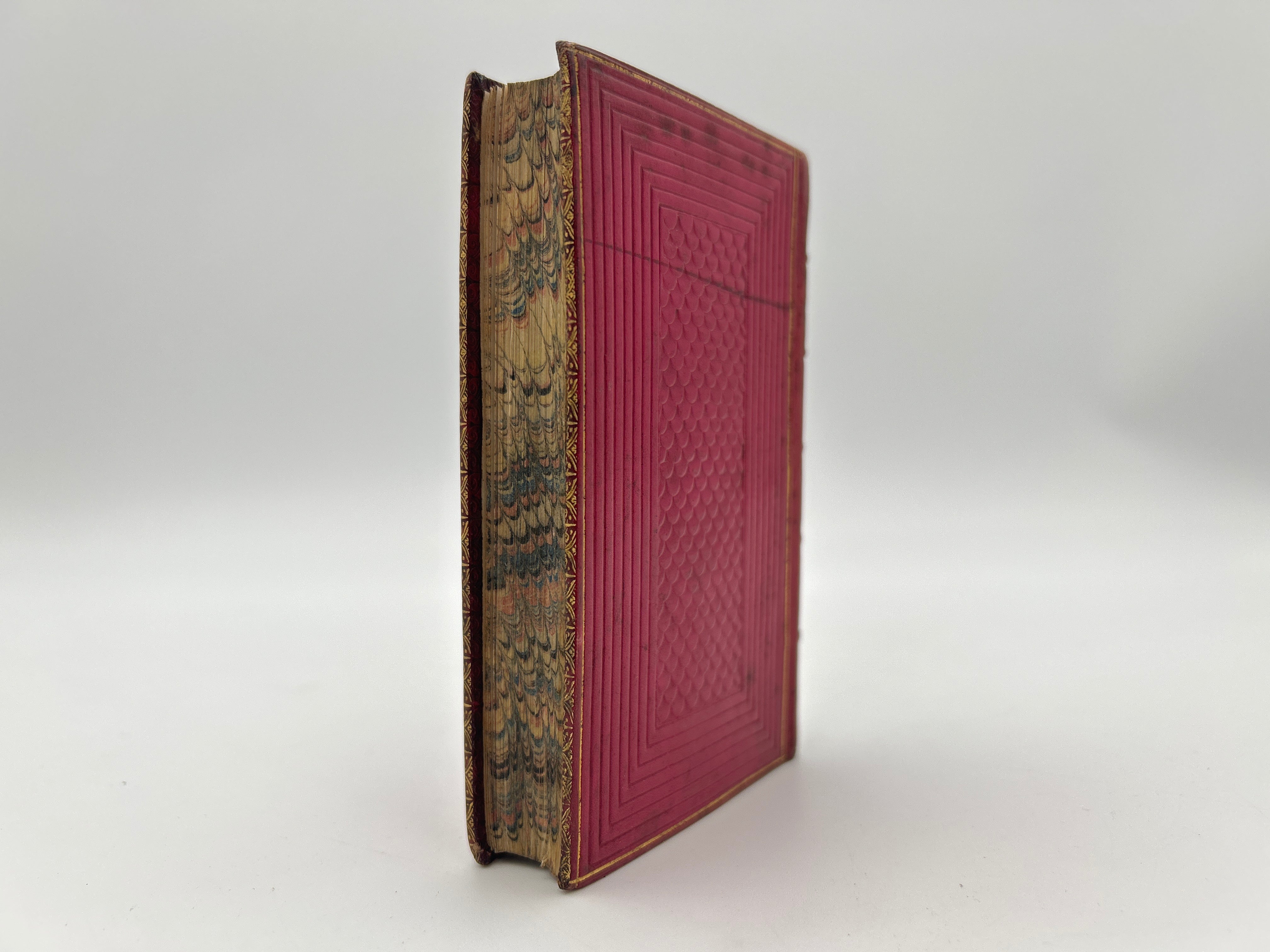 Two important titles bound in superb red full calf leather. 5 inches tall. A lovely Victorian binding with gilt raised bands and olive label with very finely gilt panels. Fading gilt embossed turn ins with marbled endpapers and edges. The boards have been stamped with ‘fish scales’ within a series of bling fillets. A very neat inscription in ink on the first blank page reading: “Mary Ann Ashley, August 1840”. Some neat ink underlining and bracketing sporadically throughout. Some discolored marking on the boards. Fine condition overall.