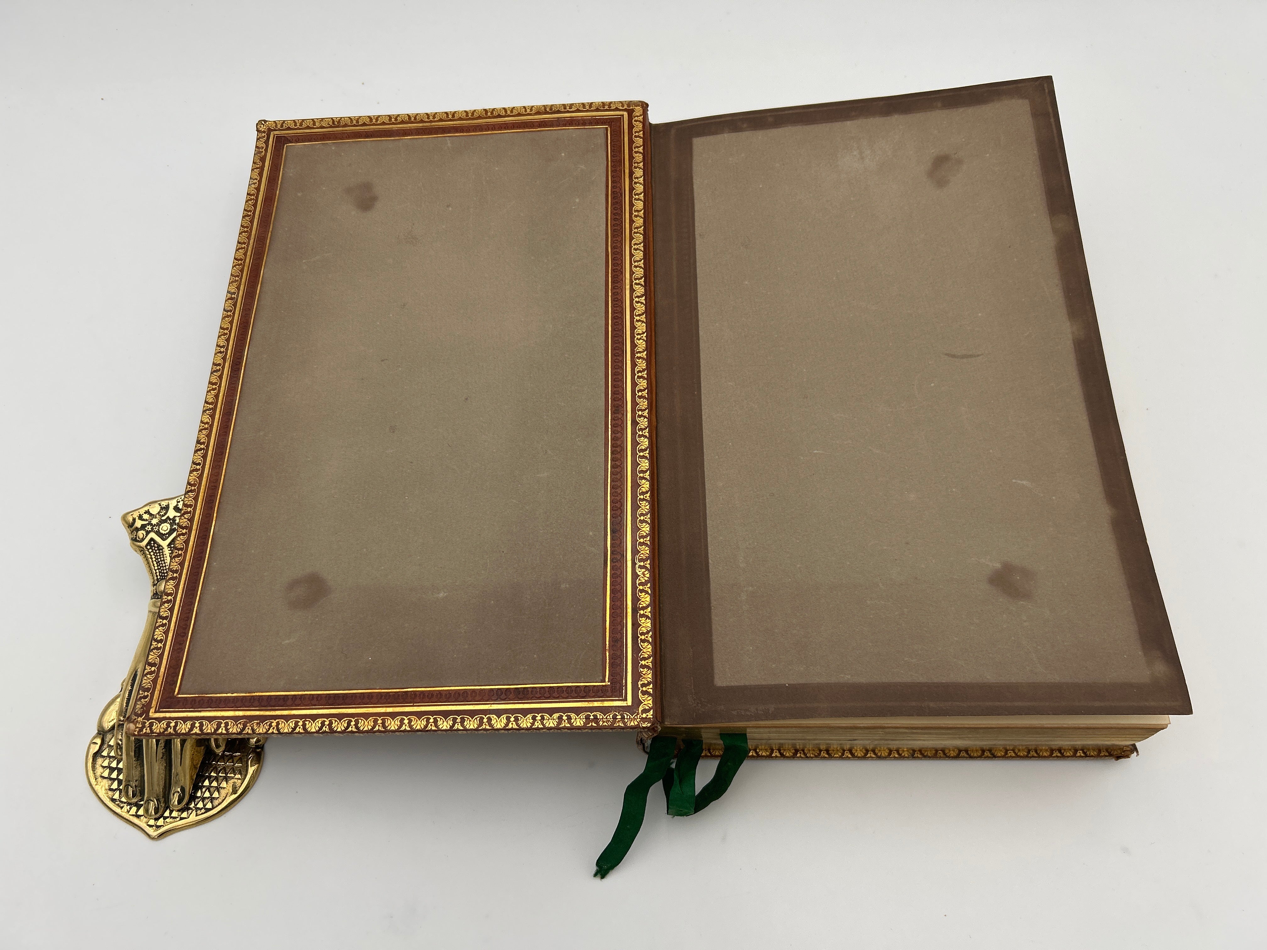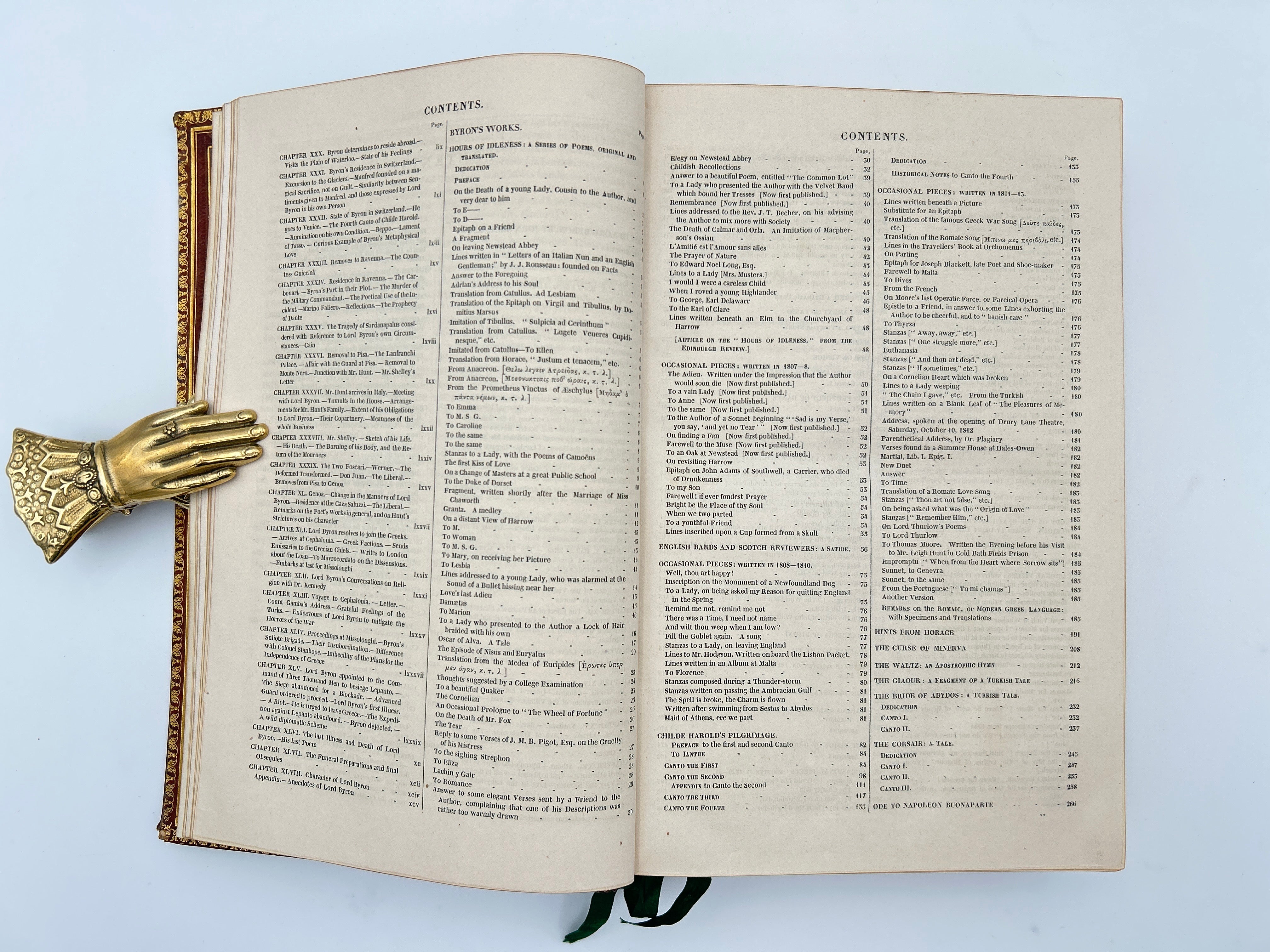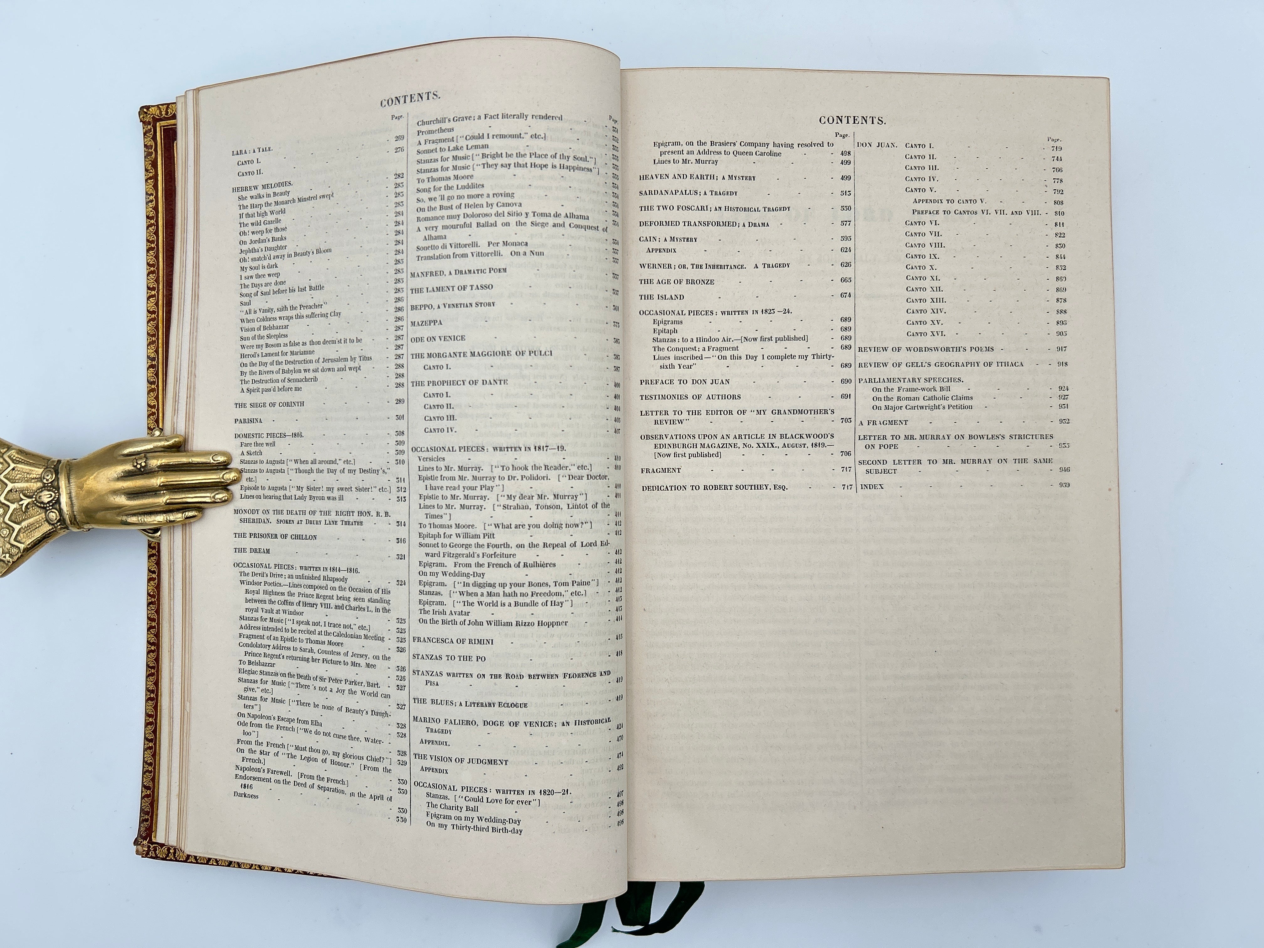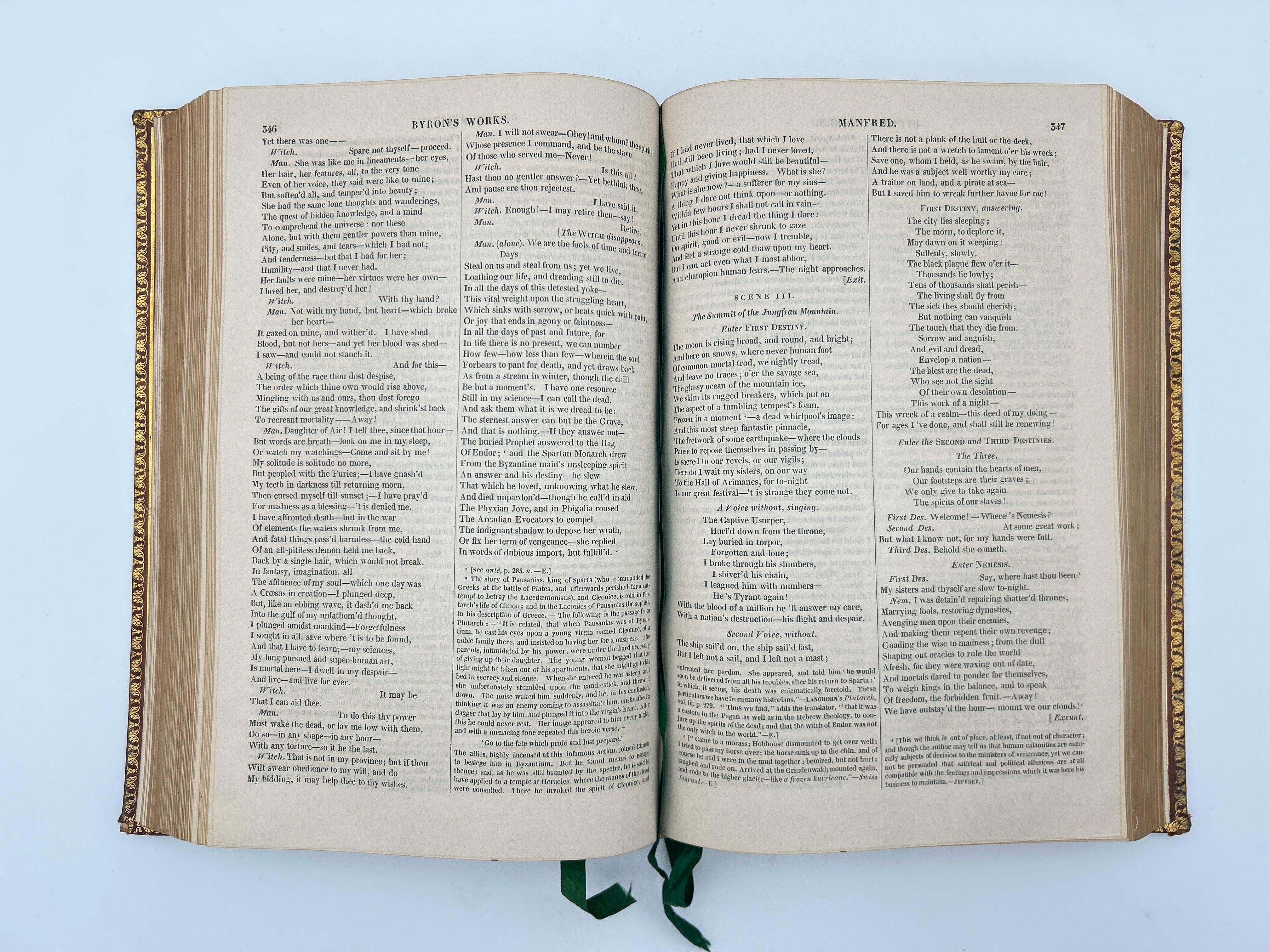 Extraordinary full calf, 10.5 inches tall. Wide gilt bands and elaborate gilt and blind tooling to the panels and boards. With gilt dentelles and all edges gilt. This is Baudry’s first single volume edition with notes and a Life of Byron by John Galt. Slight nick to the tailcap. Three green page markers. Double columed pages. Scarce edition in near pristine condition.