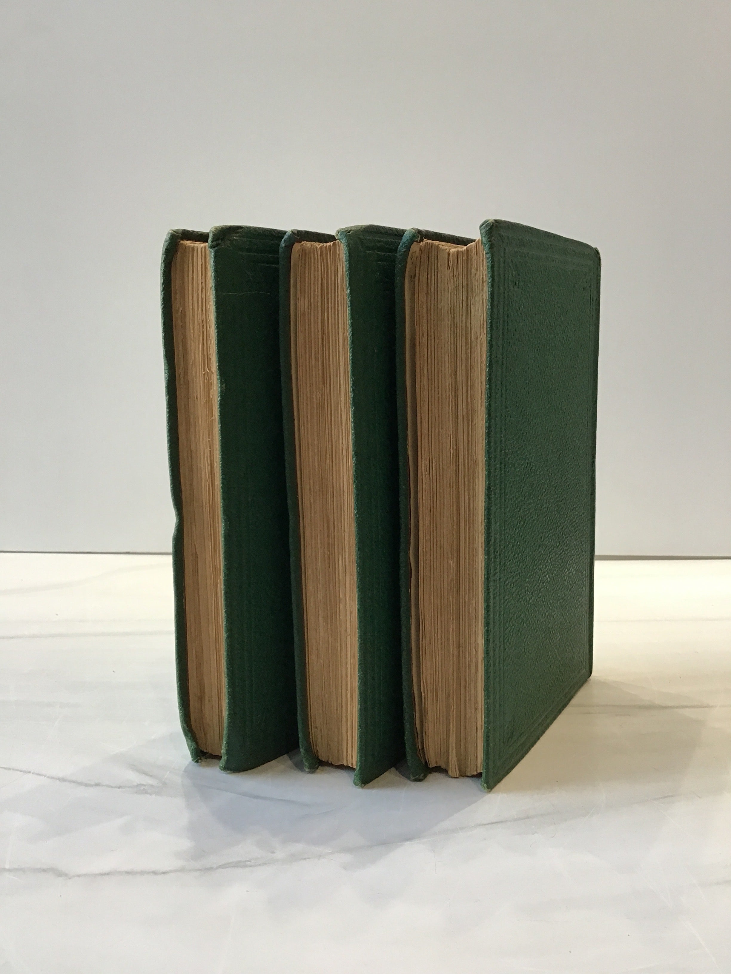 Three green fabric volumes by Elizabeth Browning's Poems with Charles Dickens Library Plate, very good condition.