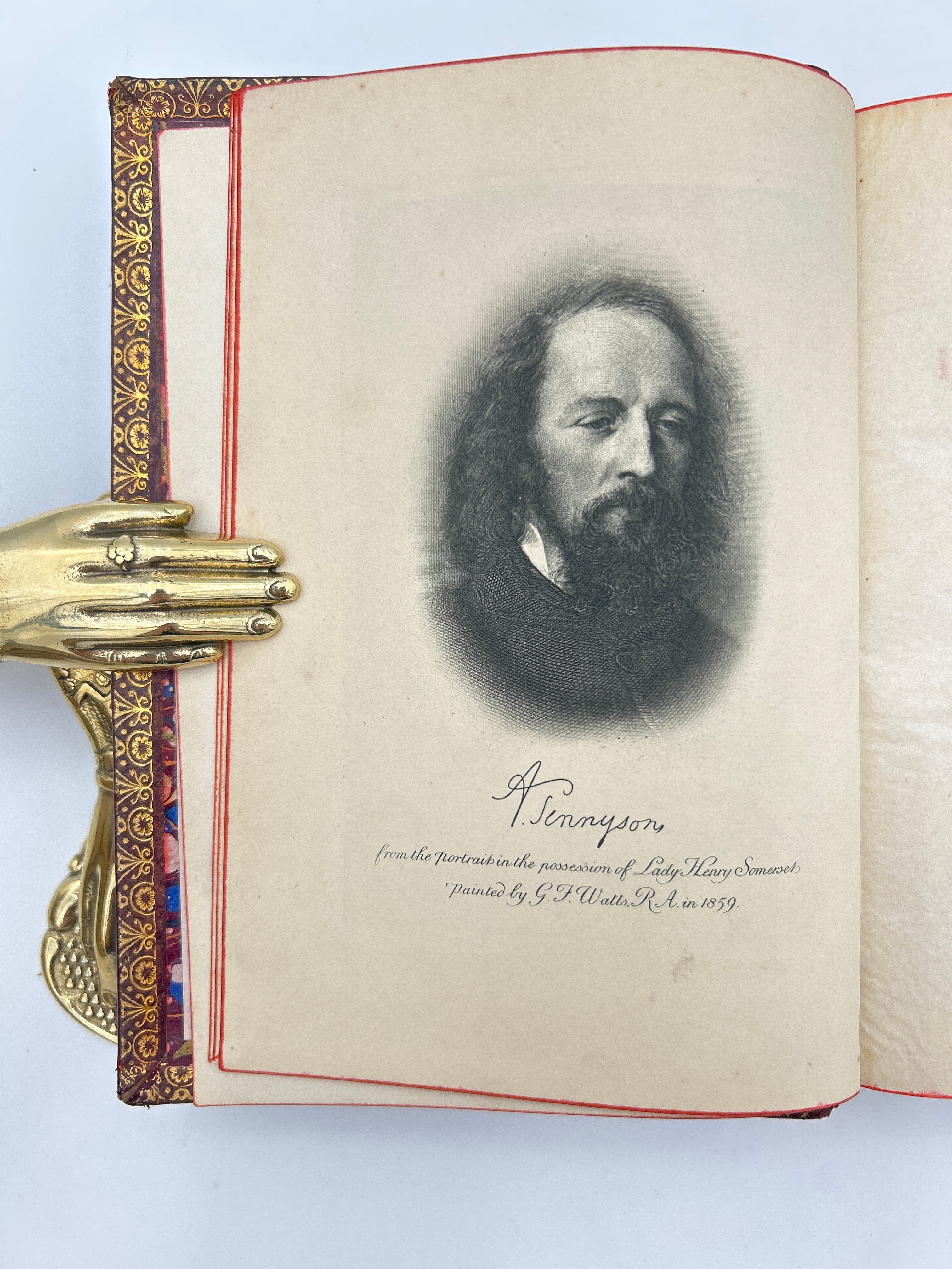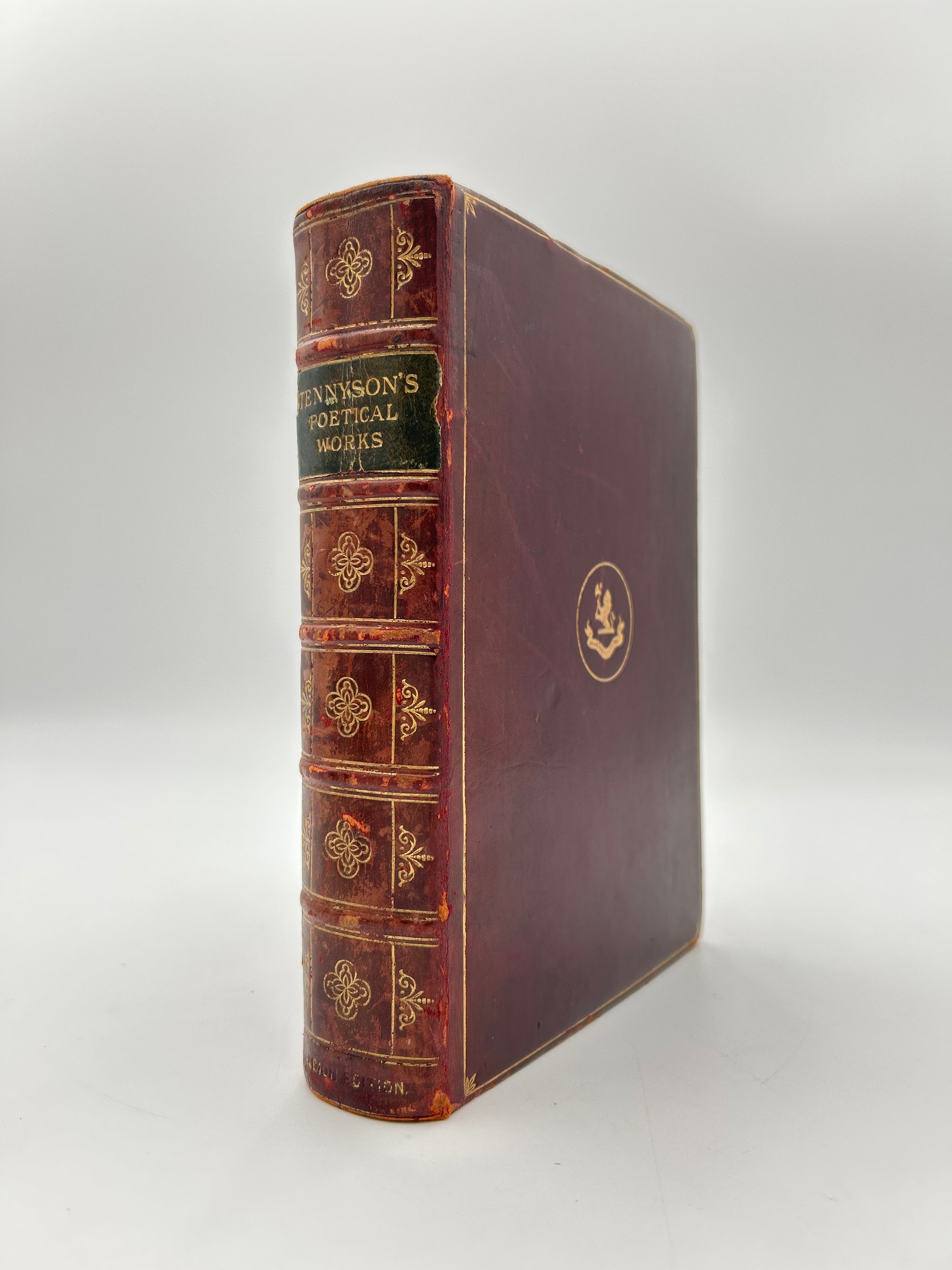 Bound in smooth, red leather, raised bands, green leather in title section of spine, red and green sewn endbands, marbled paste downs/end papers, gold & red edged textblock (different color based on angle), gold tooled emblem on front with lion and banner inside a circle and gold around edges of cover, gold titling and decorations on spine, and on inside edges of cover, pictorial illustration of Tennyson at front