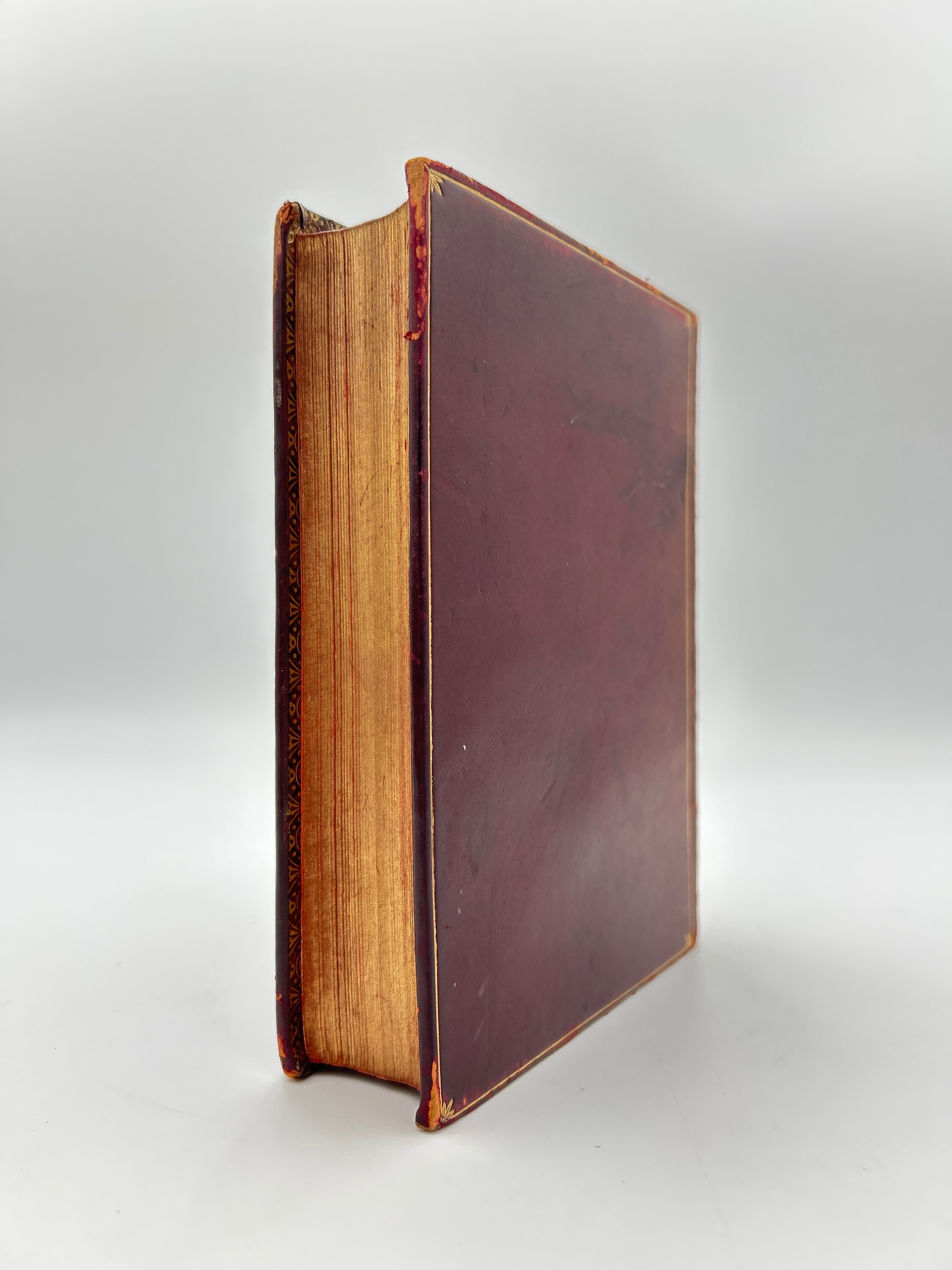 Leather on spine slightly sun bleached, worn at corners, along head and tail of spine, on some raised bands, and some cover edges, a few dents on front and back, a discolored area on back, with minimal scratches otherwise, some threads worn away from headband, inside gutters of both front & back cover seem to be opening a bit, textblock, intact with minimal wear.