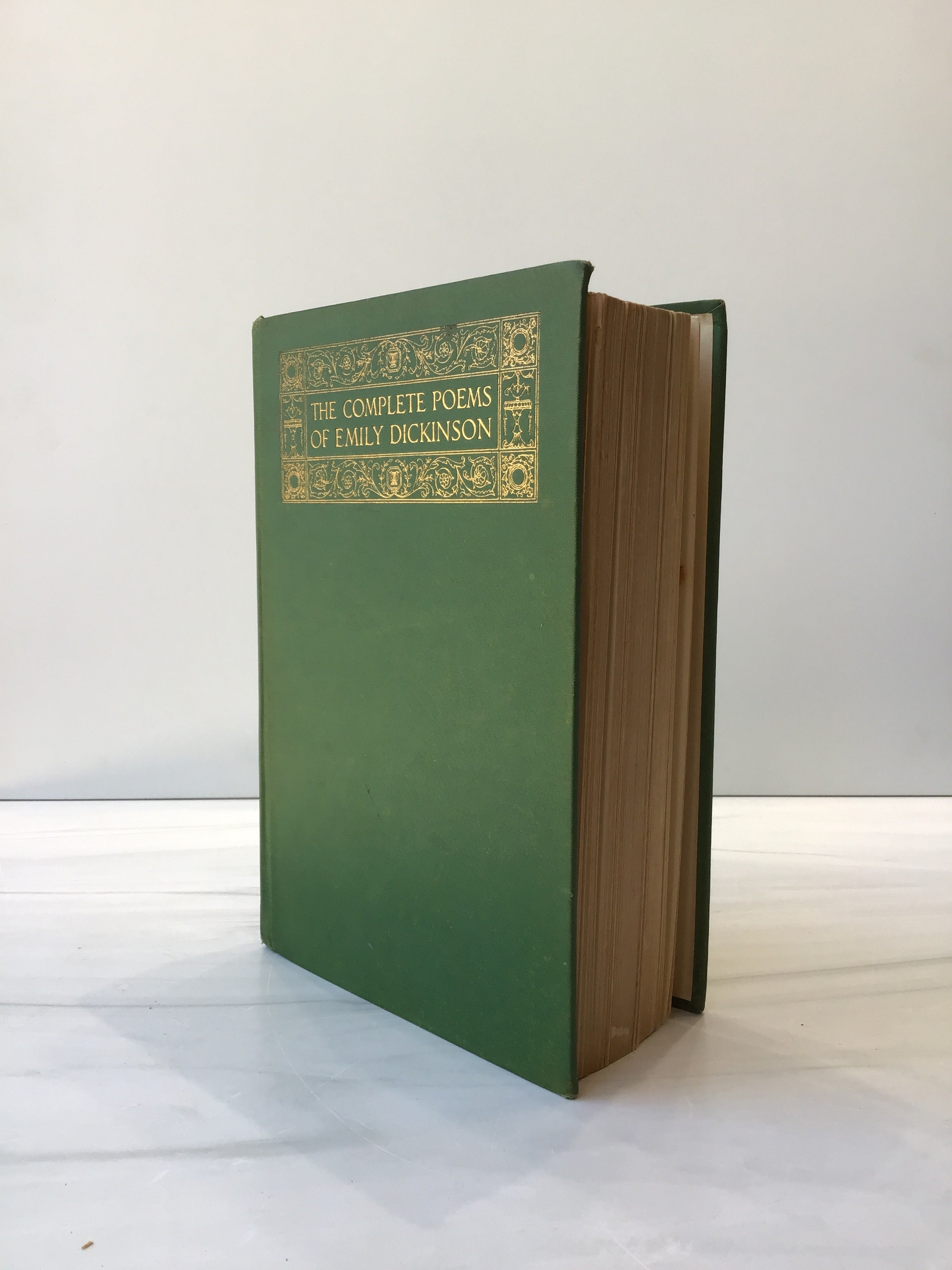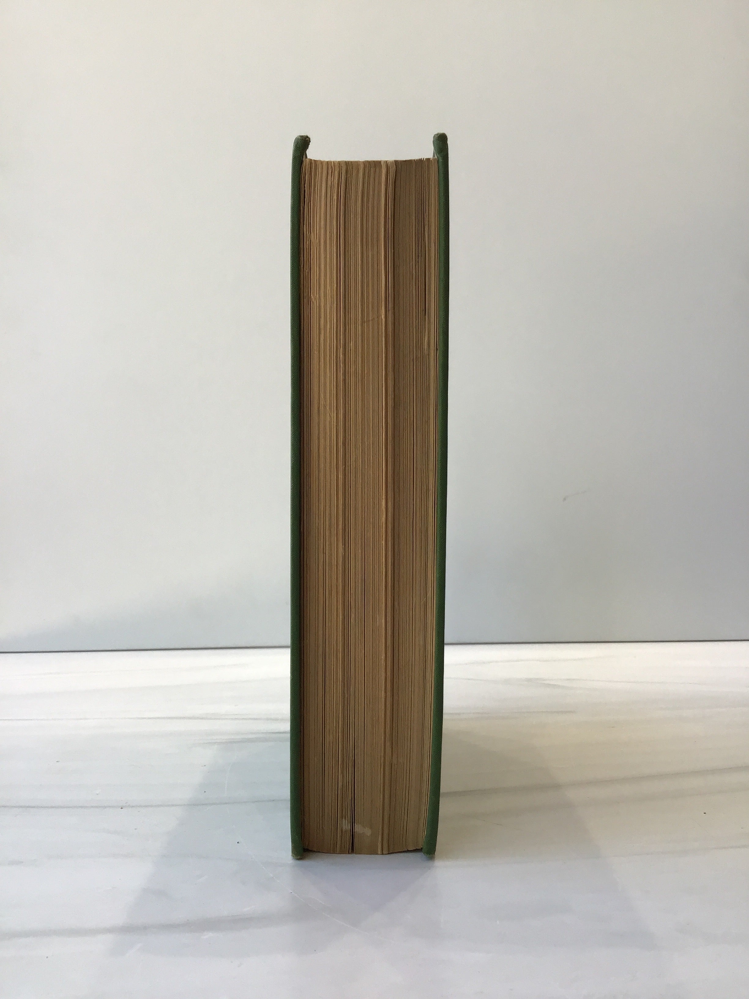 Green hardbound binding with gold tooling on front board, some beginning of detach on inside cover, fading on spine, gold top edge, intact, good condition.