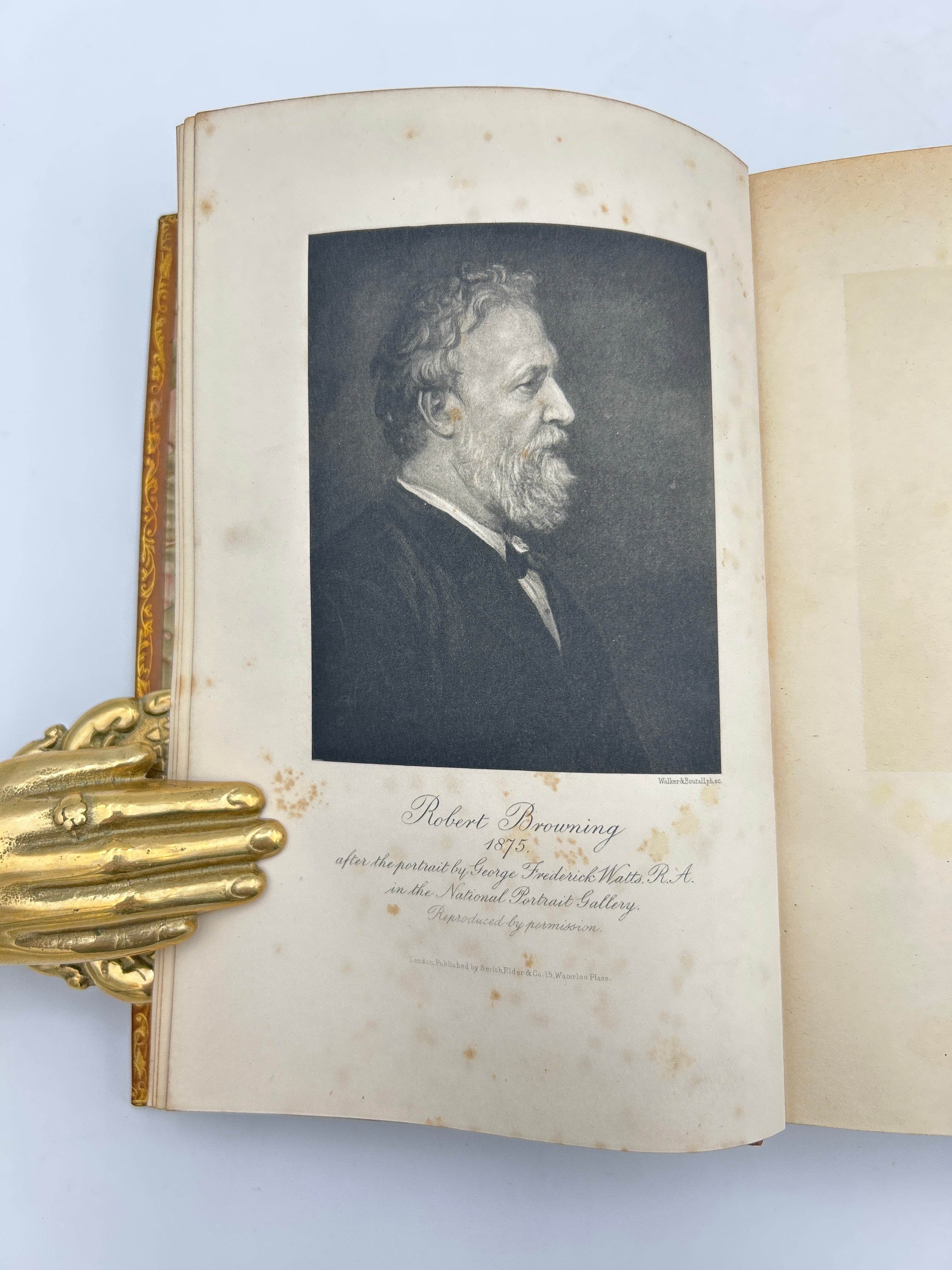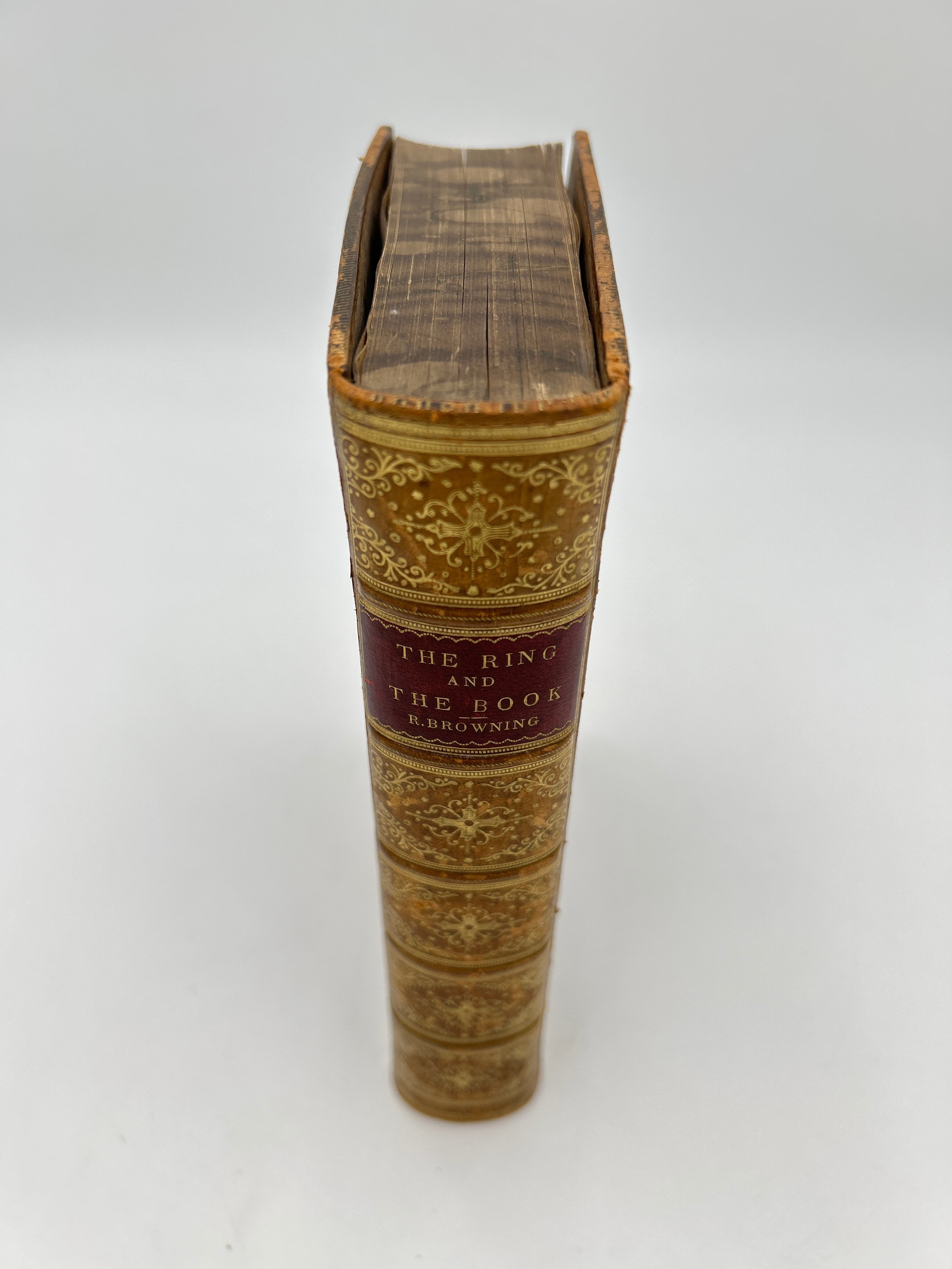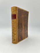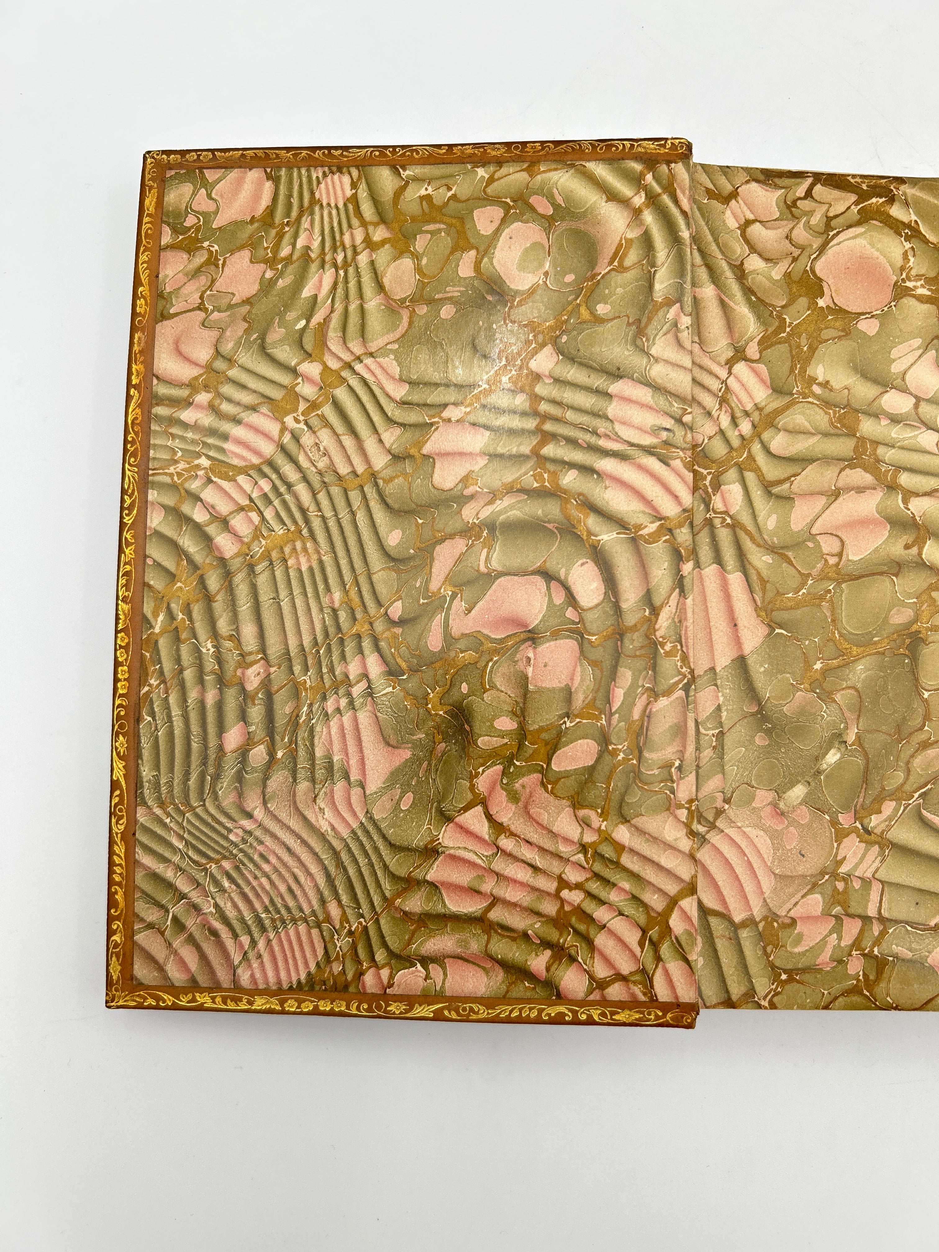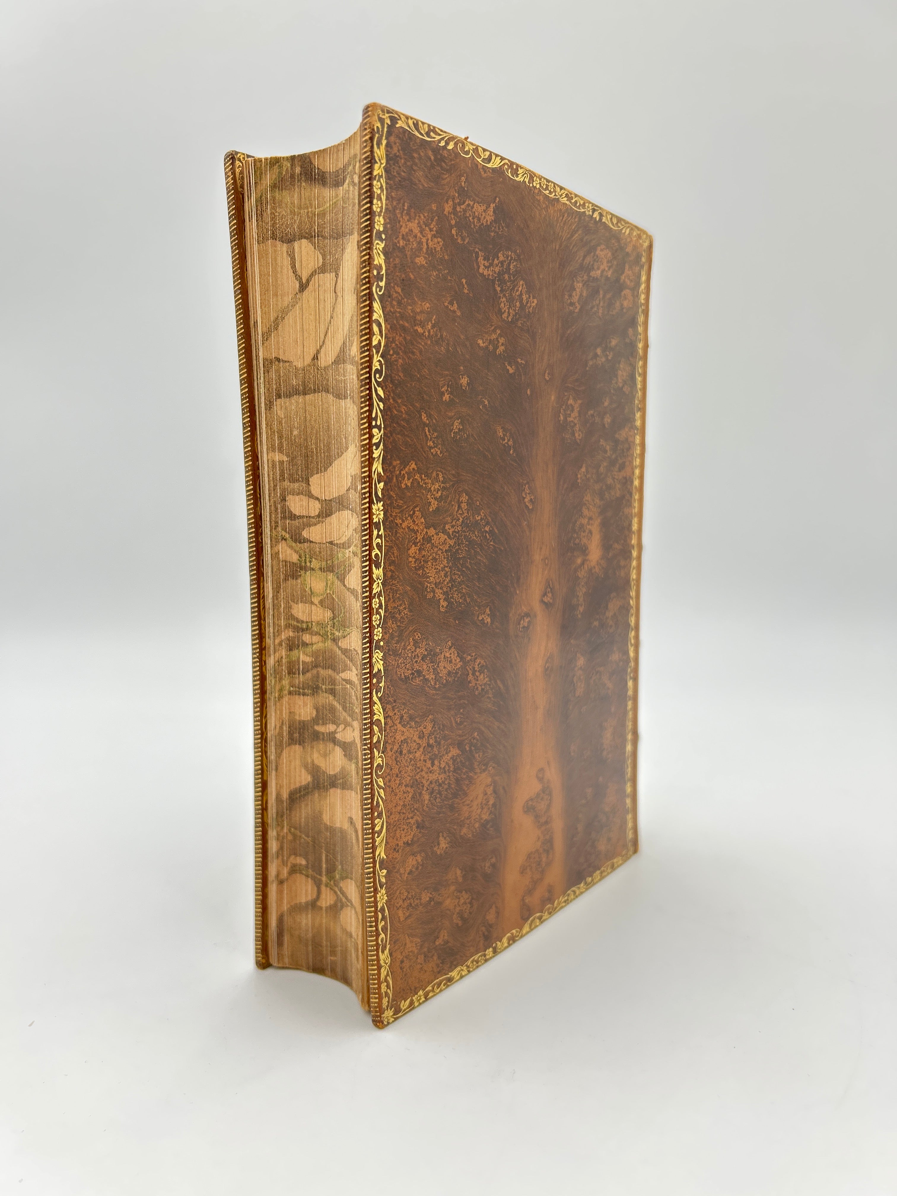 Brown tree bark leather, Presentation copy with gold trim on front and back cover, burgundy label with gold lettering, three edge marbling , very good condition