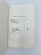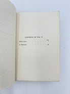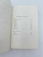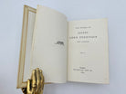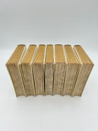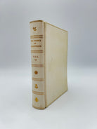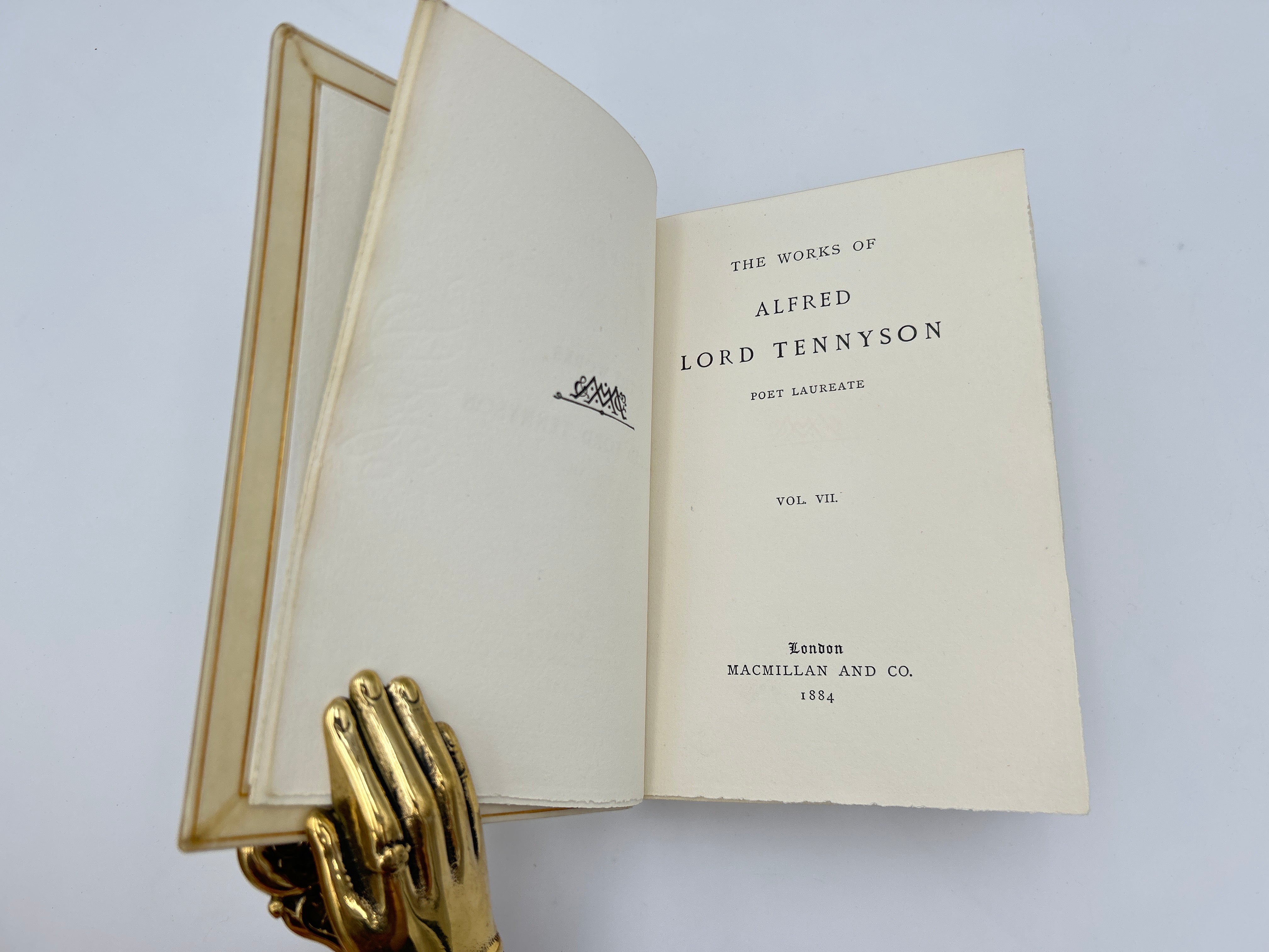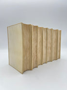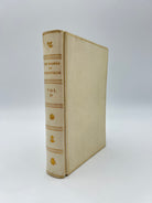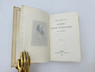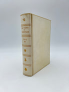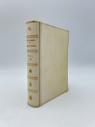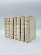 White covered hard back boards with gilt boarder on the upper and lower boards. Gilt embossed turn ins and lettering on the spine in second and third compartments. Gilt embossed designs in each of the other compartments, a dove with an olive branch in the first, a flower in the fourth, lyre in the fifth, and torch with a bow and two arrows in the sixth of each volume. Gilt top edge. Flawless condition.