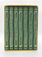 Seven volumes in green cloth binding with gilt design and lettering on upper board with titles in gilt on a banner on spine. Gold slipcase with maps to either end of the Narnia realm. Each bool illustrated. Like new.