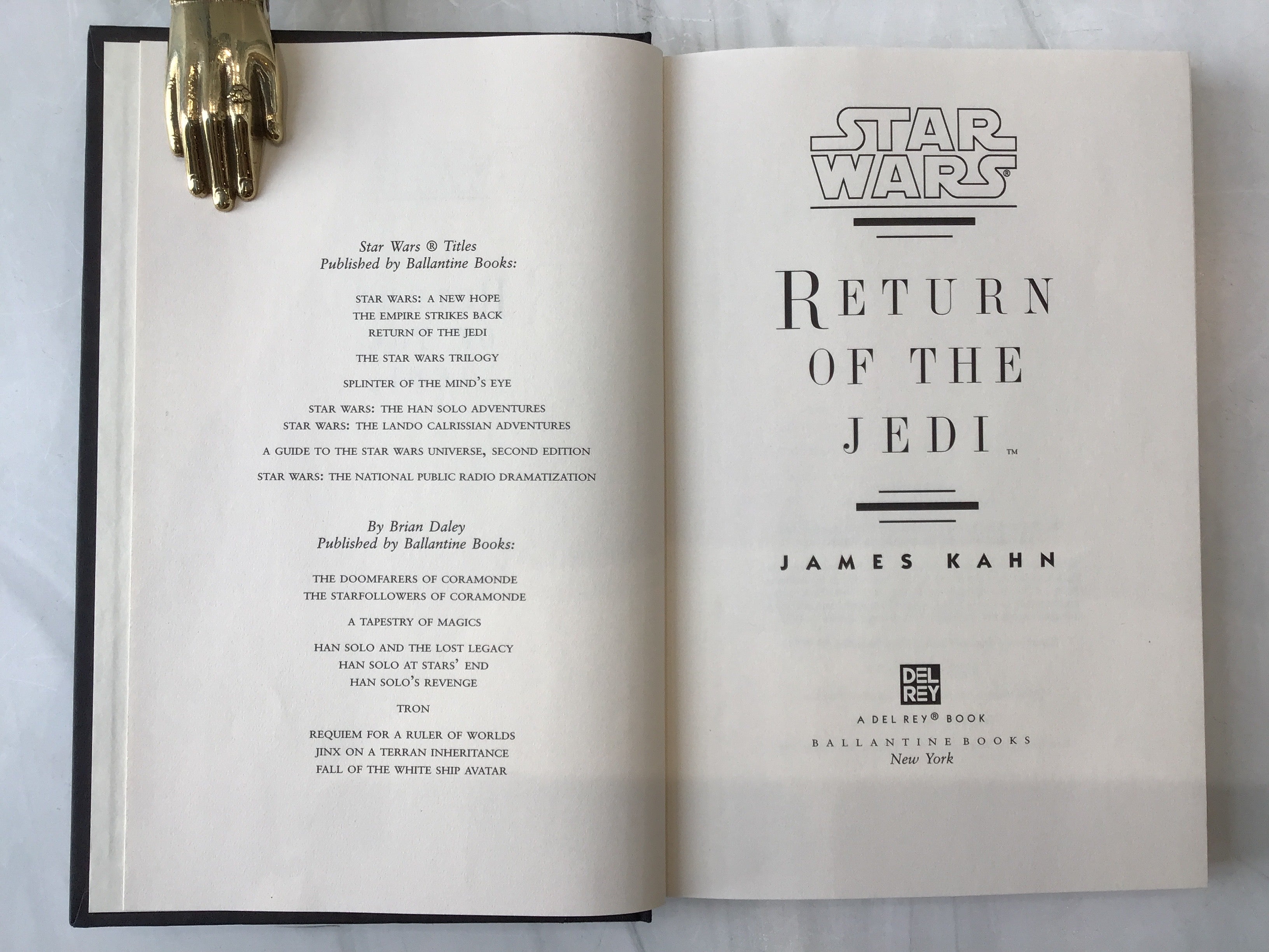 Black hardcover with gold lettering on the spine and black dust jacket with maroon lettering and an illustration of Yoda on most of the jacket cover. General fading to the dust jacket from age and in excellent condition overall.