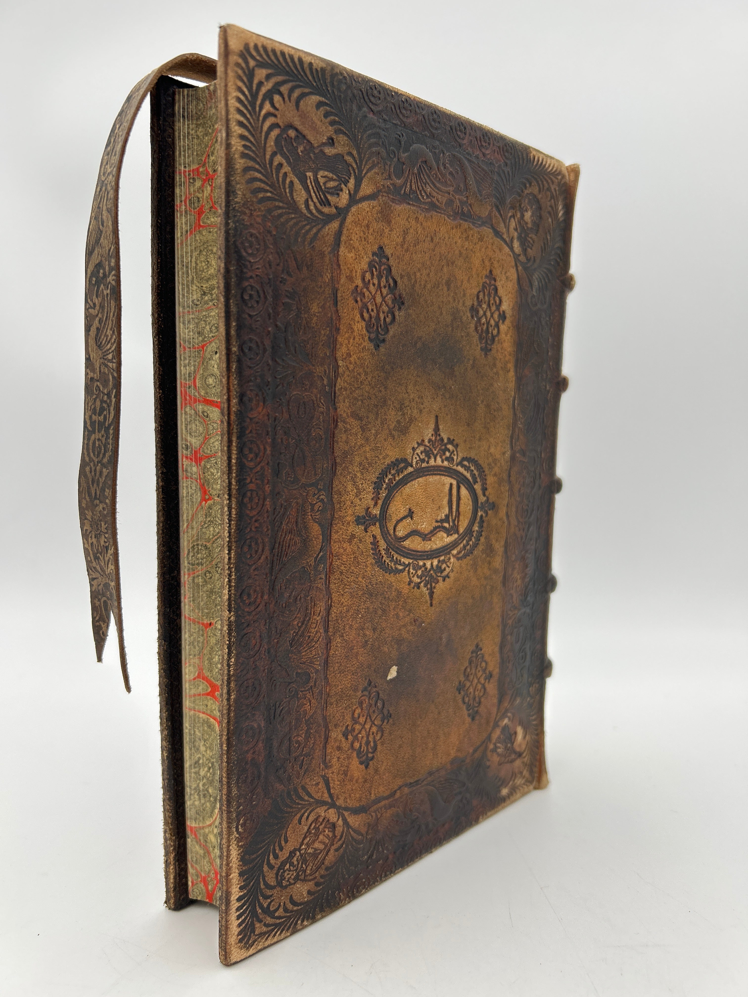 Highly embossed including covers, spine, interior of covers, and leather ribbon bookmark, this edition is specially designed and bound for Moon's Rare Books in Italy. Unique red marbled endpapers with hand done green marbling on edges of the book. Inlaid circular illustration on the upper board. Five raised bands and gilt lettering on the spine. Hand made map on interior as well.