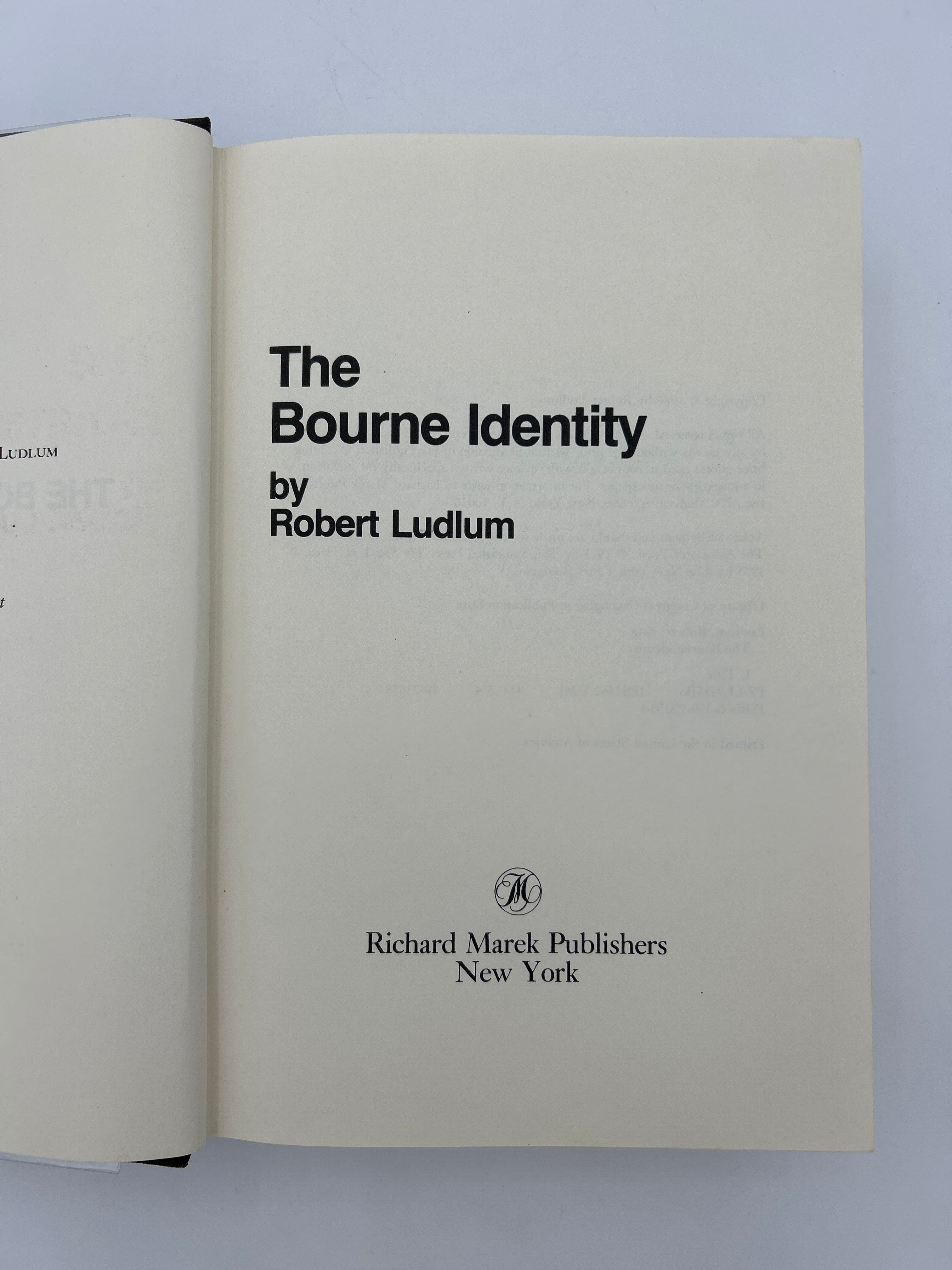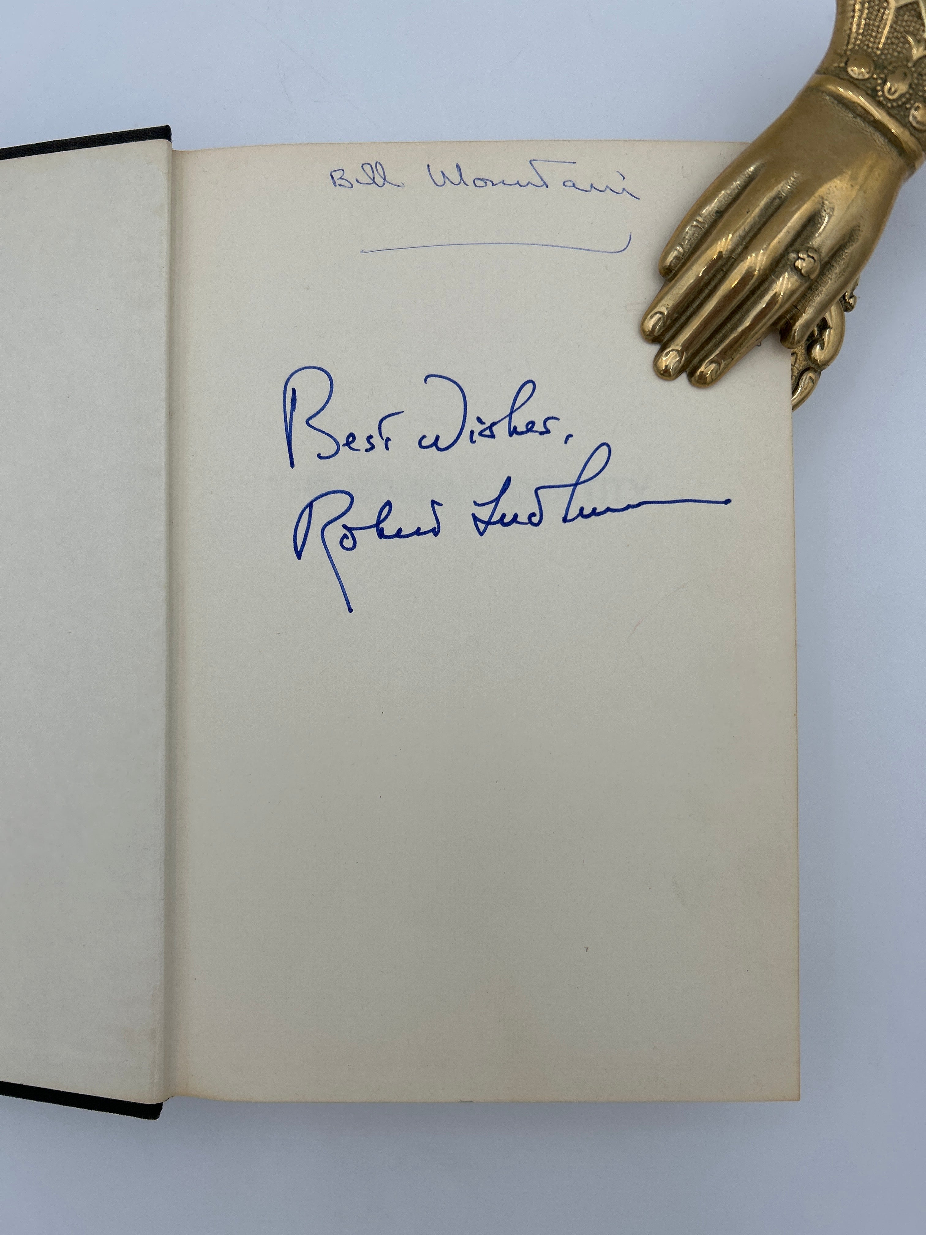 Black canvas binding with gilt lettering on the spine. Original pictorial dust jacket. Inscription on preliminary endpaper “Best wishes, Robert Ludlum.” Fine condition overall.