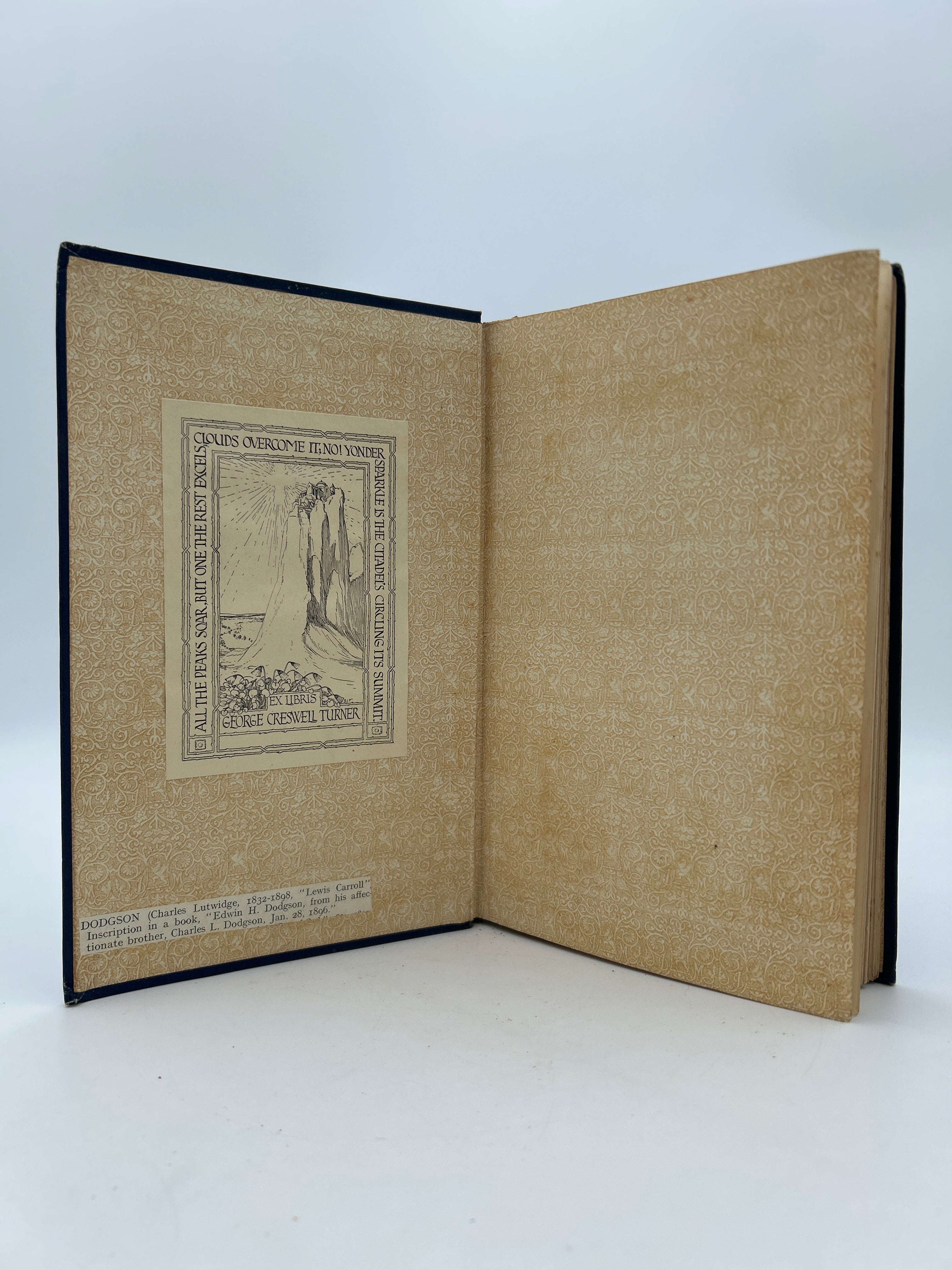 Deep blue cloth binding with gilt lettering on the spine. Bookplate for a George Creswell Turner adhered to inner cover. Some fraying to upper and lower spine and bumped corners. Minimal scuffing to upper board. Inscription of Charles Lutwidge Dodgson aka Lewis Carroll reading “ Edwin H. Dodgson, from his affectionate brother, Charles L. Dodgson, Jan 28 1896”. Fine condition overall.