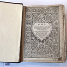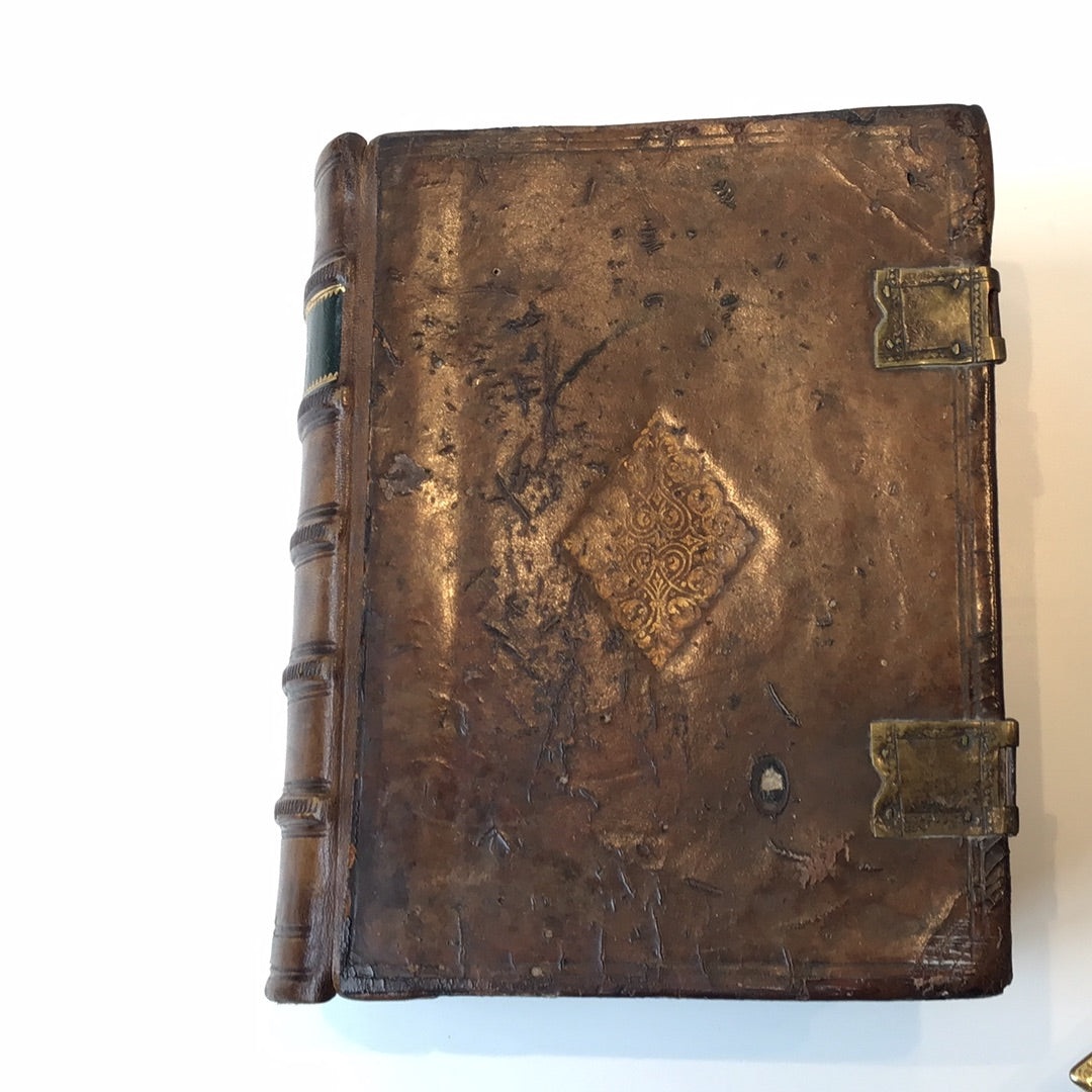 Brown leather binding with gold tooled diamond on cover. Originally clasps, but only the attachment is remaining. Original covers, woodcuts only on title page, spine has been replaced.