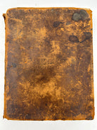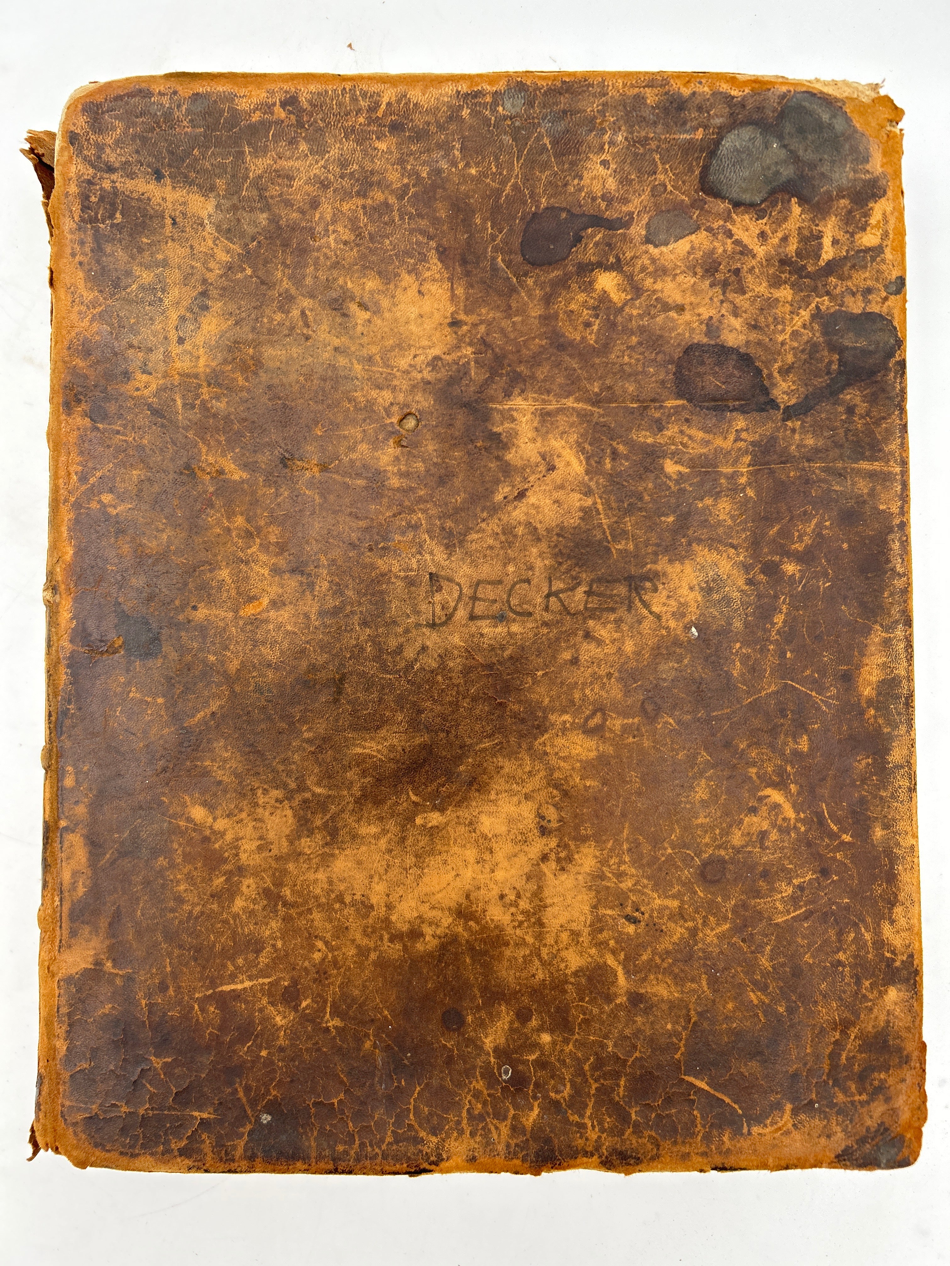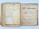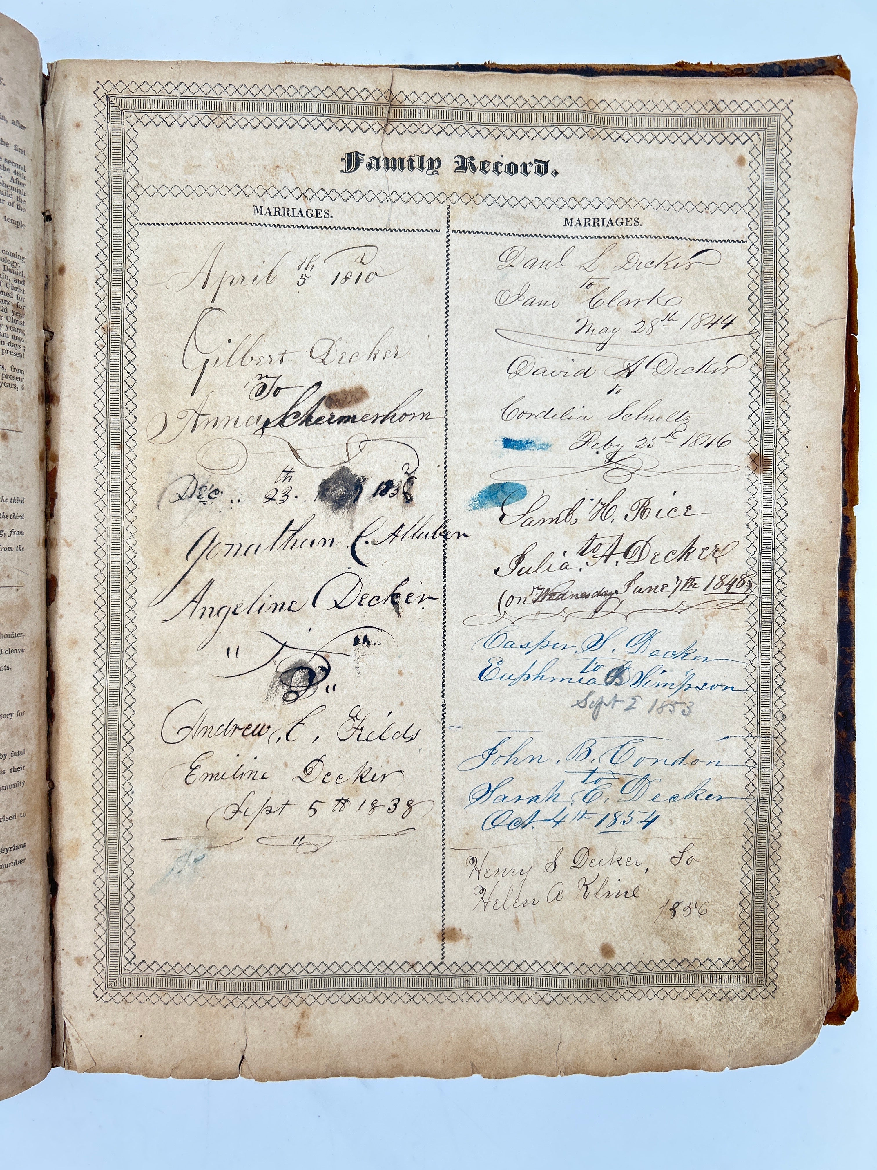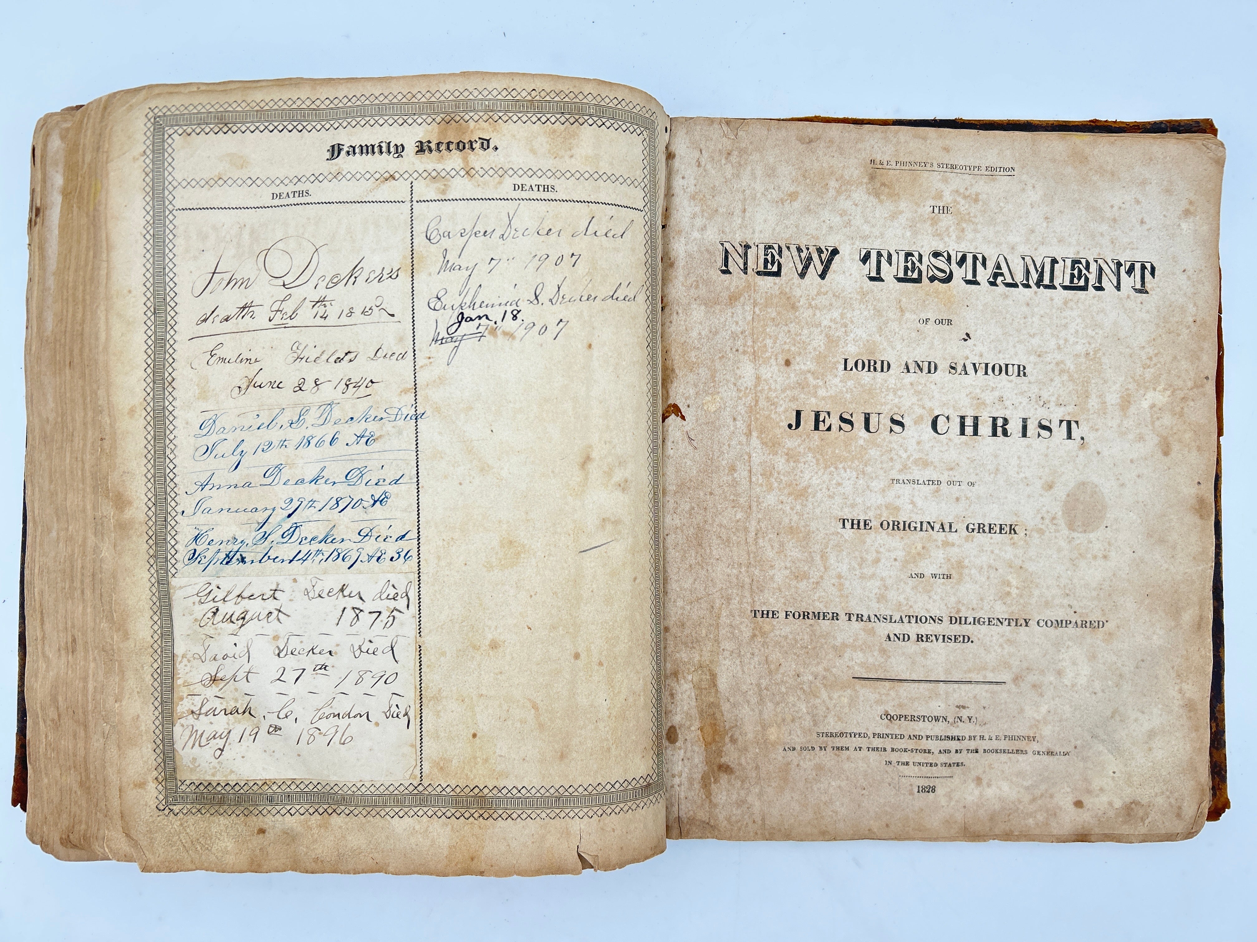 Printed in Cooperstown New York. Brown leather with embossing. Lots of scuffing and wear to leather boards, head and foot of spine, and corners. Five raised bands with black leather label rubbed through. Family related ephemera loosely inserted in front cover. First few pages missing including title page torn from Old Testament. “Decker” to upper board. Foxing throughout. Filled in Family Record pages. No apocrypha. Fair condition.