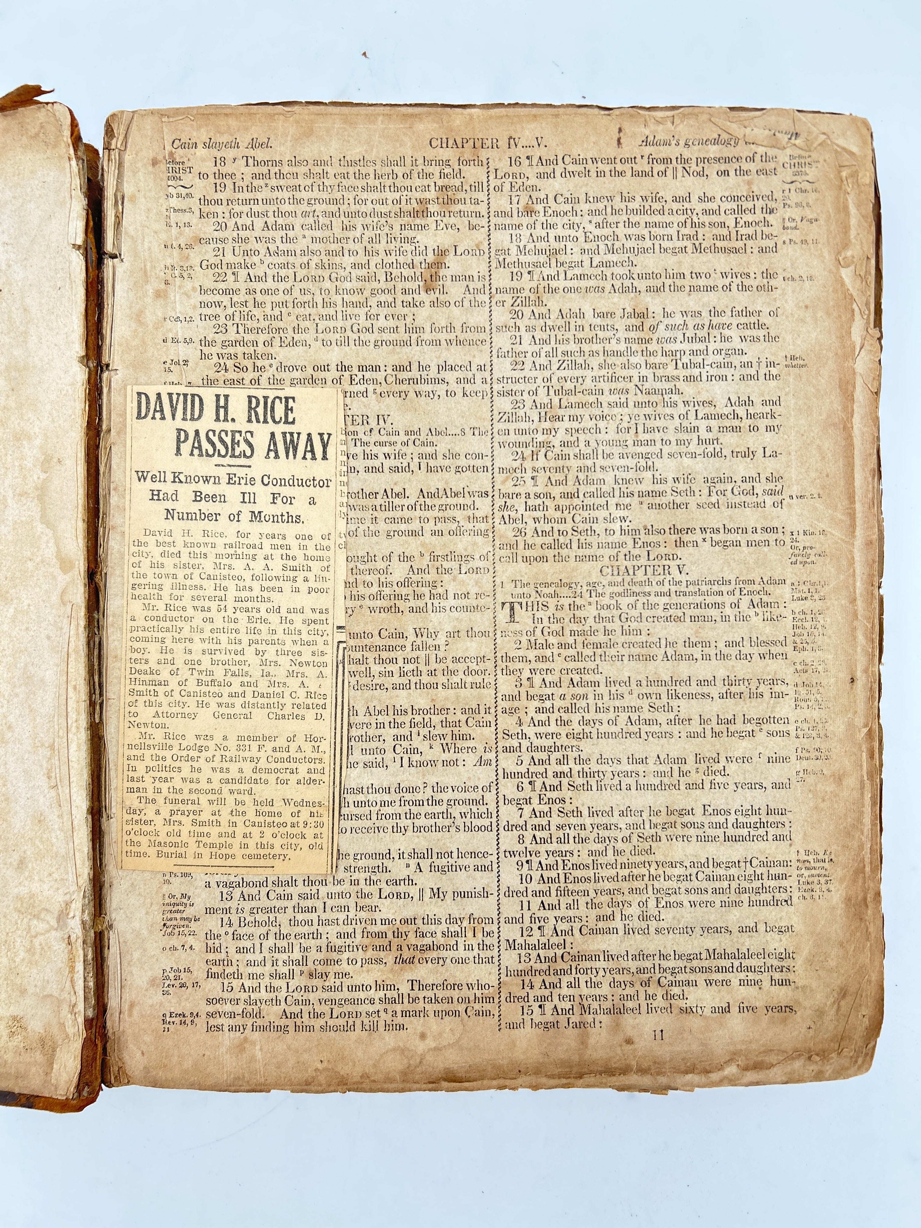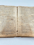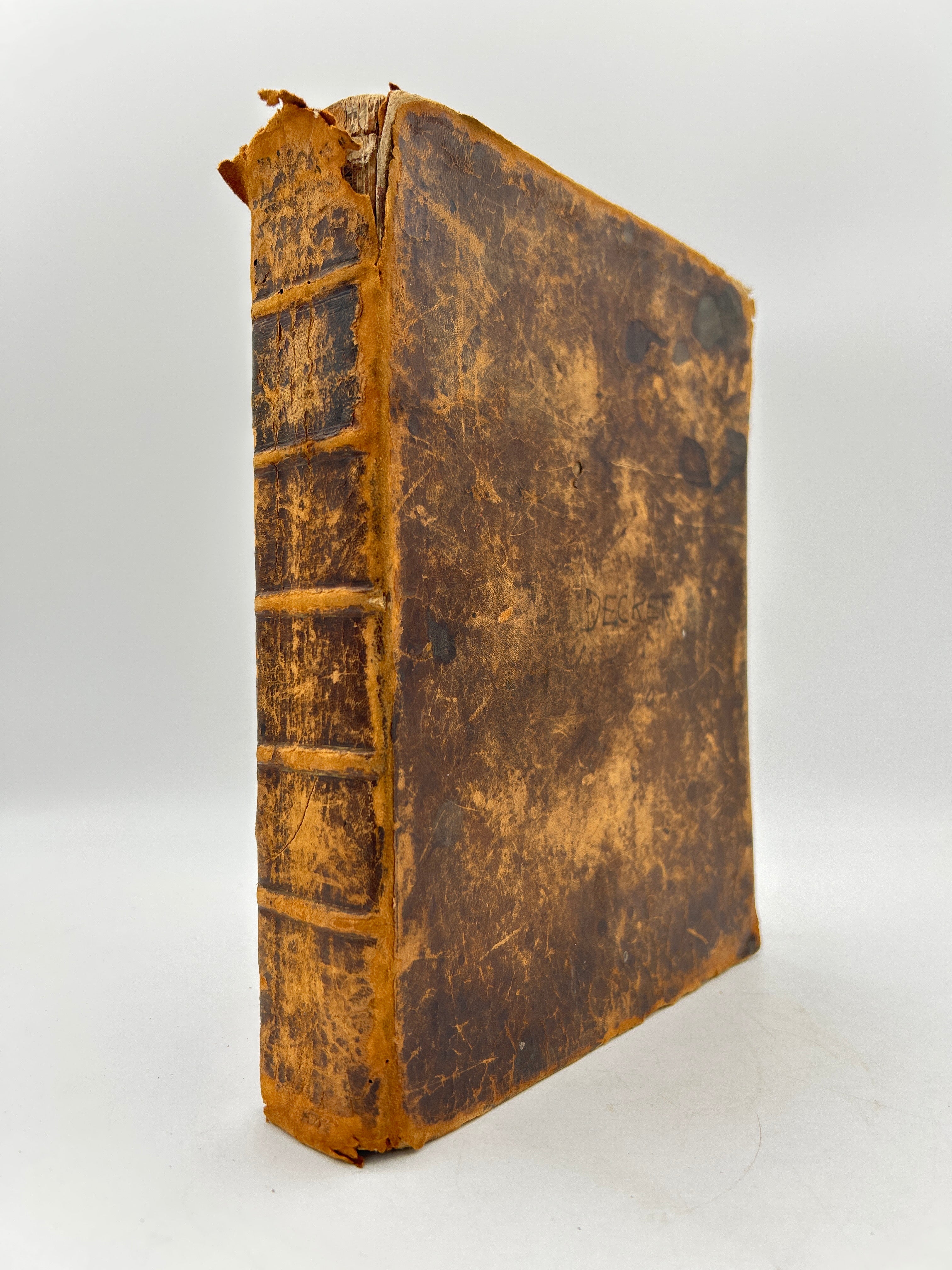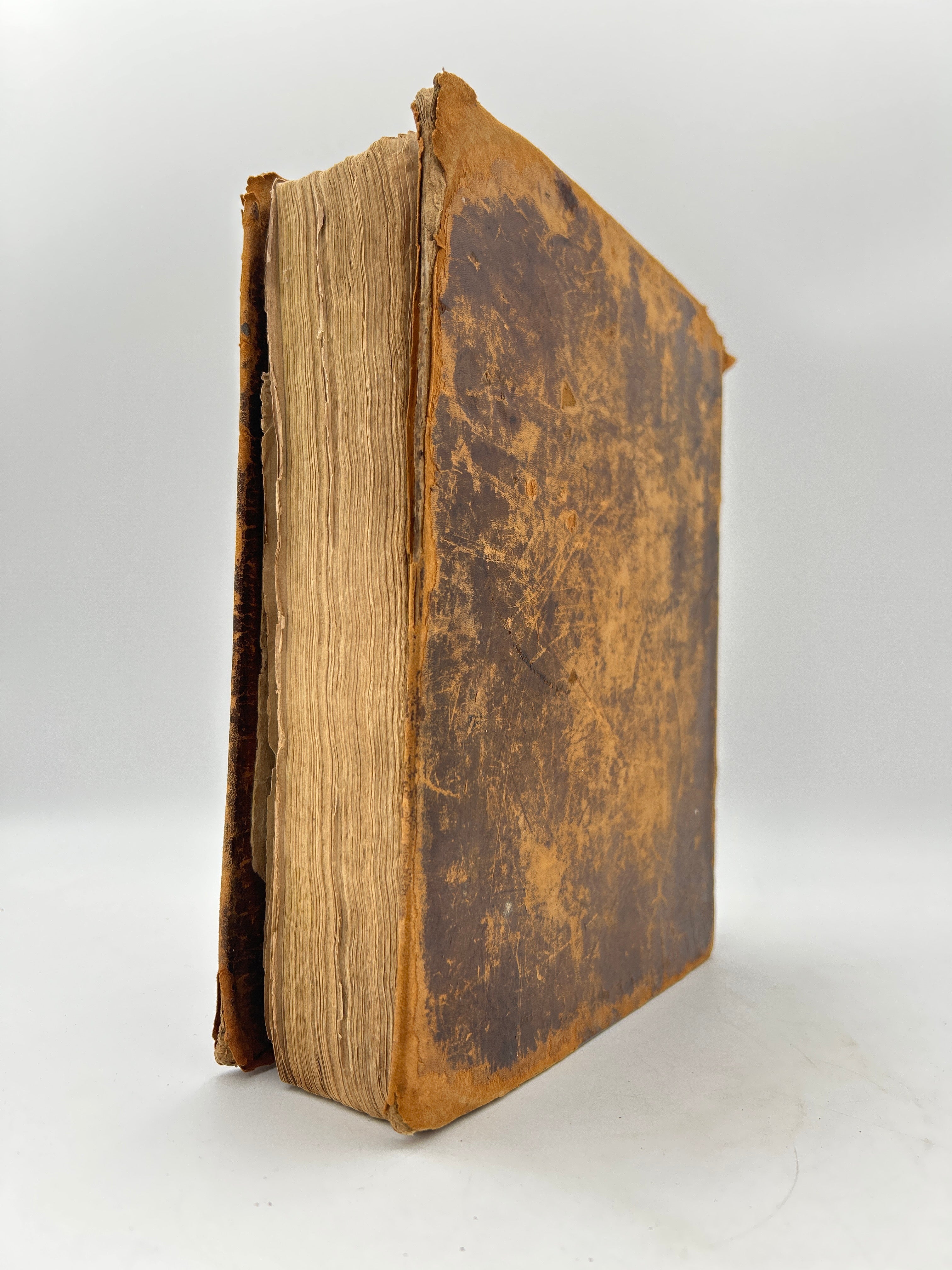 Printed in Cooperstown New York. Brown leather with embossing. Lots of scuffing and wear to leather boards, head and foot of spine, and corners. Five raised bands with black leather label rubbed through. Family related ephemera loosely inserted in front cover. First few pages missing including title page torn from Old Testament. “Decker” to upper board. Foxing throughout. Filled in Family Record pages. No apocrypha. Fair condition.