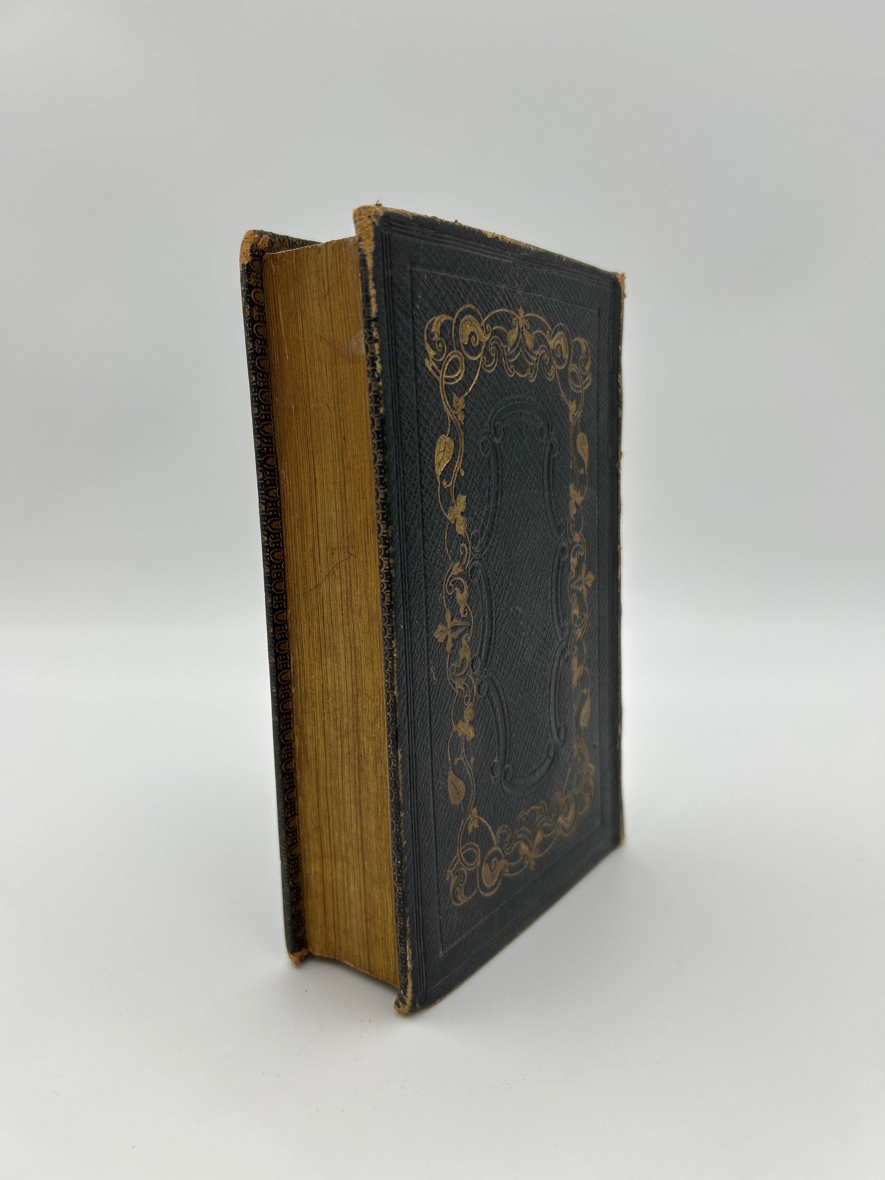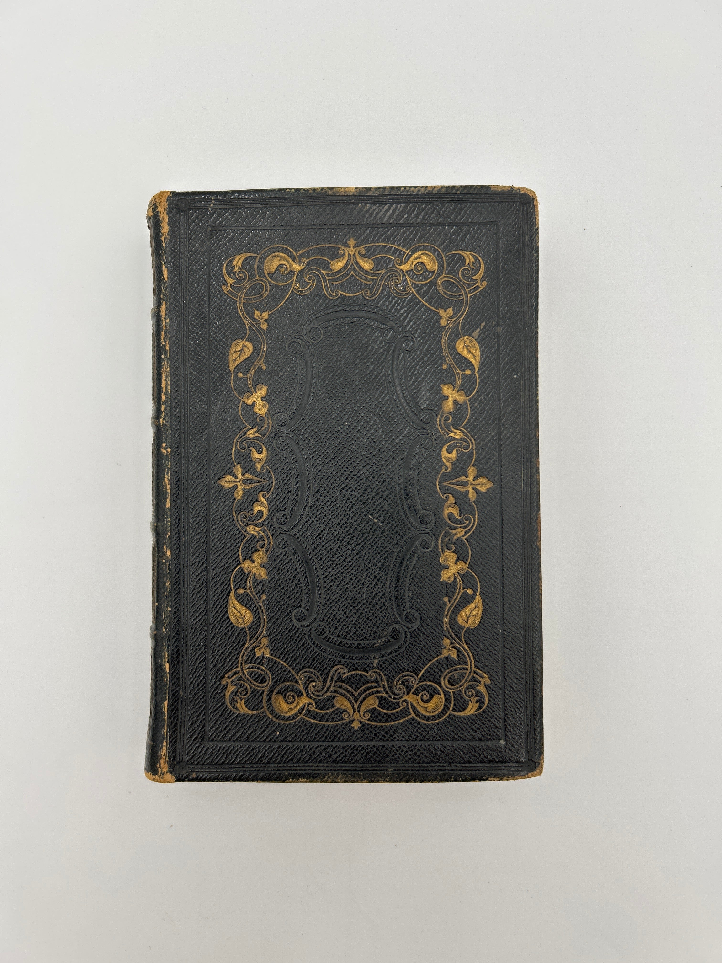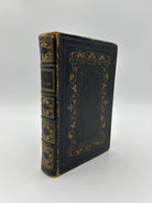 Full pebbled leather black binding with gilt decoration on the boards and spine. Four raised bands. Rubbing down of the leather to the brown beneath along the spine and corners, Bumping to the corners. Gilt edges. Fine condition.