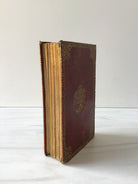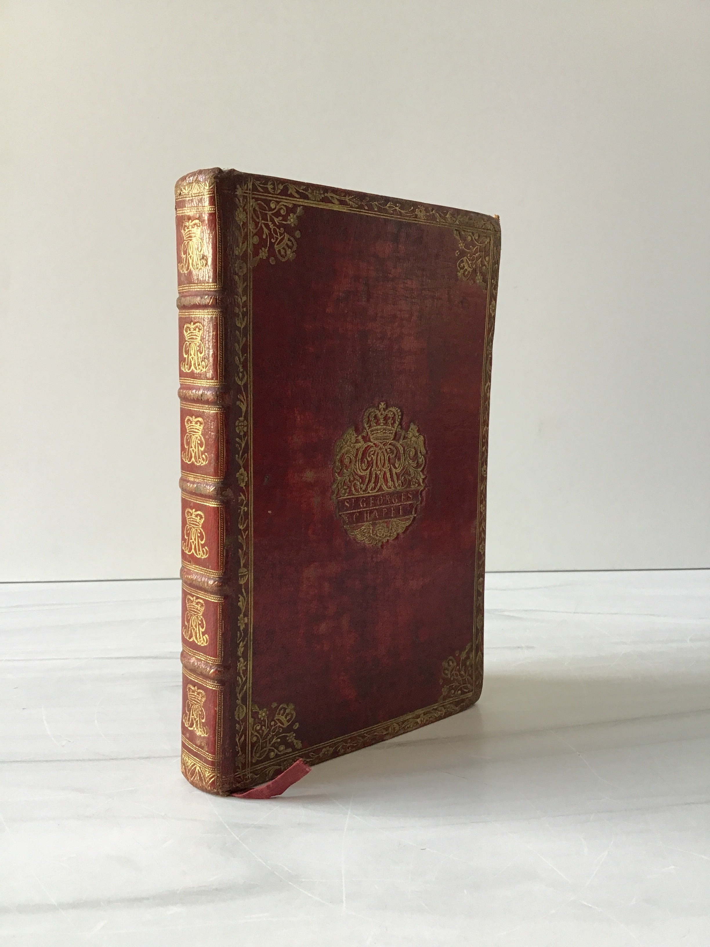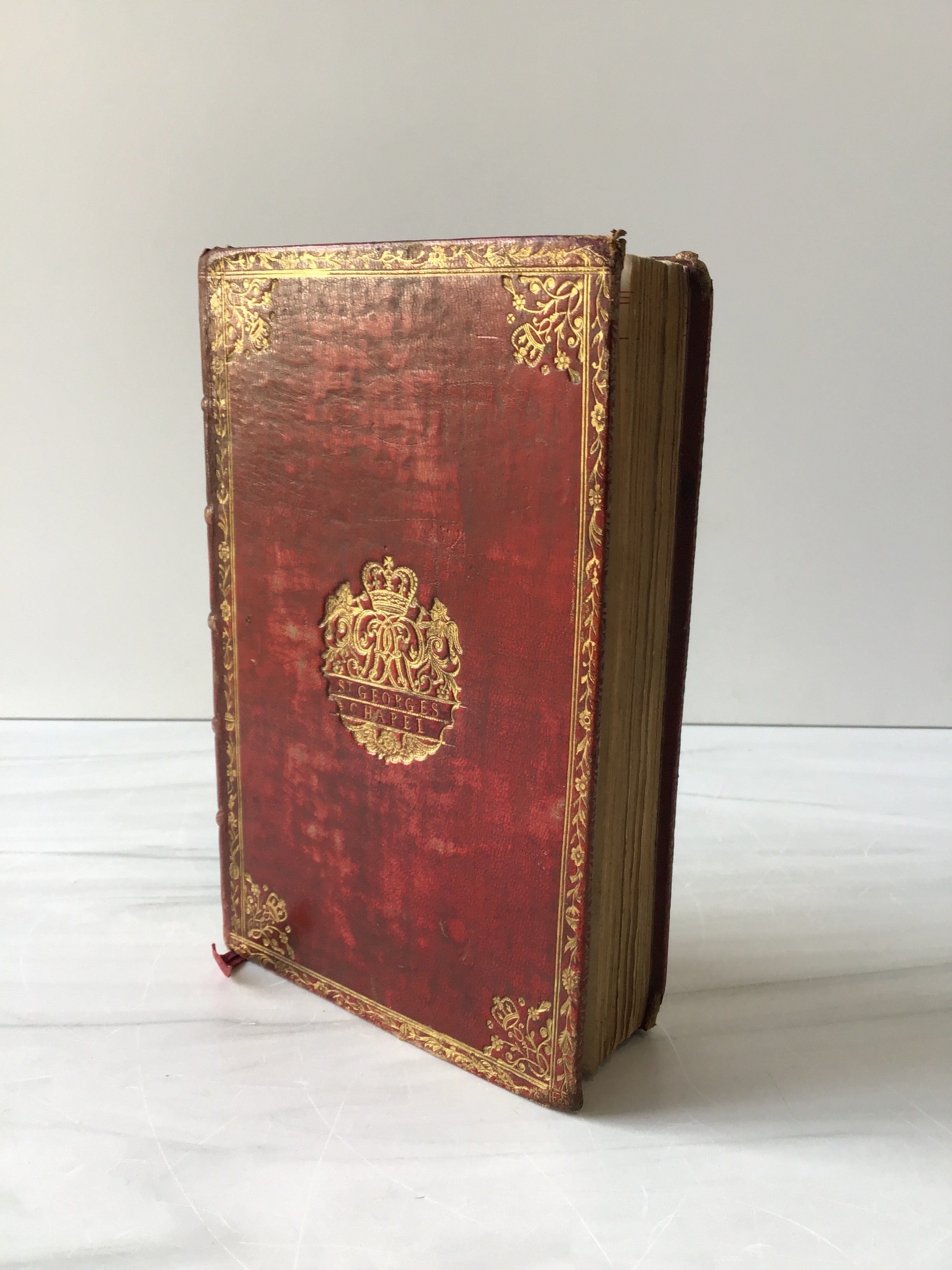 Red Morocco binding, marbled end papers. A monogram of George III, "G.R." flanded by tow trumpet playing angels and surmounted by a crown, each page red lined, intact, good condition.