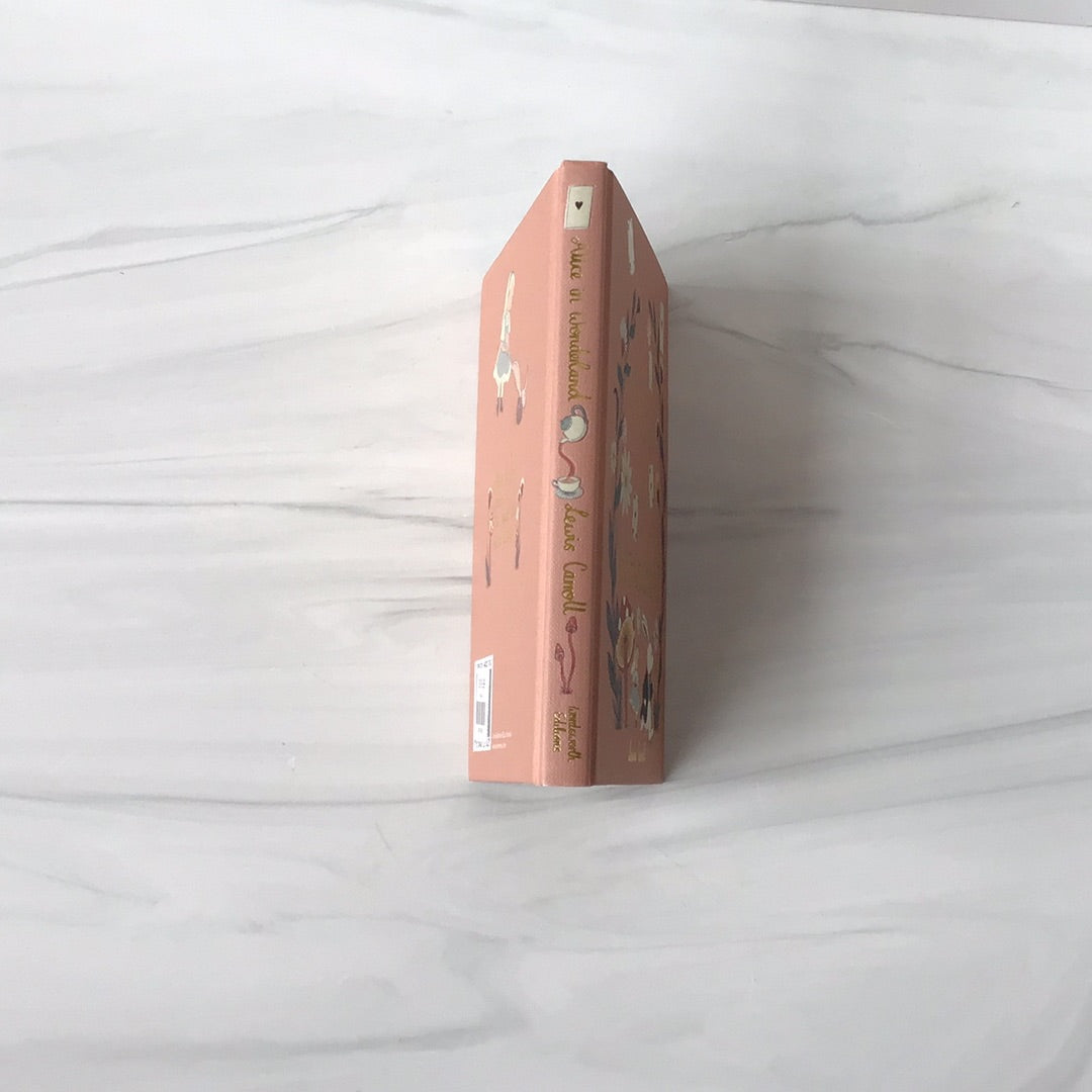 Modern, illustrated printing of Lewis Carroll's "Alice in Wonderland", pink cloth binding, illustration on the front and back covers, gold lettering on front, spine and quote on back.