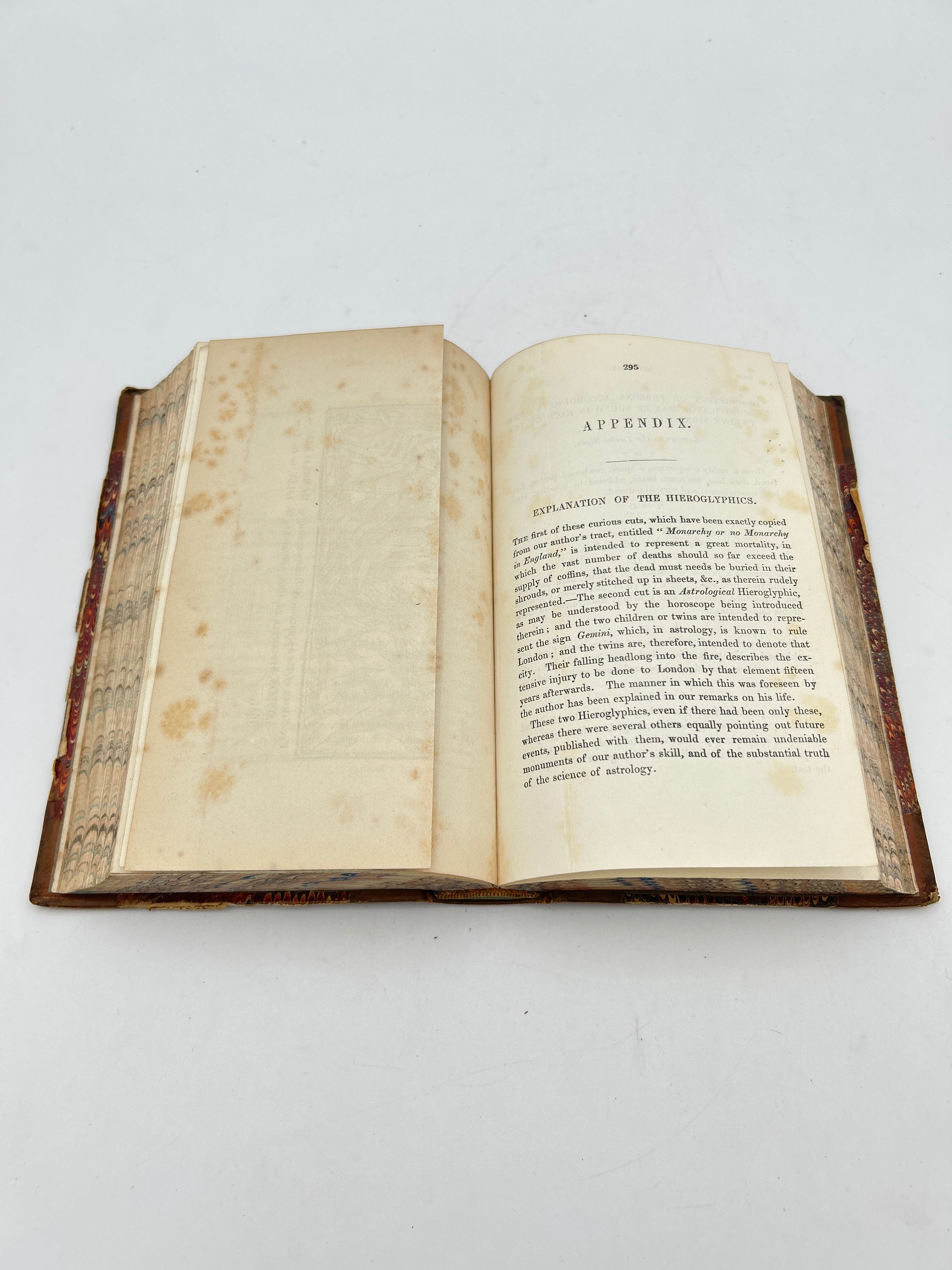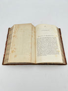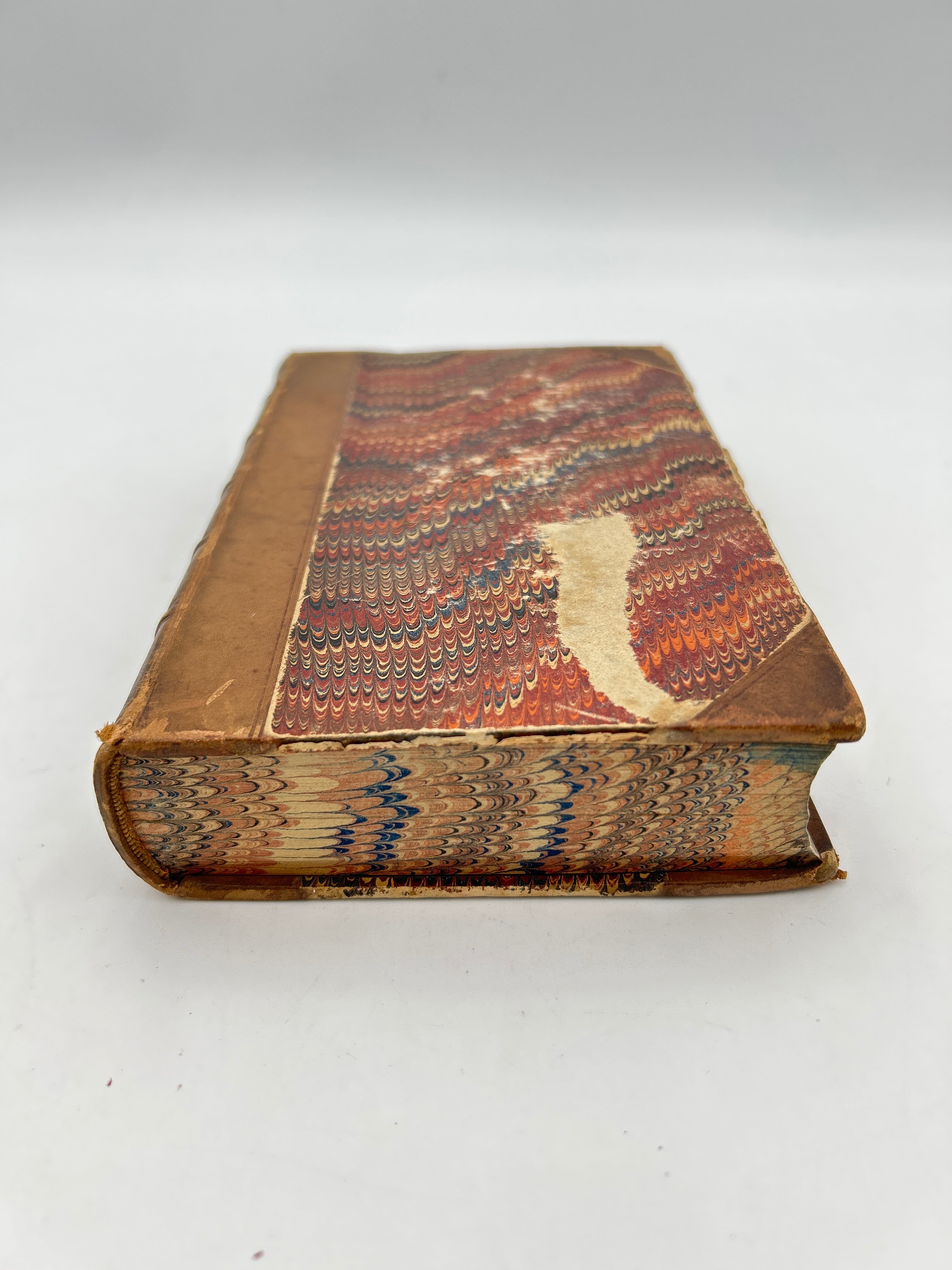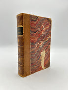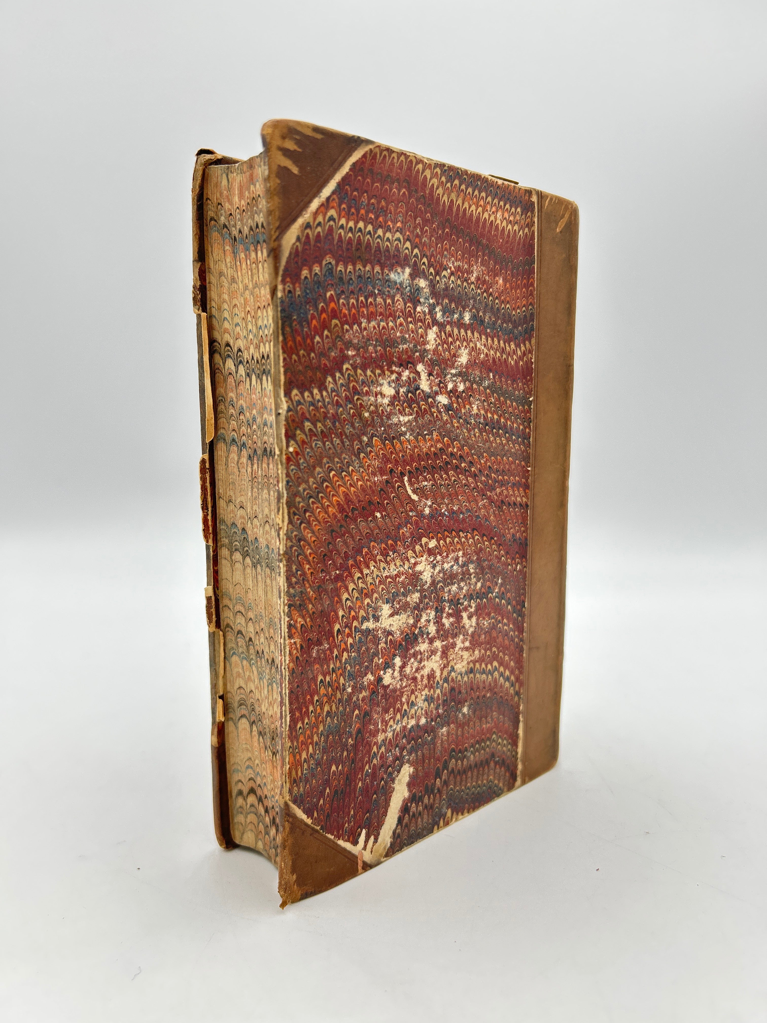 brown 3/4 leather with marbled front and back cover, brown leather spine with raised bands and gold lettering front marble cover has tear on it, and slight chipping on edges, rubbing on back cover. foxing on front and back end papers, and title page, marbling on edges, overall condition is good